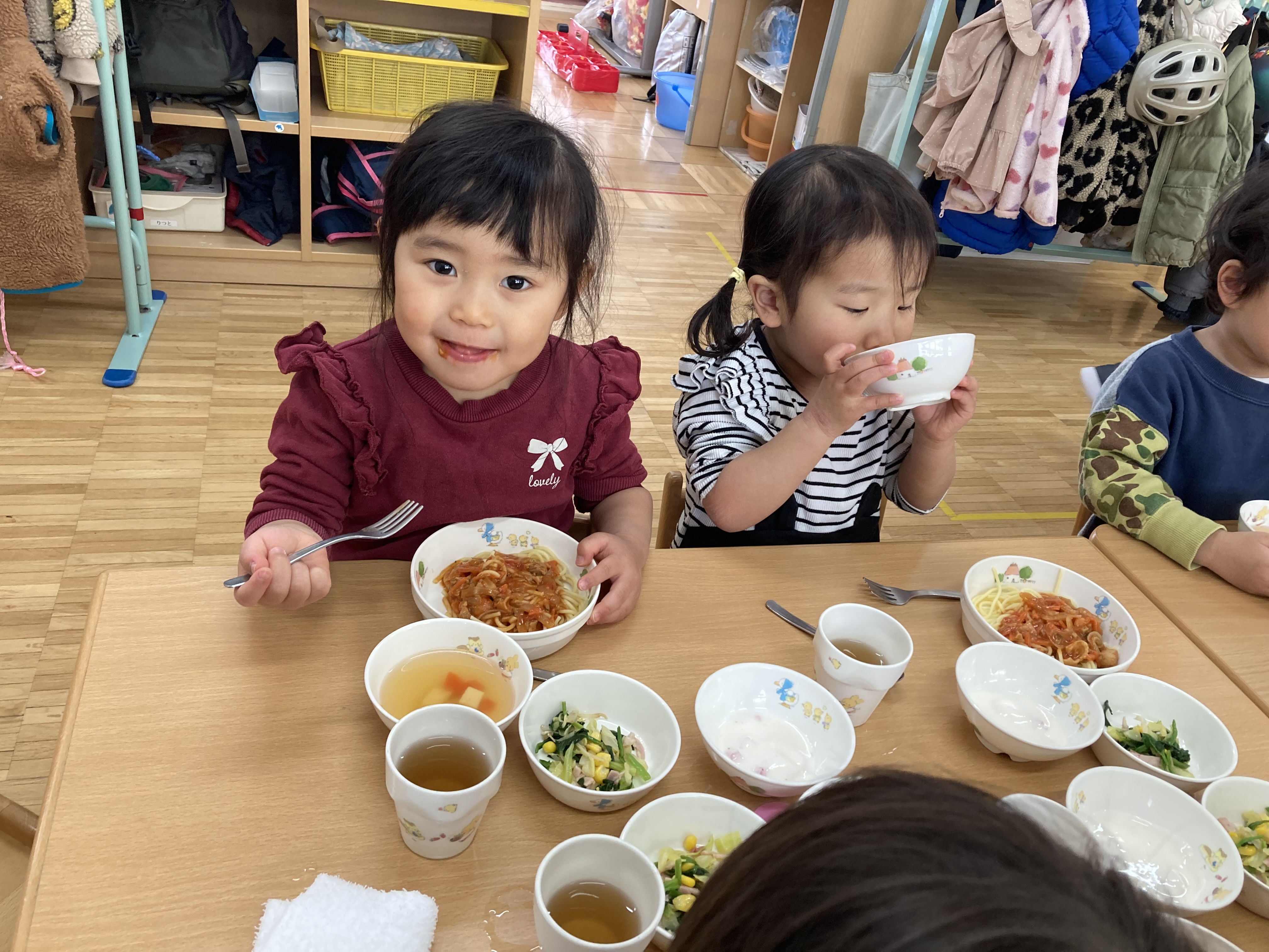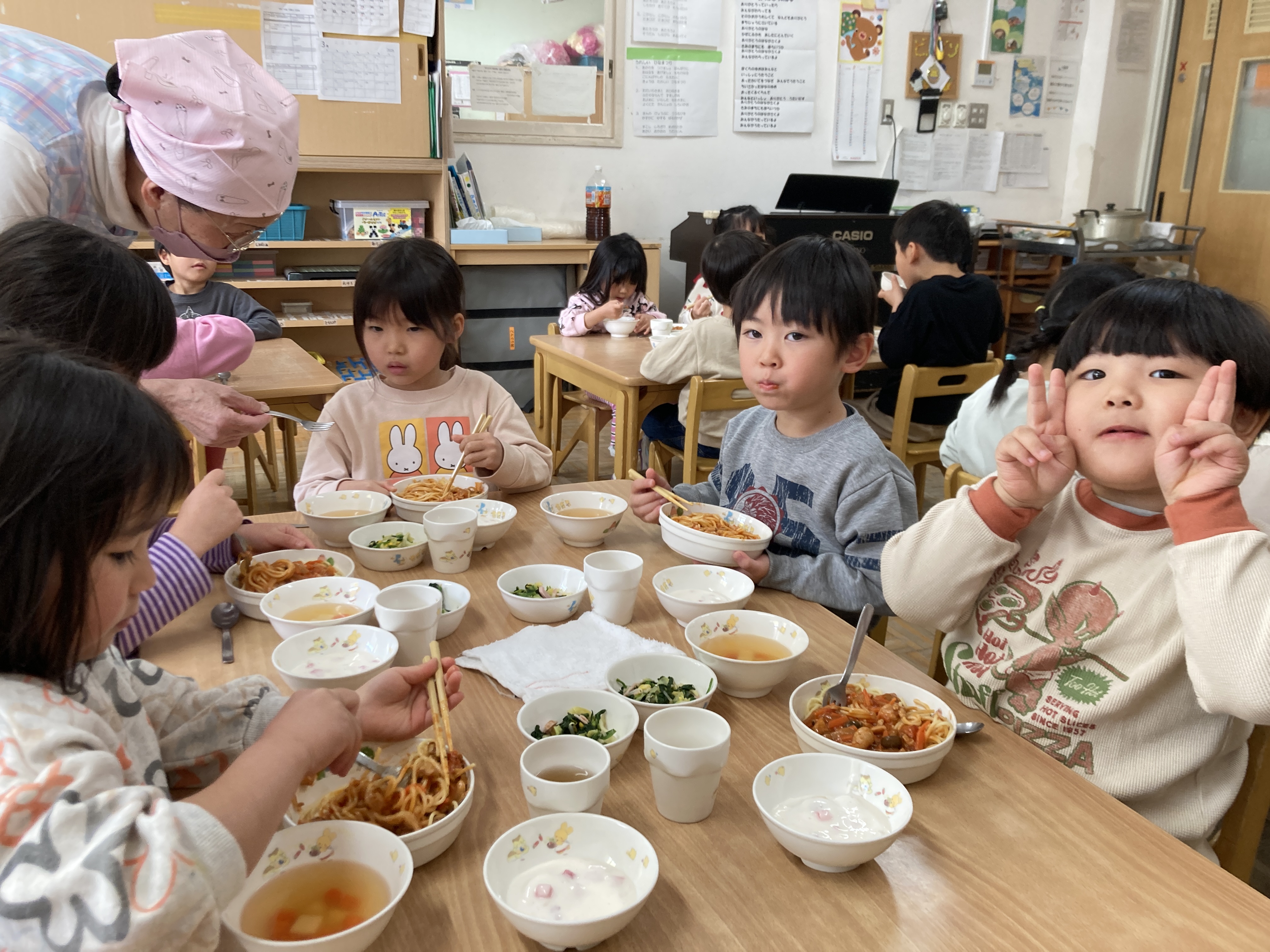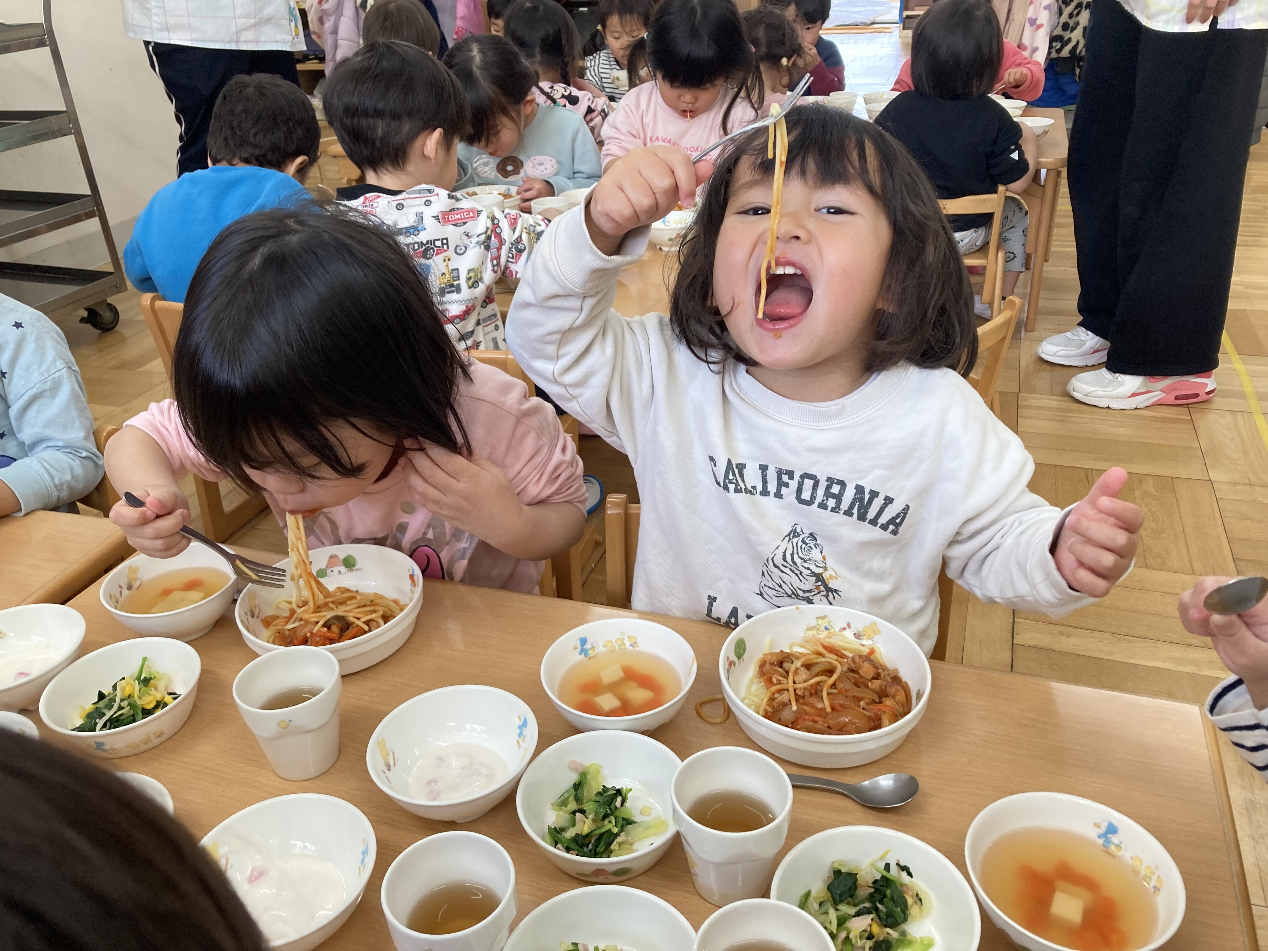 チキンとトマトのパスタは今まであまり出てこなかったメニューなので、子ども達は「おいしそー!!」と嬉しい反応を見せてくれました。