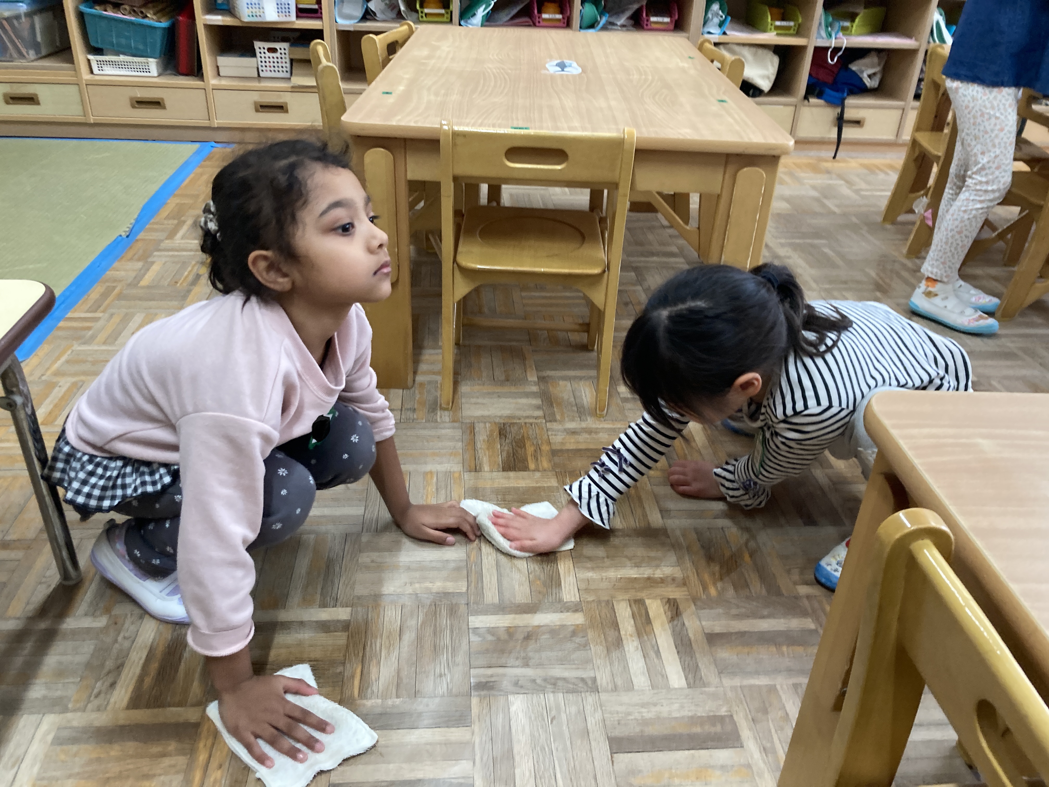 1年間使ったどんぐり組の保育室を、雑巾がけしました。