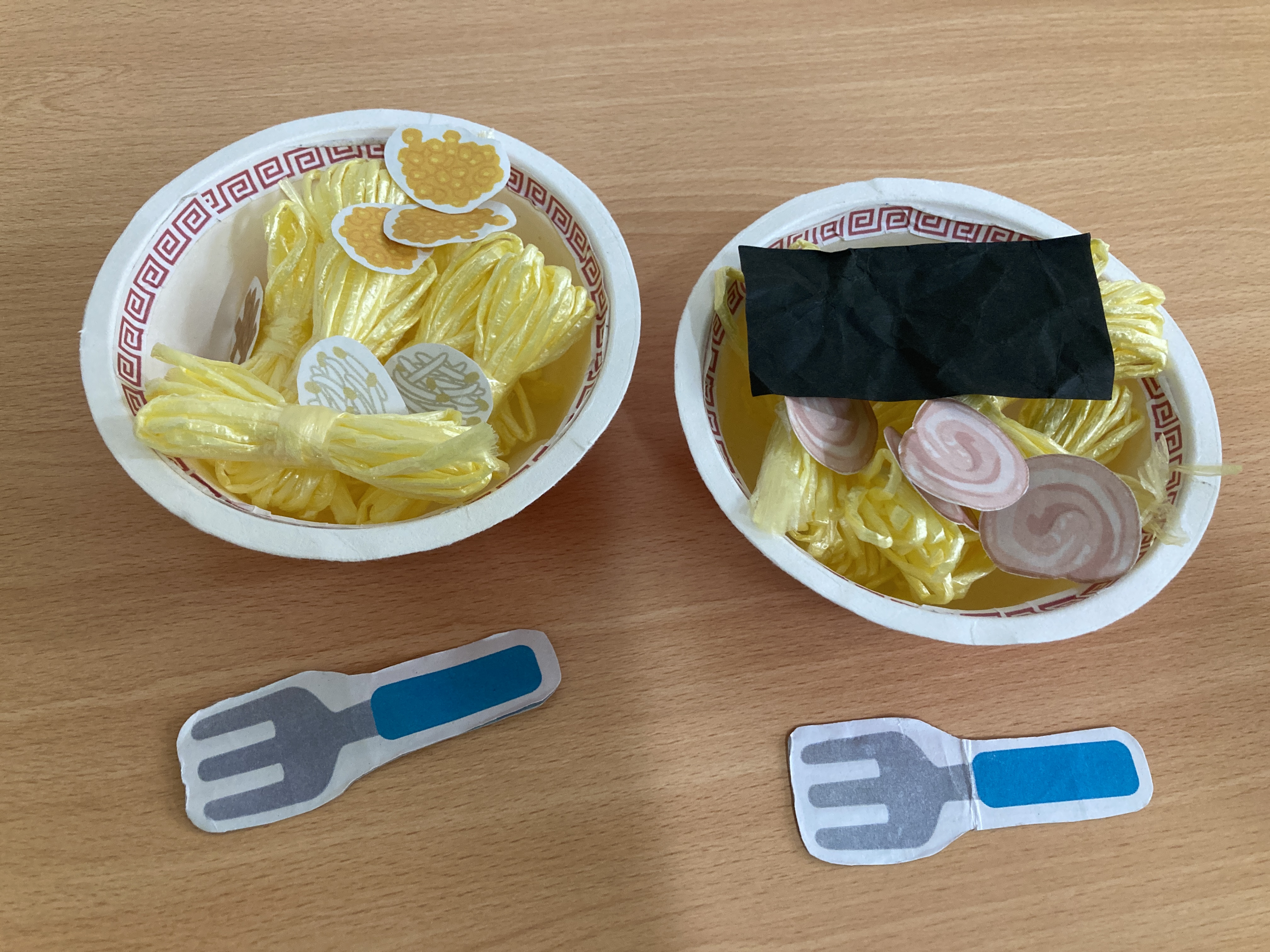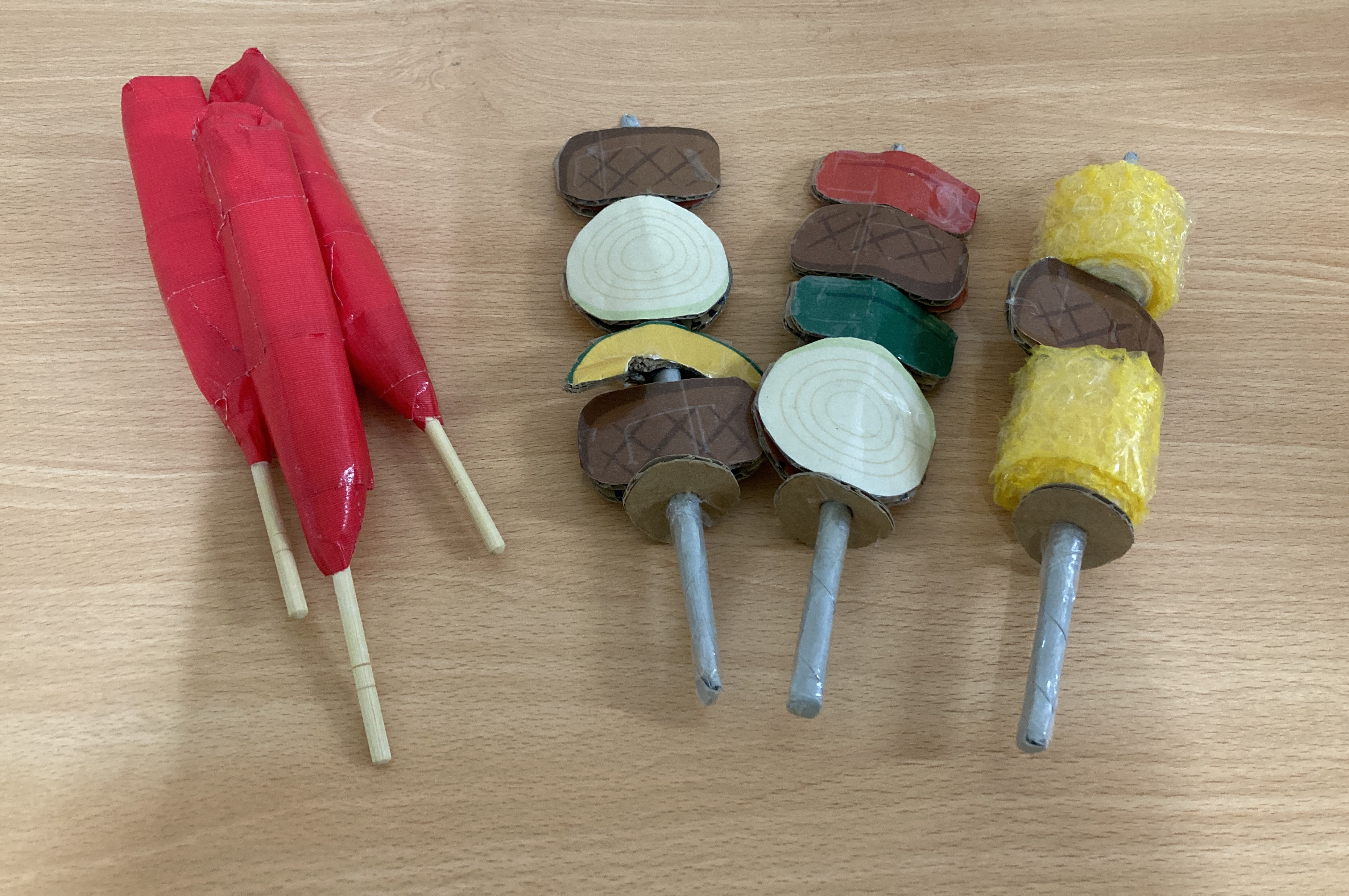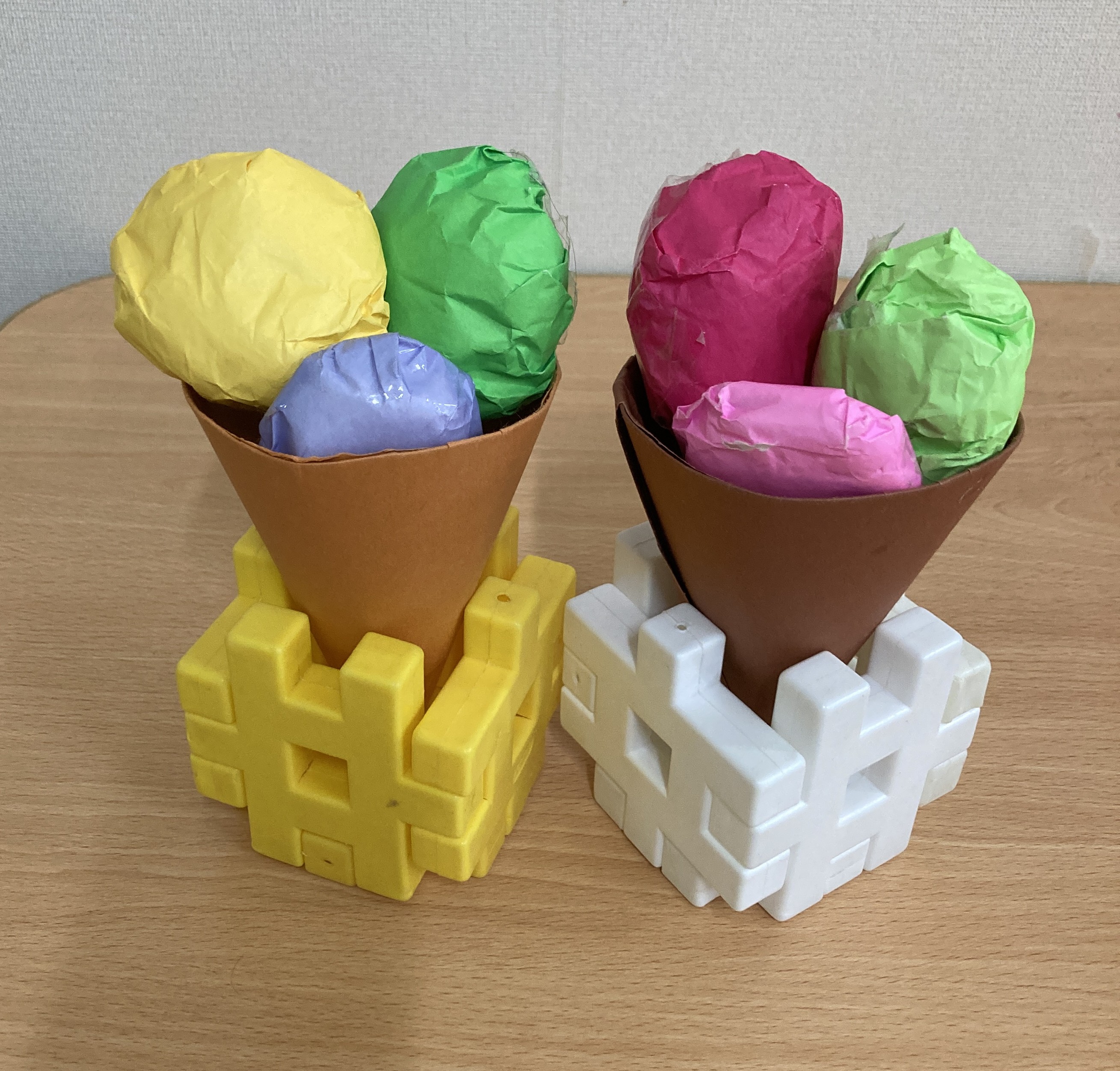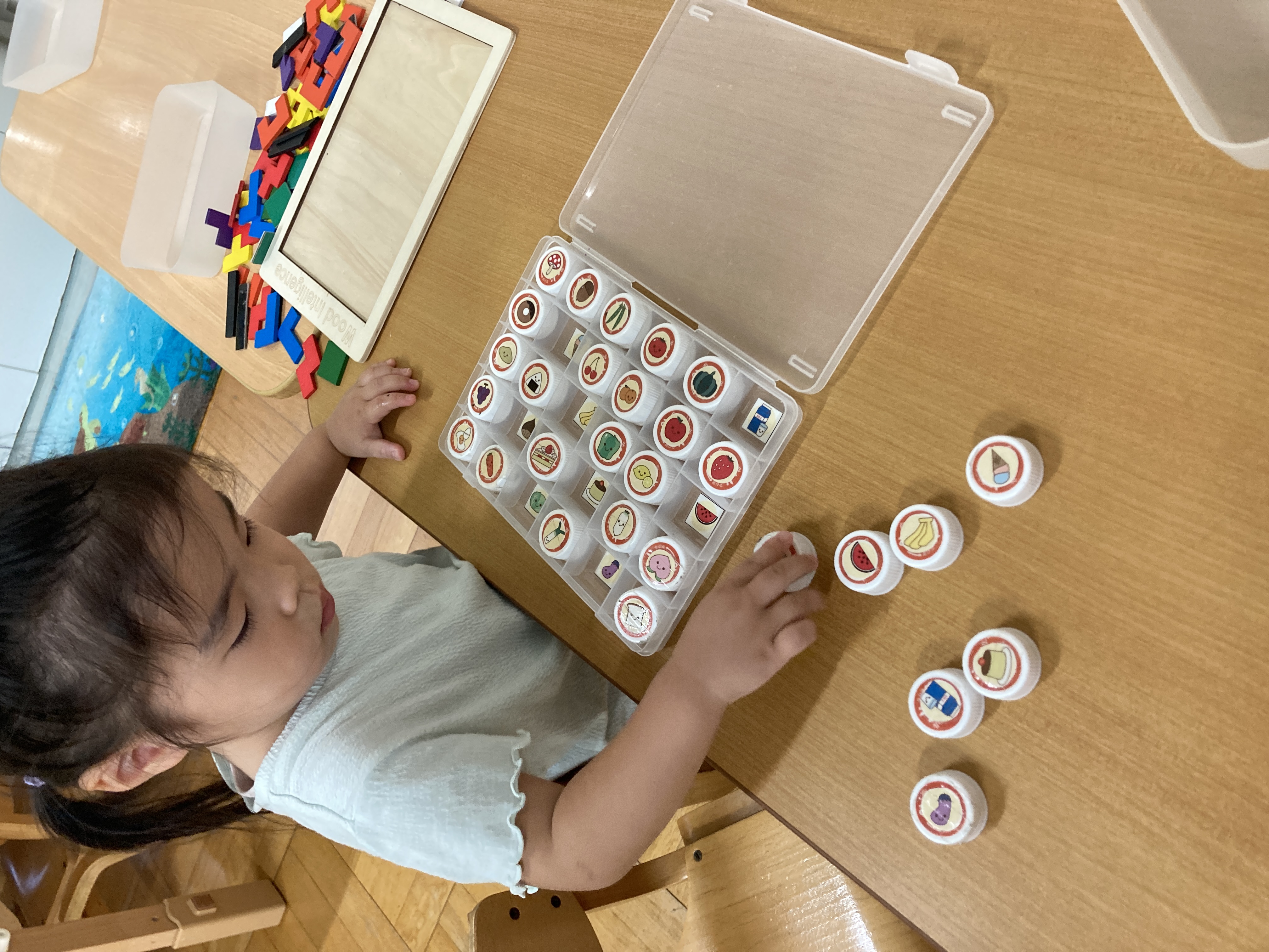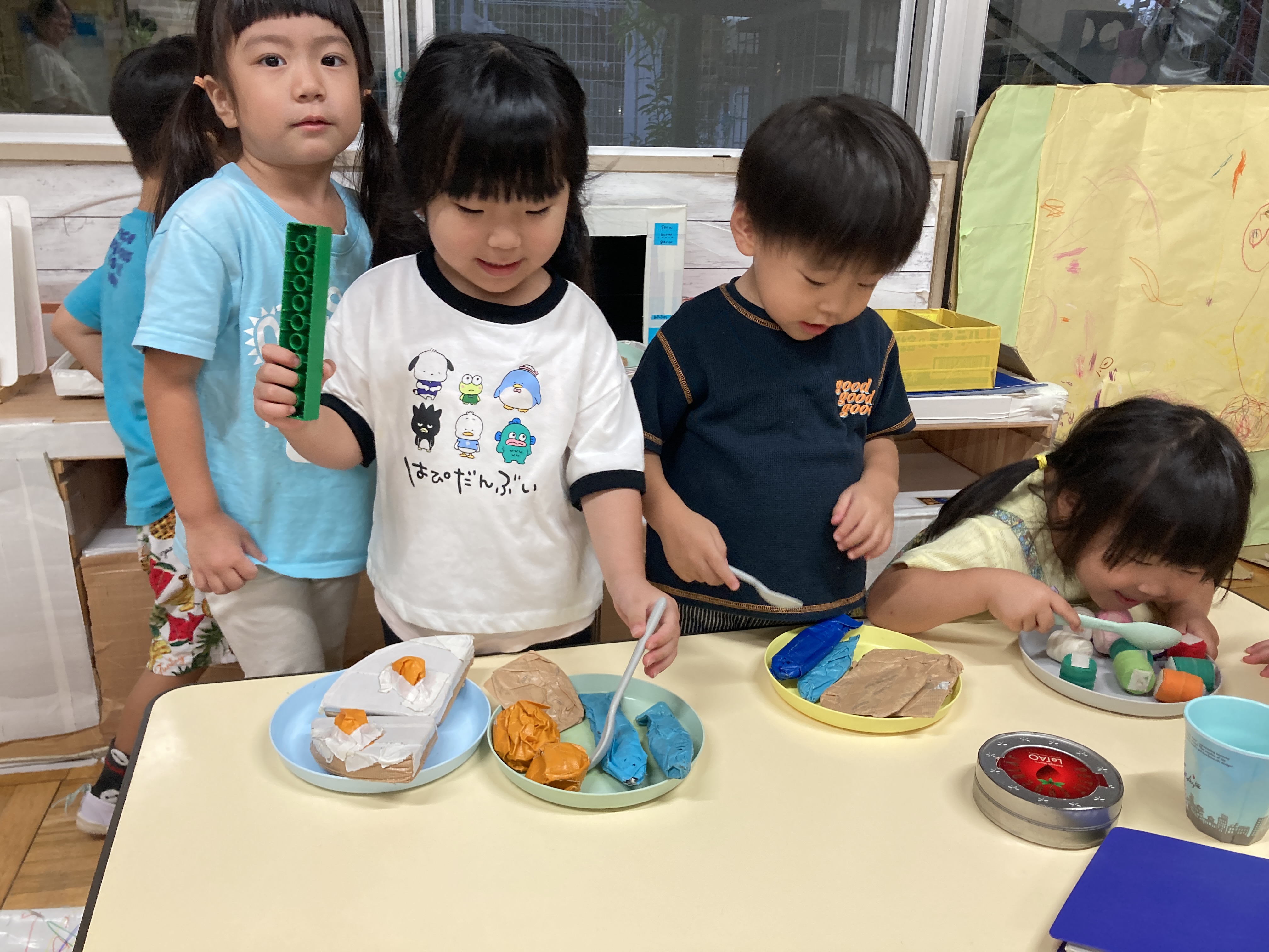 普段の生活の中でも目にする食べ物を遊びの中で取り入れられるように用意すると、自分オリジナルの組み合わせをしながらおいしいものを作ったり、作った食べ物をお友達や保育士とやり取りすることを楽しんでいます。