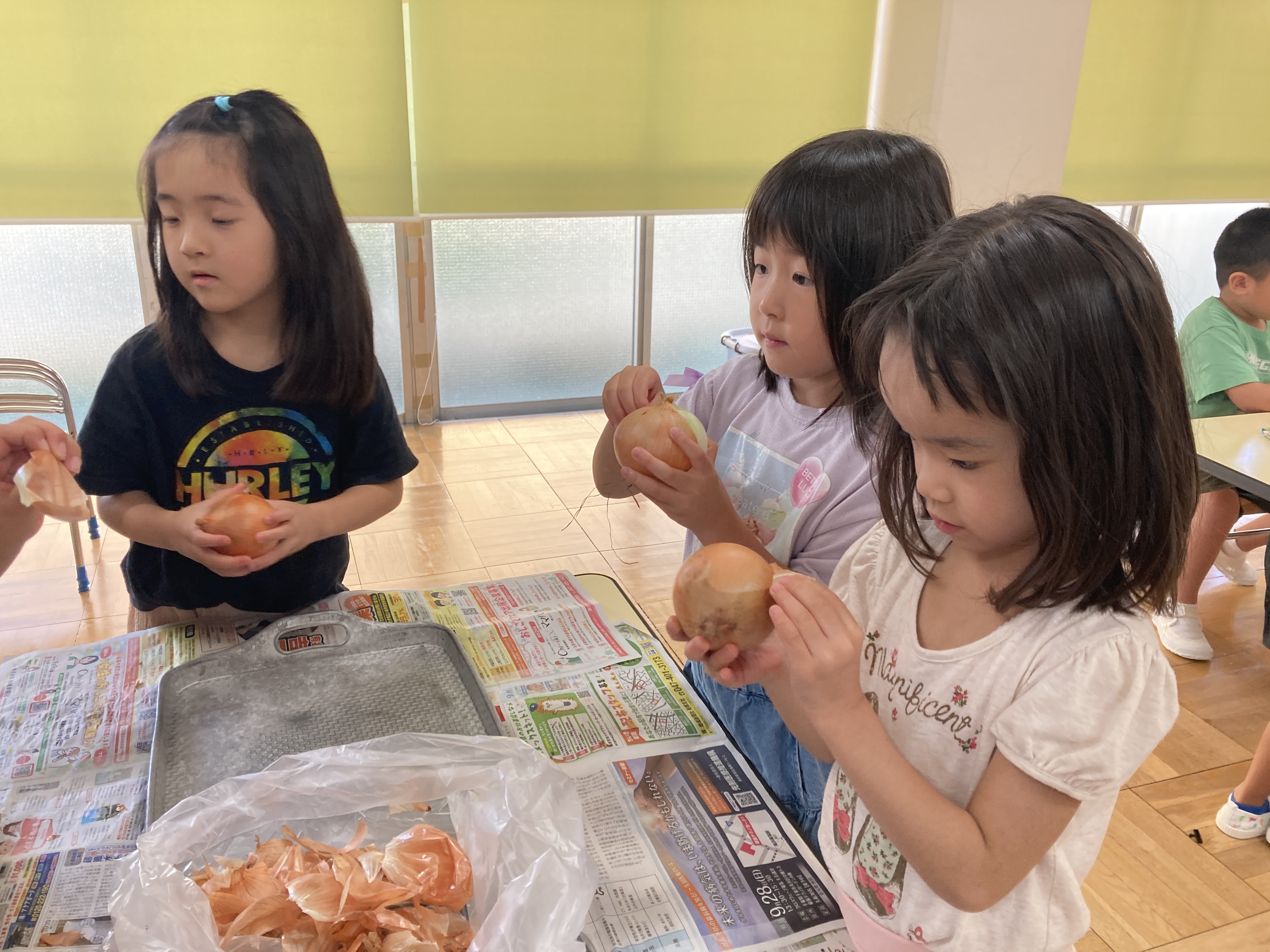 食育では玉ねぎの皮むきや、じゃがいも洗い、みそ作りなどを通して