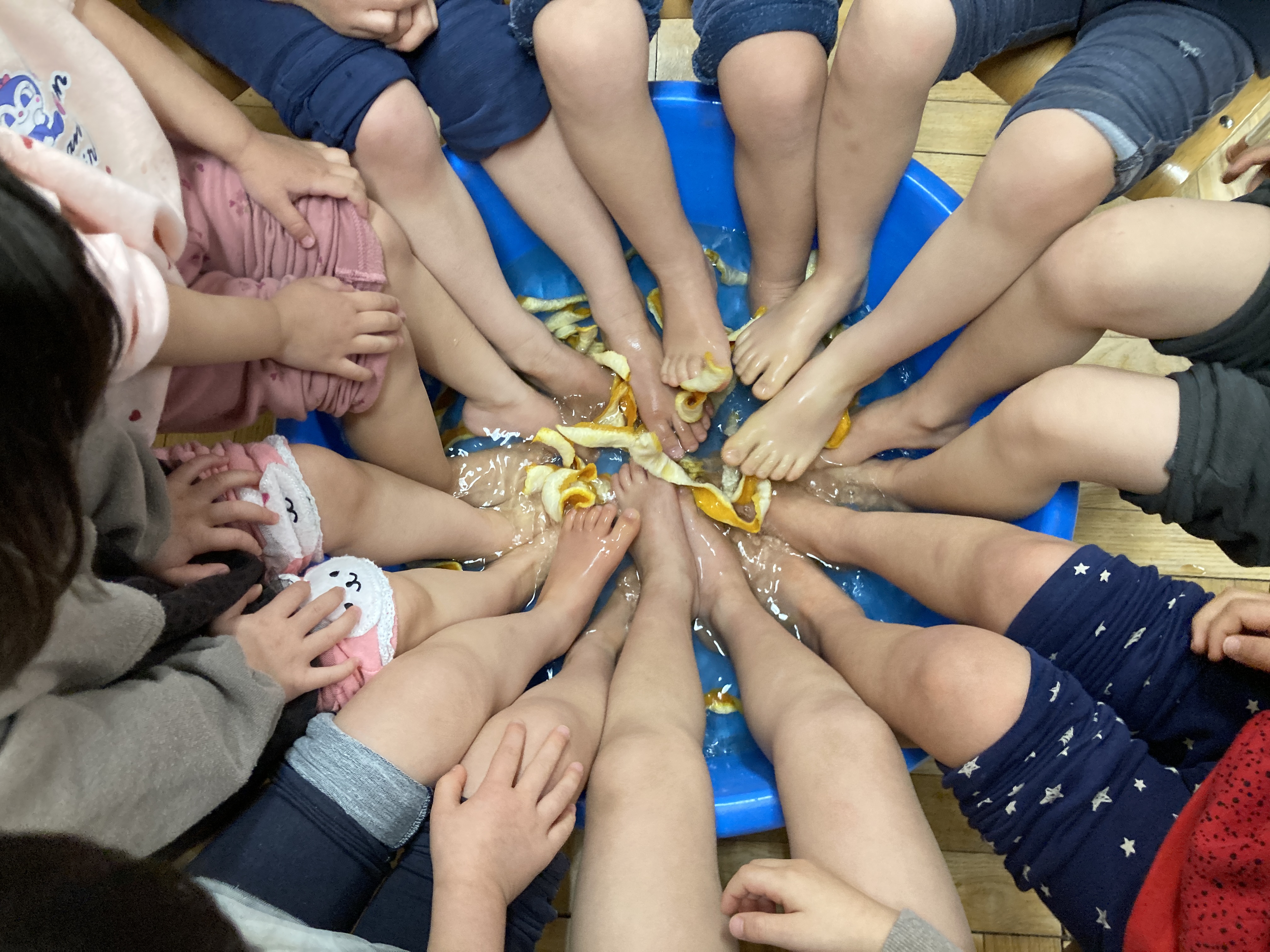 また、前回紹介した園庭のナツミカンの木になった実も、遊びの中に取り入れ、においをかいだり触ってみたりしています。足湯の中に乾かしたミカンの皮を入れると、「いいにおいがするね」と大人気でした。