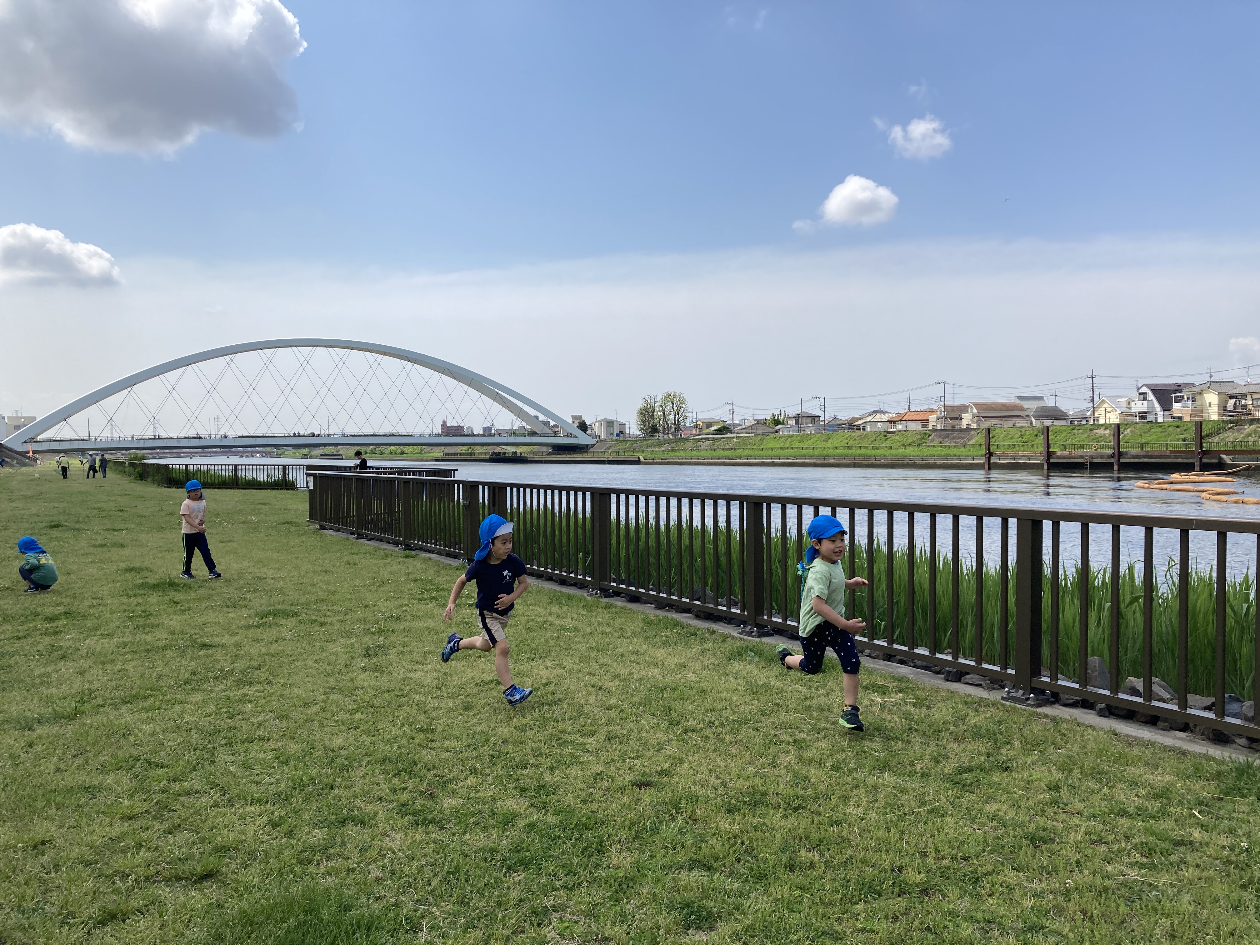 中でも子どもたちに人気なのは電車もみえて、思いっ切り走れる新中川沿いの土手です。
