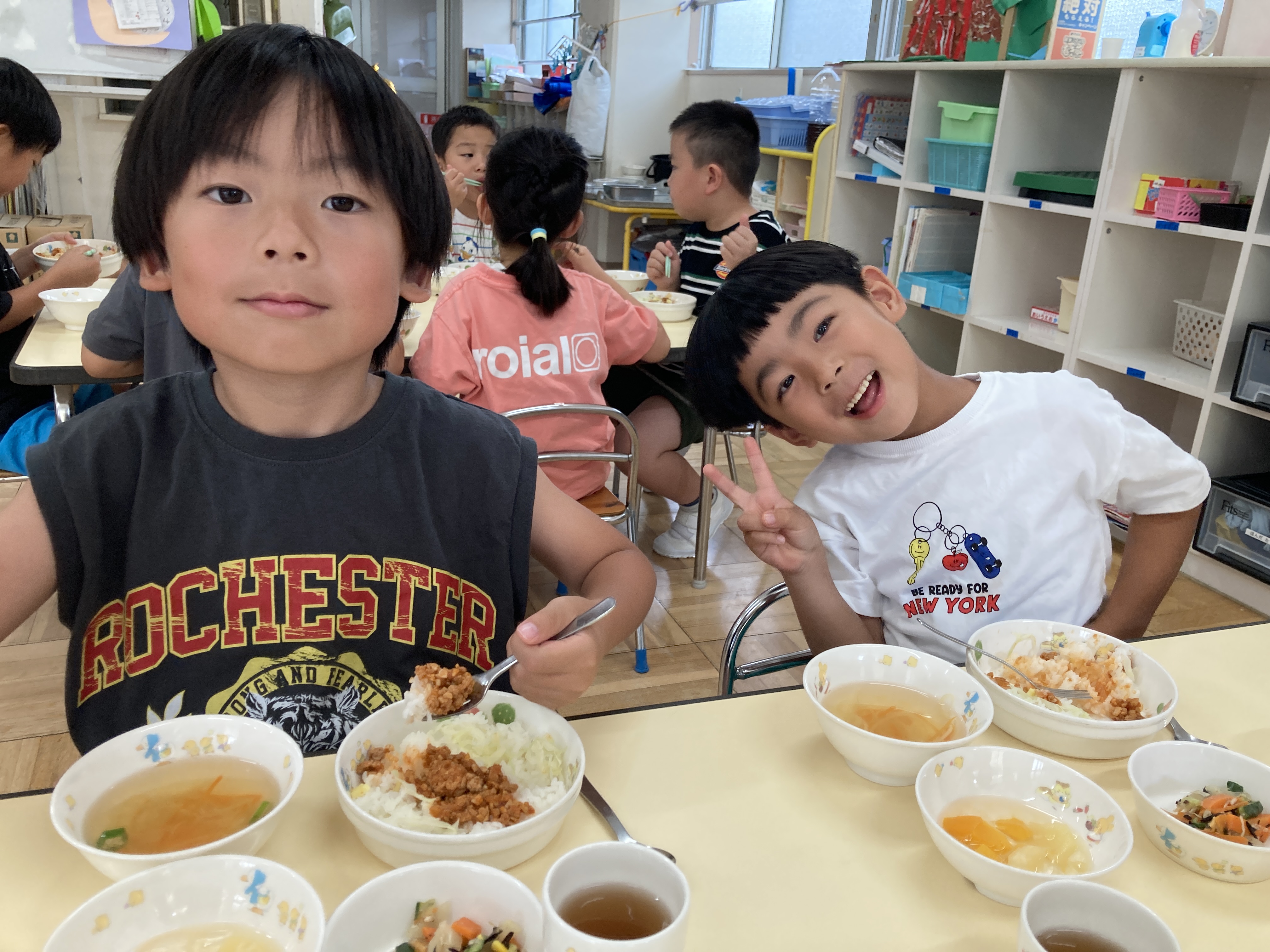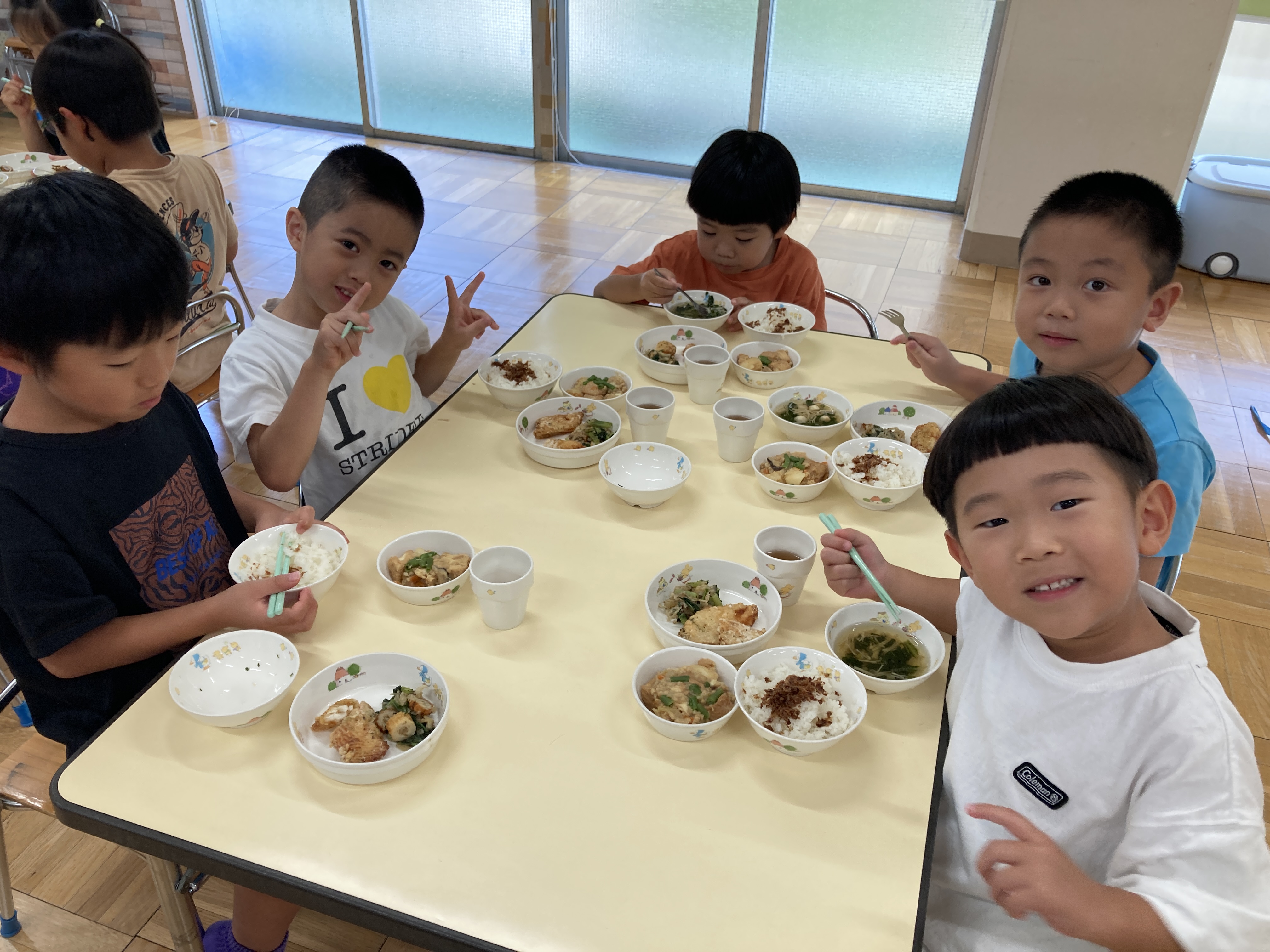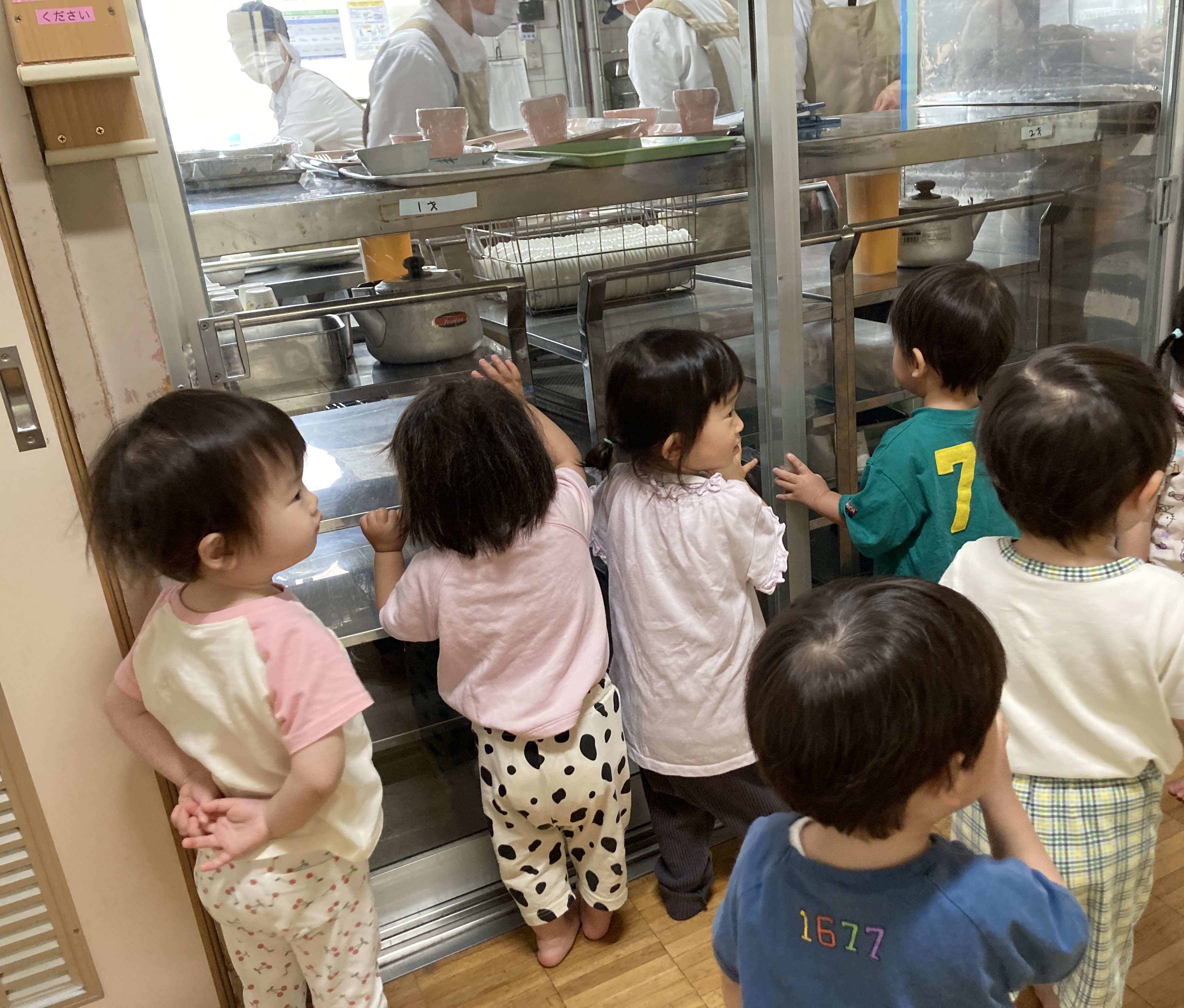 園舎内に調理室があるので、においを感じて「きょうのきゅうしょくなんだろうね」と楽しみにする姿も見られます。調理のスタッフさんが食べている様子を見に来てくれたり、食材を見せに来てくれることもあり、日ごろから交流しています。また、年に1回魚屋さんが生の魚を目の前でさばいてくれる魚の解体も行っていますよ。