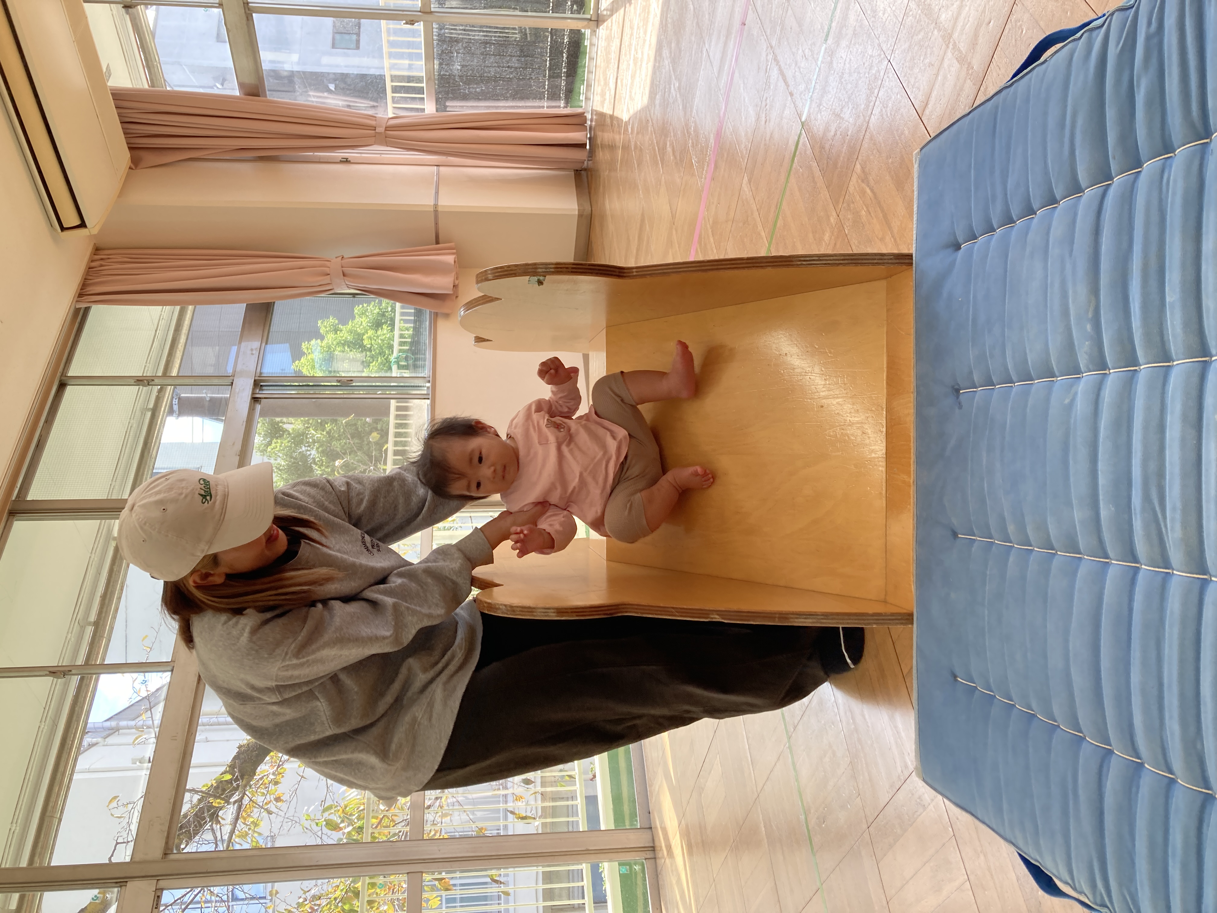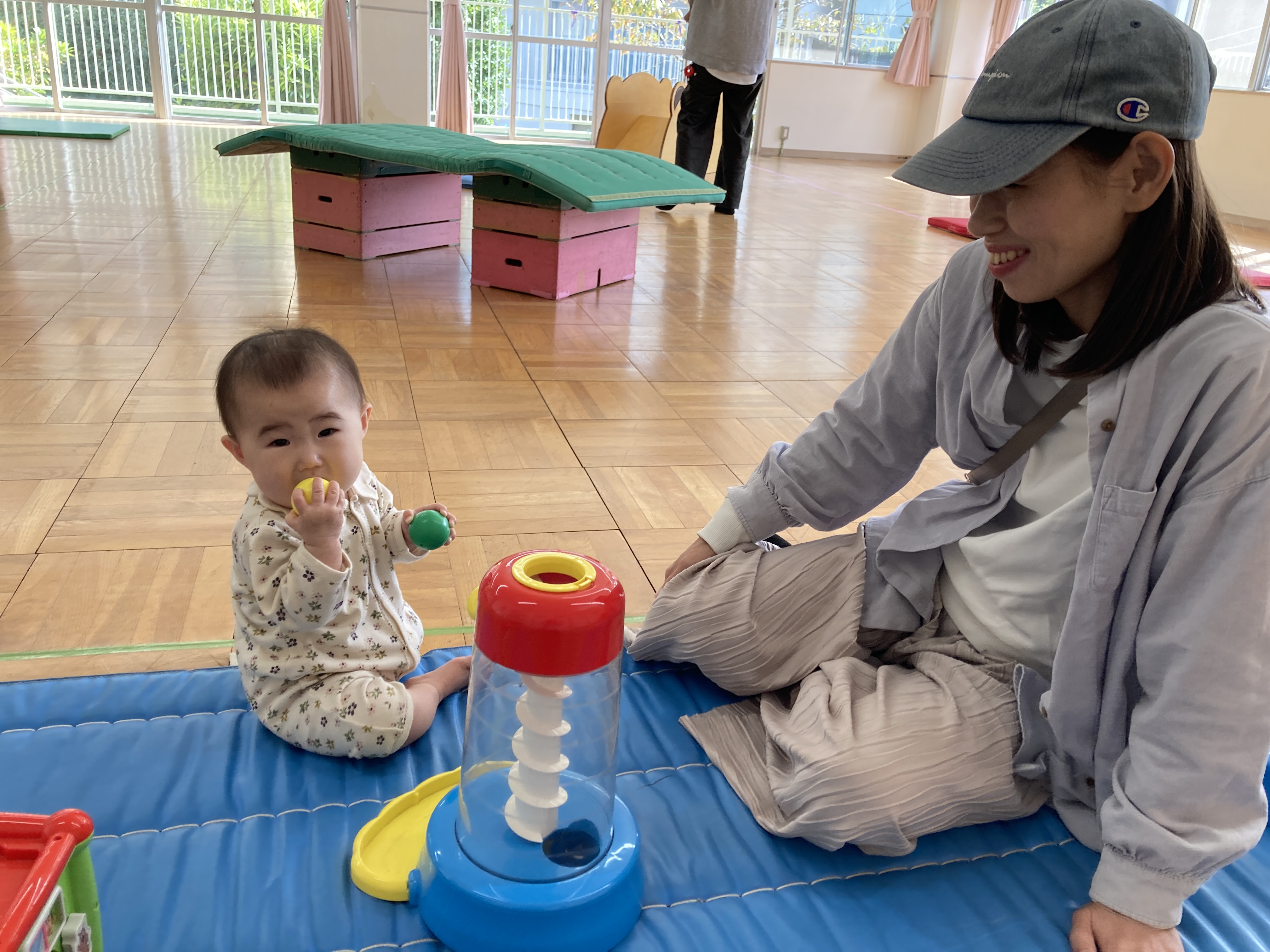 また、マットの上でのんびり遊べるコーナーや滑り台やマットのお山で元気に身体を動かせるコーナーも設定しました。