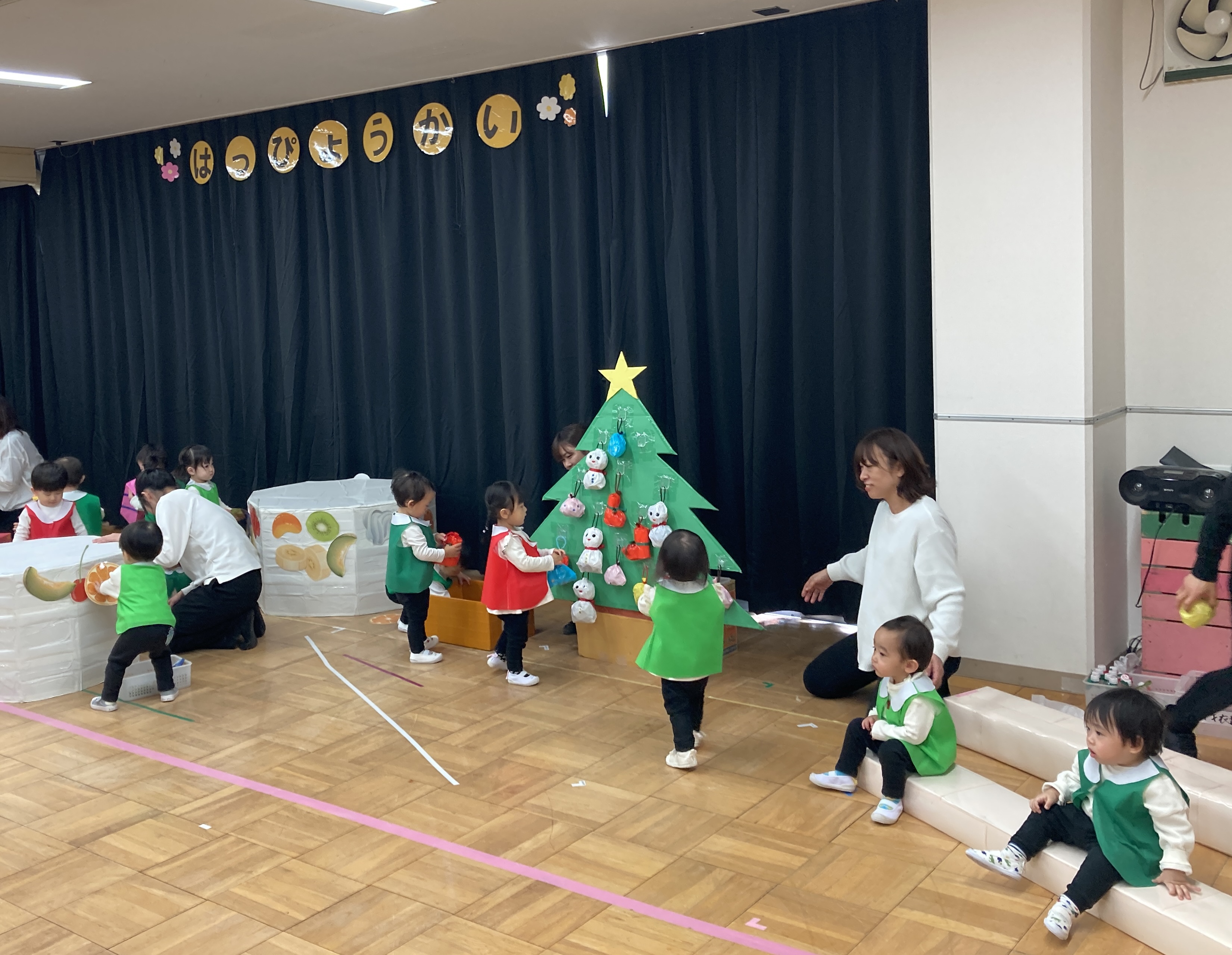 1歳児は、保護者の方と離れてクリスマスのオーナメント飾りや手作り楽器を持って歌を唄い楽しみました。