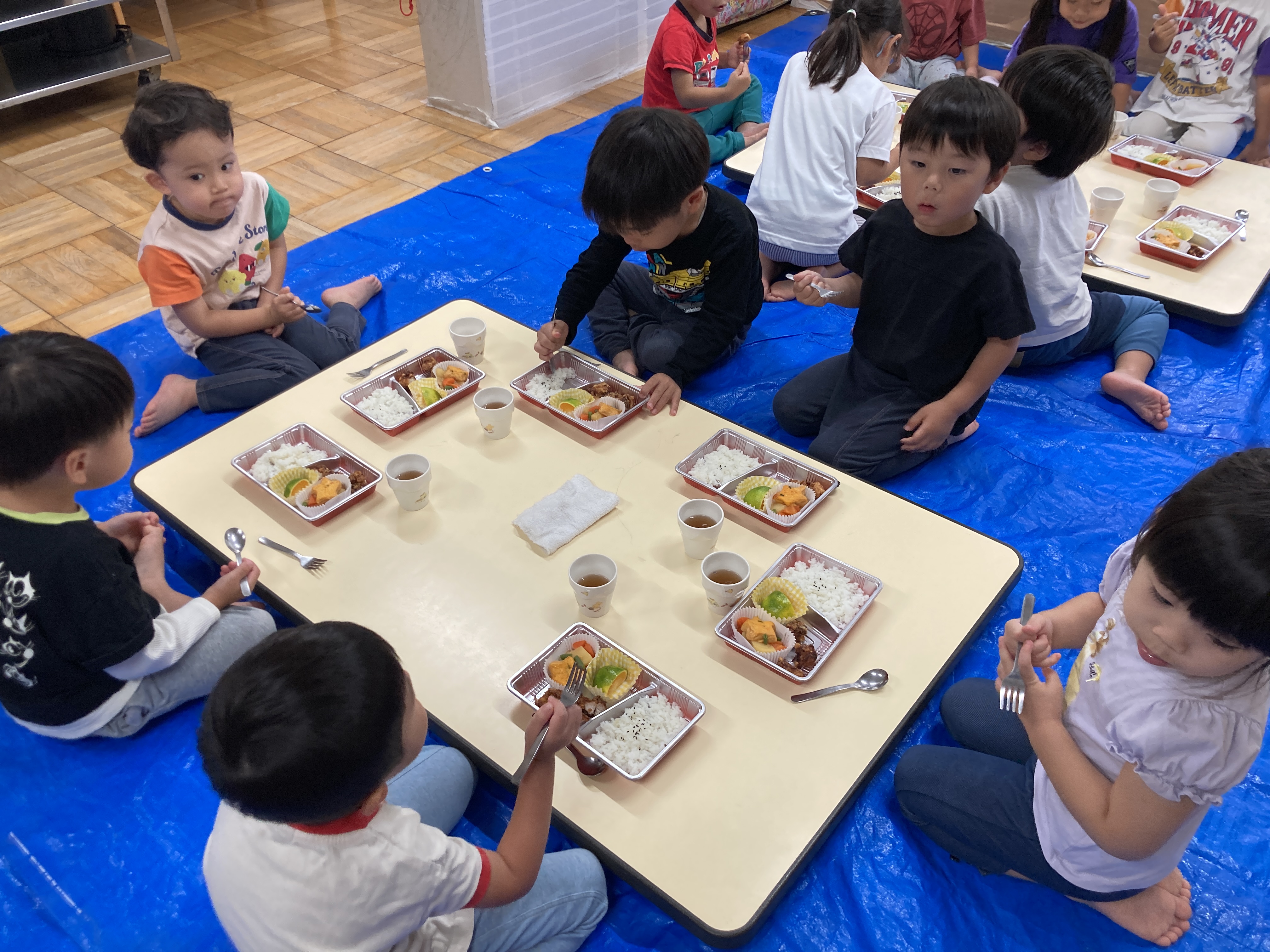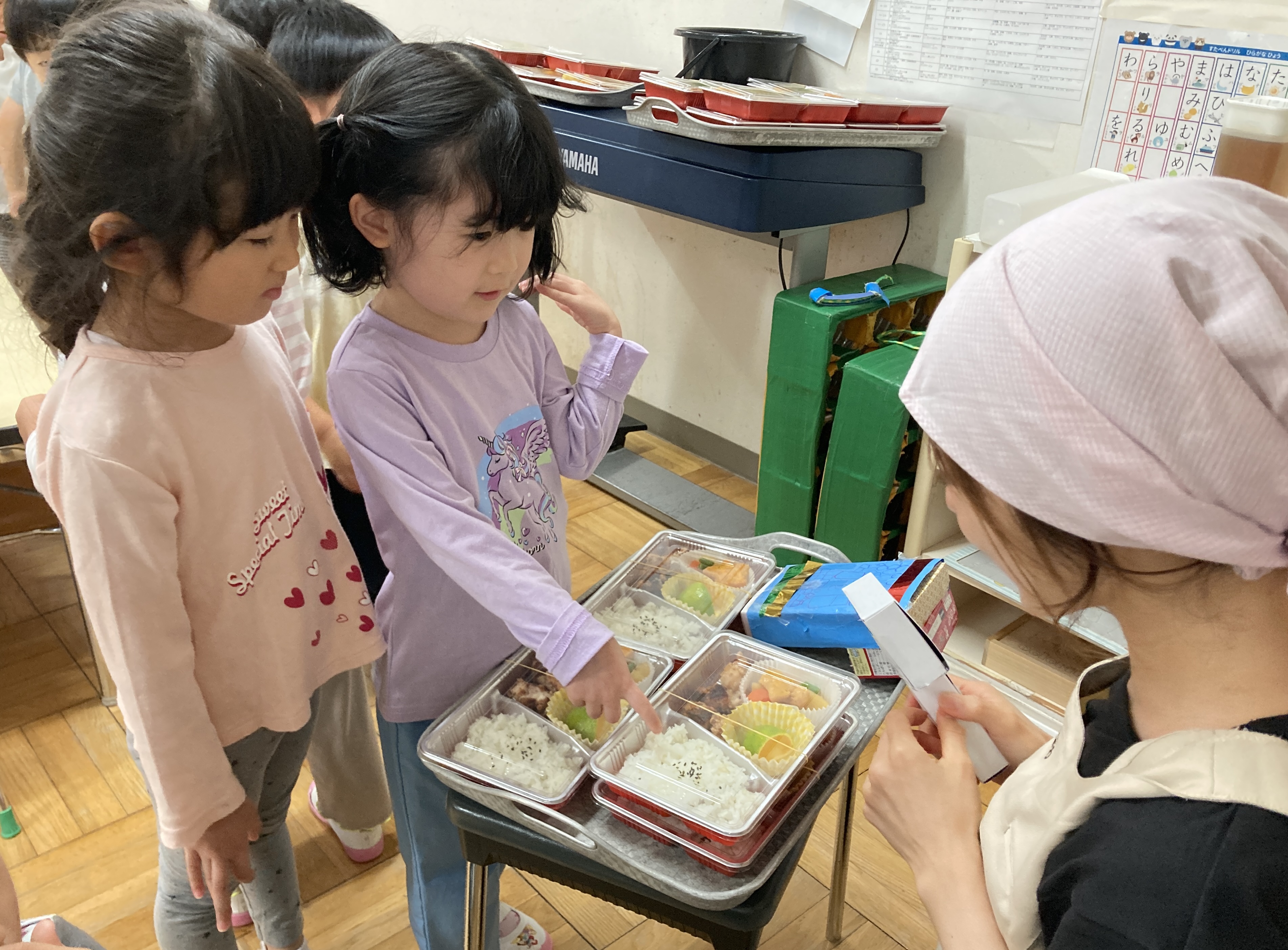 子ども達も「おべんとう!」「なにが入っているのかな?」と、わくわくした気持ちで給食の時間を迎えていました。
