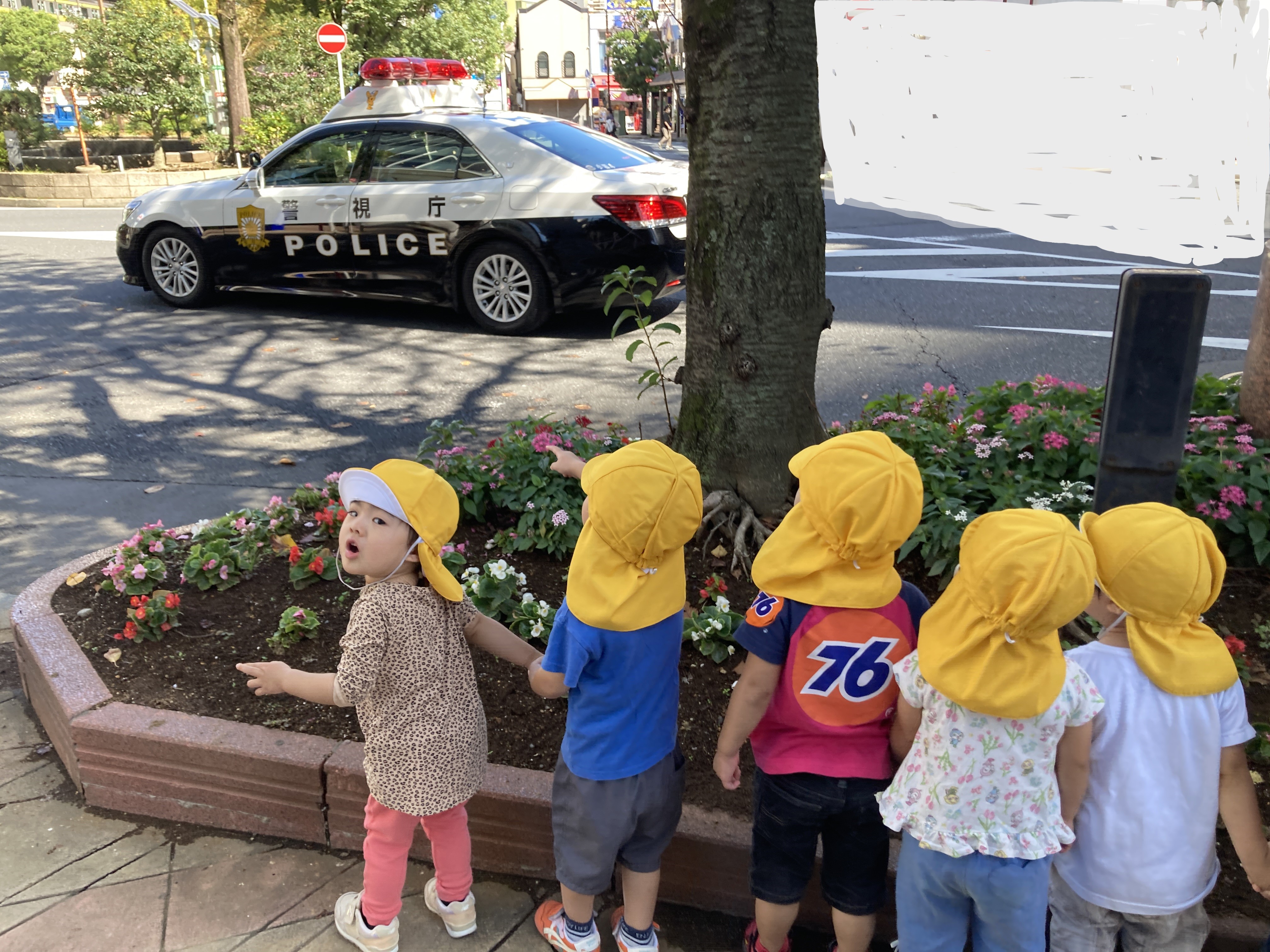 園の外に出ると発見がいっぱいで「バスがいたよ」「お花綺麗だね」「これは何のお店?」と子どもたちのワクワクの会話が途絶えません!