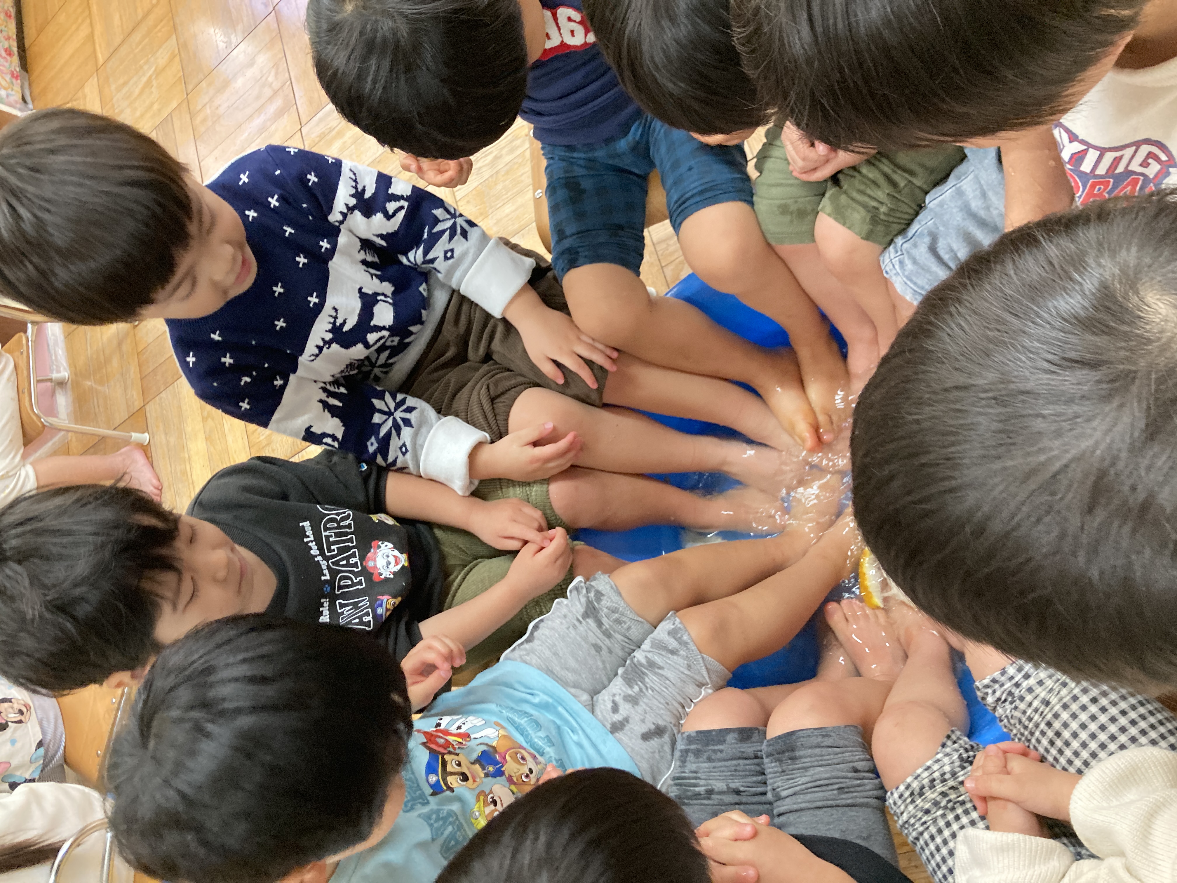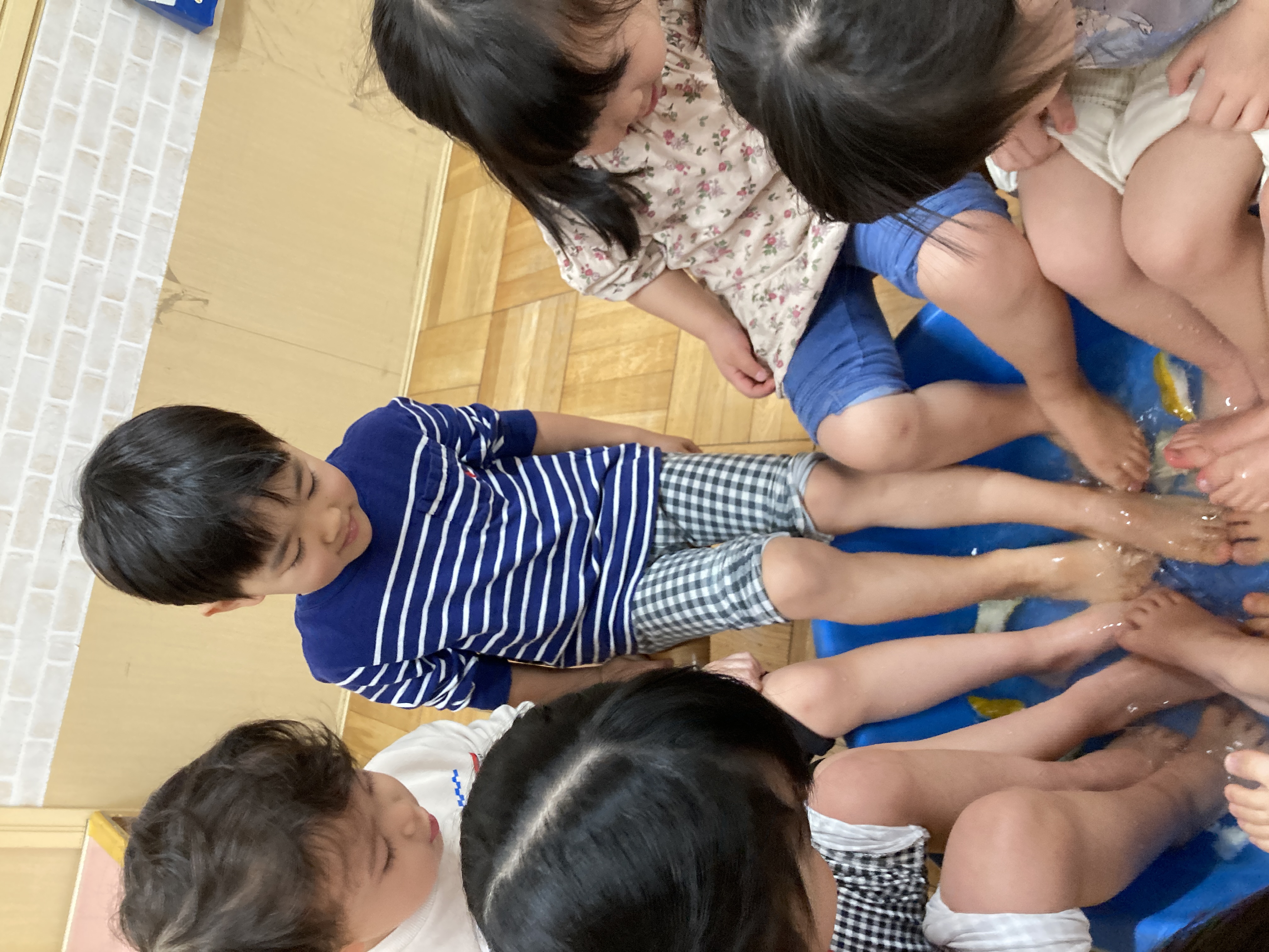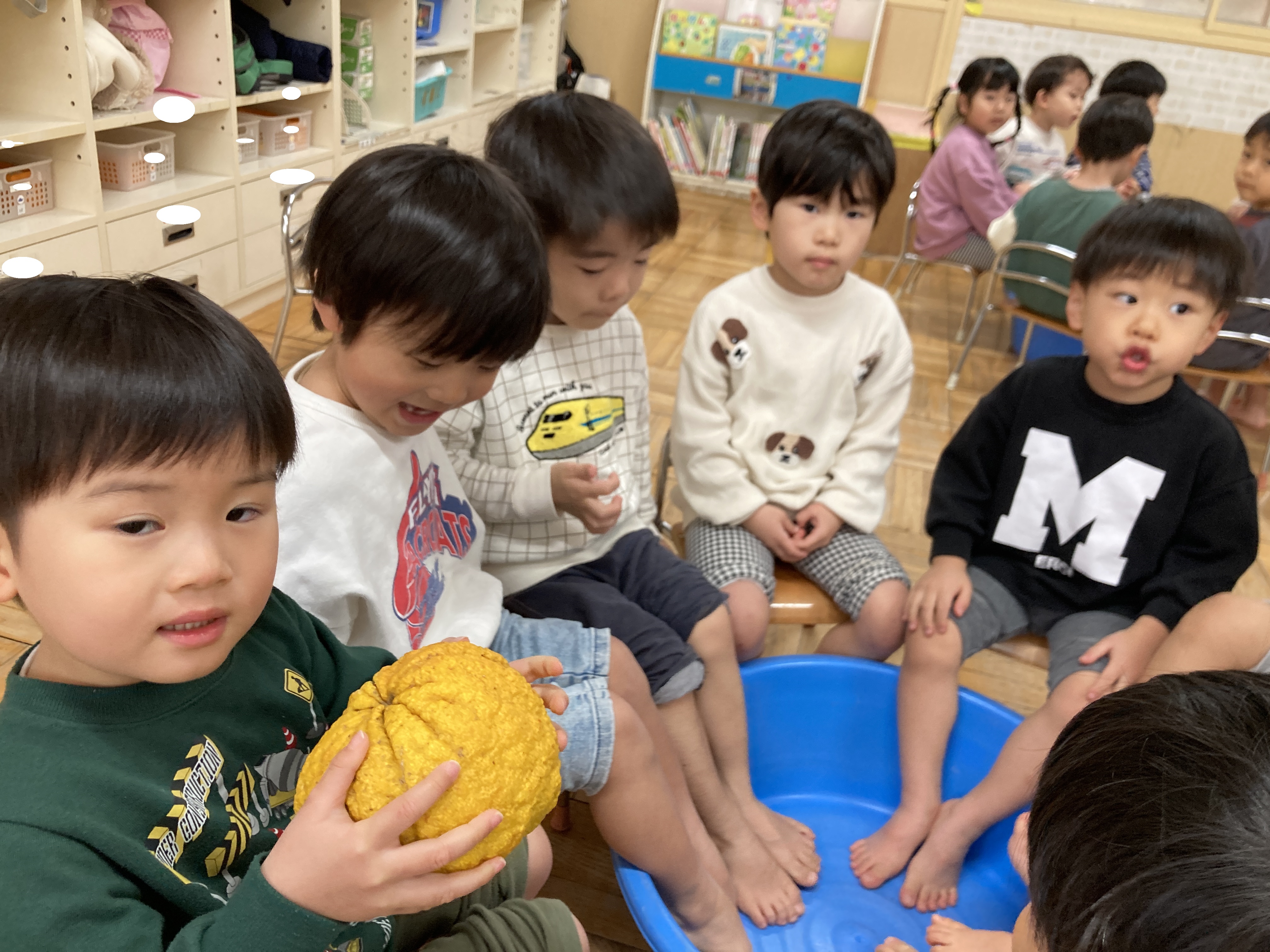 お湯の中にゆずを入れ足を入れると「きもちい~」と大人顔まけの表情でした。