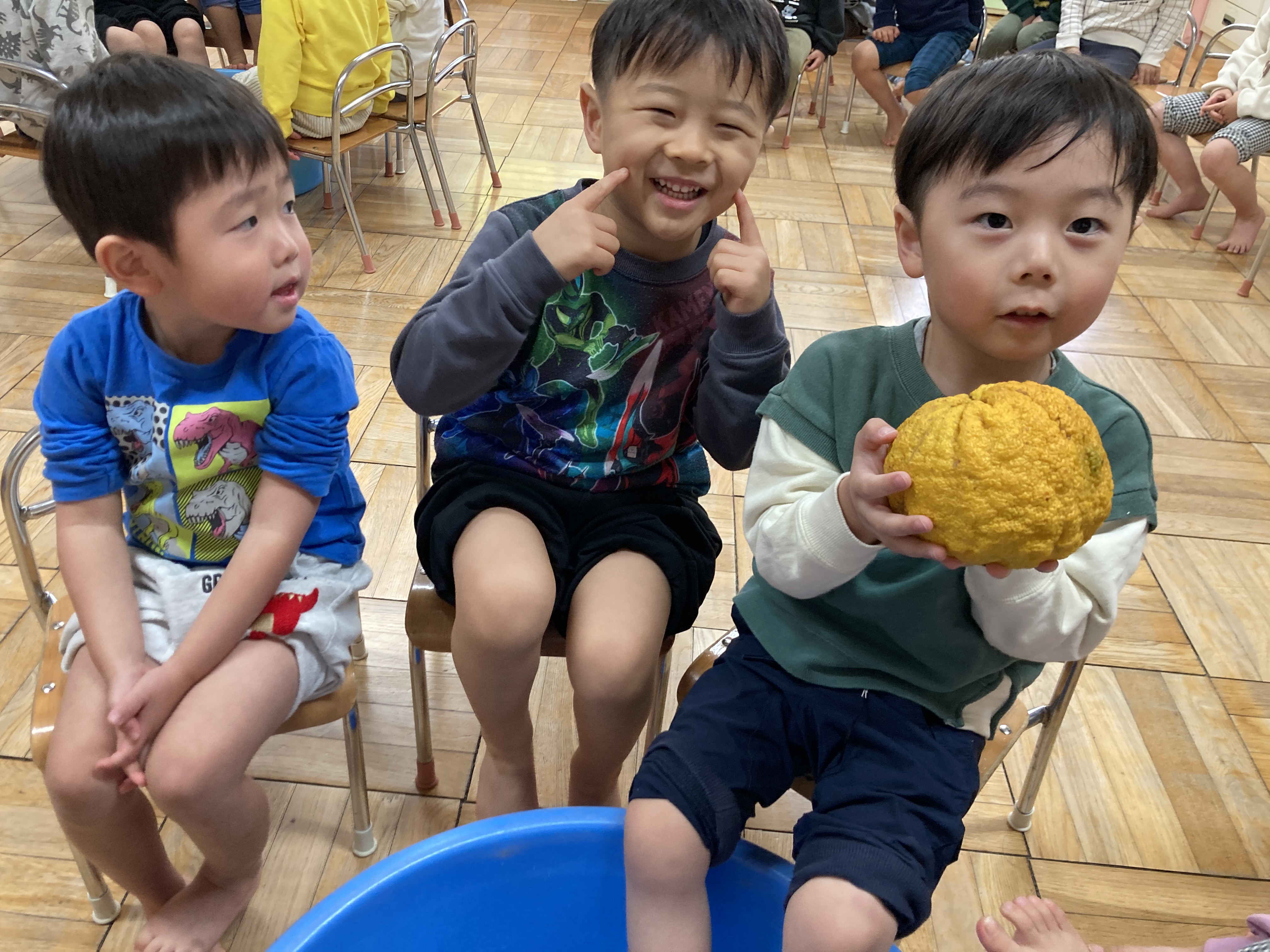 「いいにおい~」と子どもたちの嗅覚を刺激したようで。実際に皮や実を触ってみて手からの感覚も味わいました。