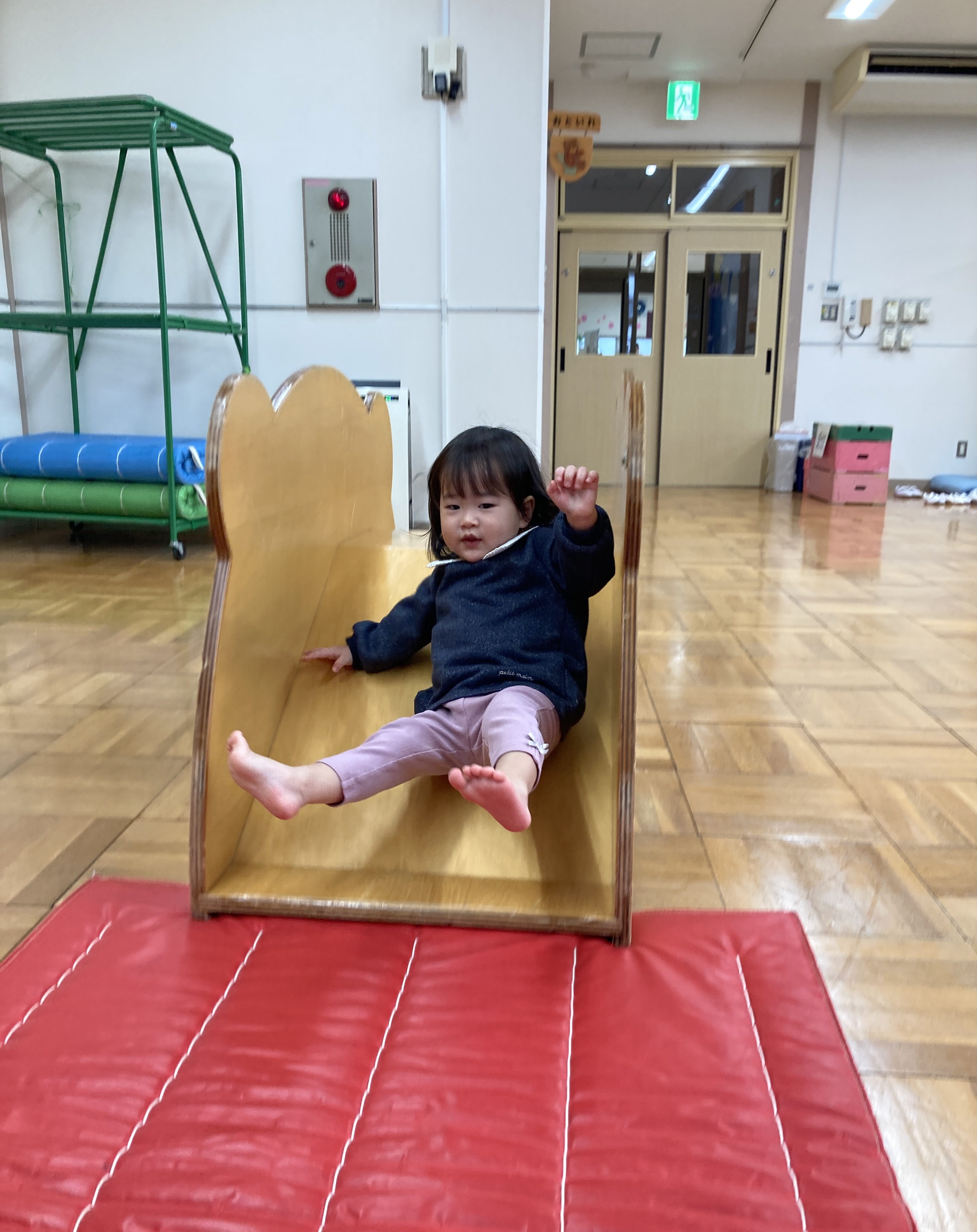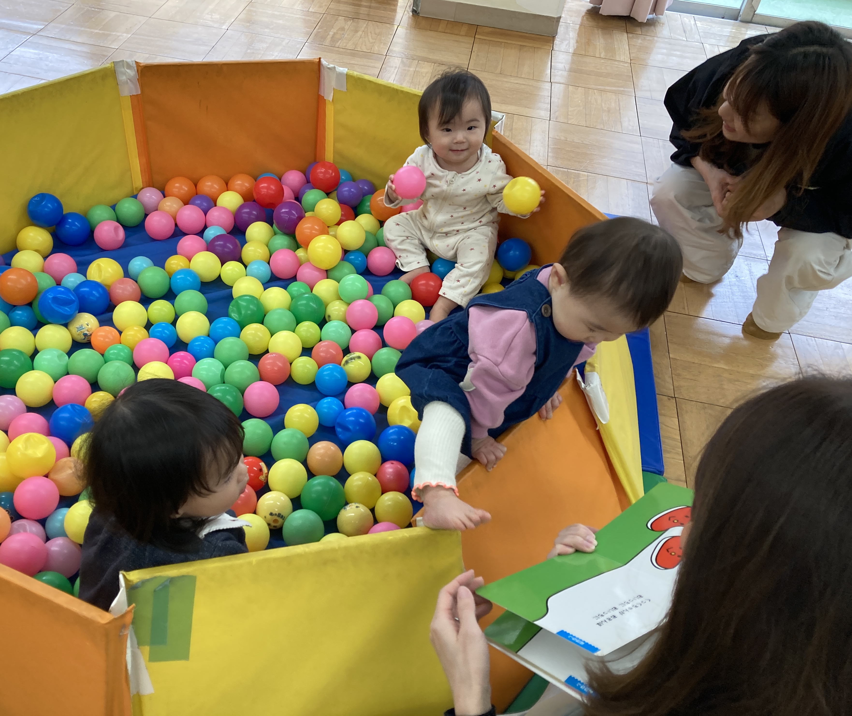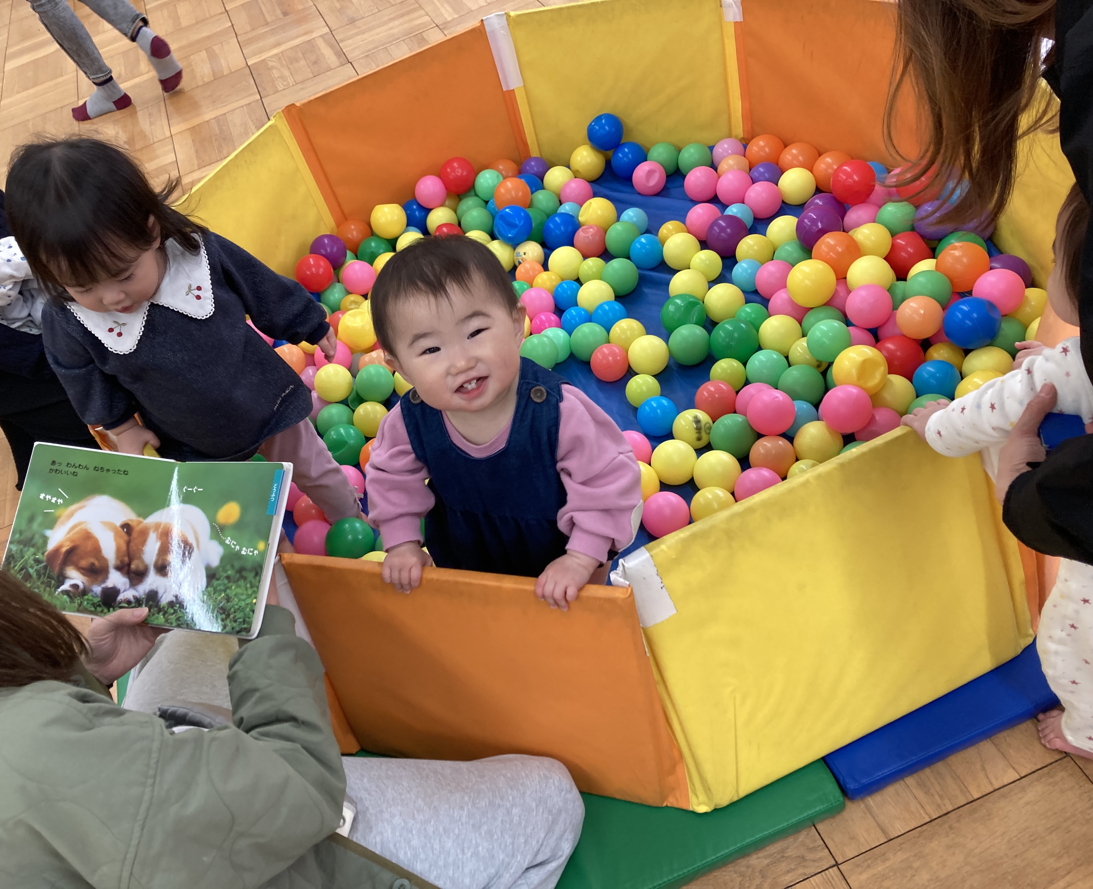 最初はママの元から離れないお友達もひよこ組さんの遊びを真似して、ボールプールや滑り台、マット山で元気に身体を動かしていました♪
