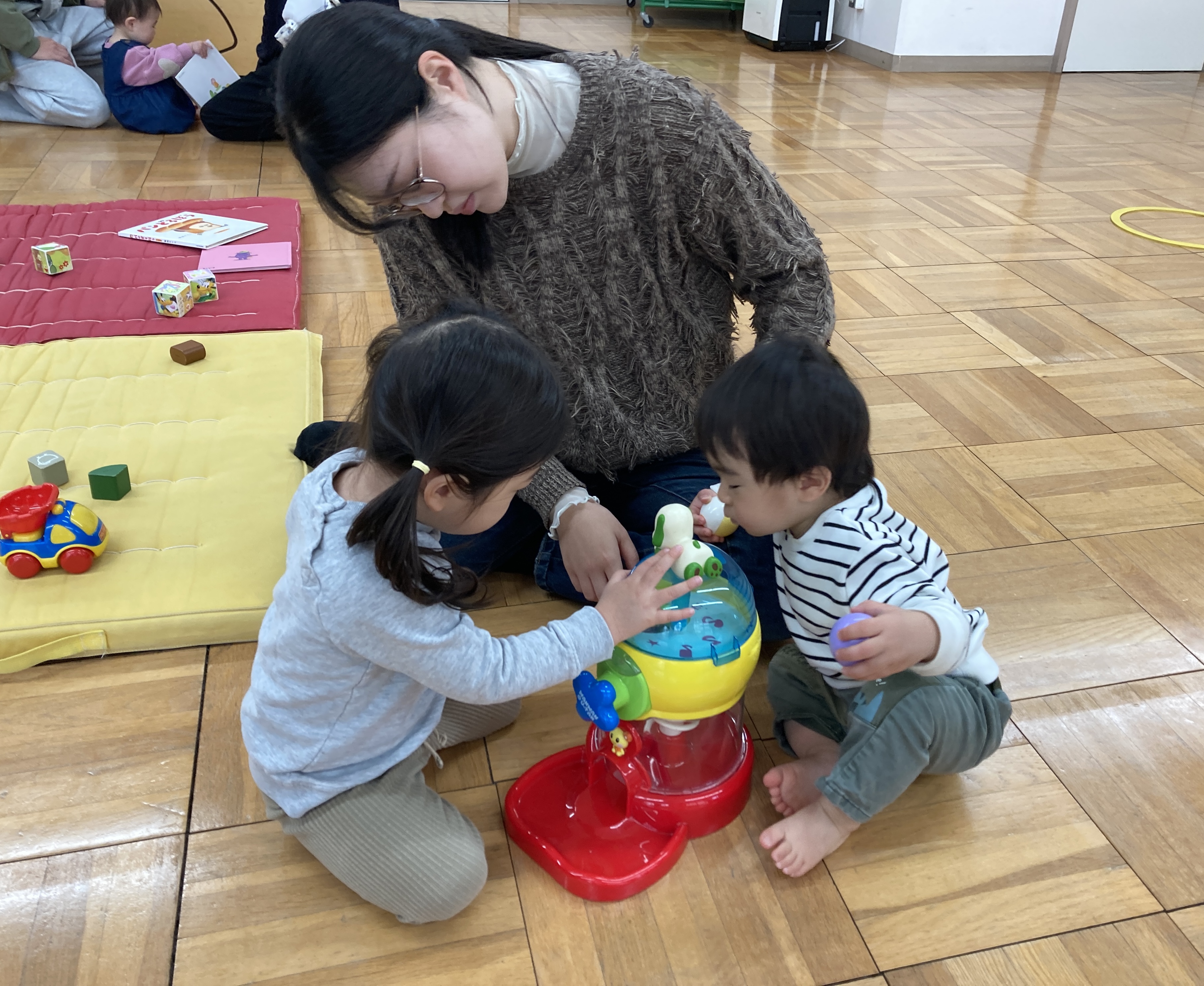 今日は出張☆おひさま子育てひろばでかるがも広場に行く予定でしたが、天気と朝の気温を考慮して「ホールで遊ぼう」に変更しました。6名のご家庭とひよこ組のお友達が参加をし、一緒に遊びを楽しみました。