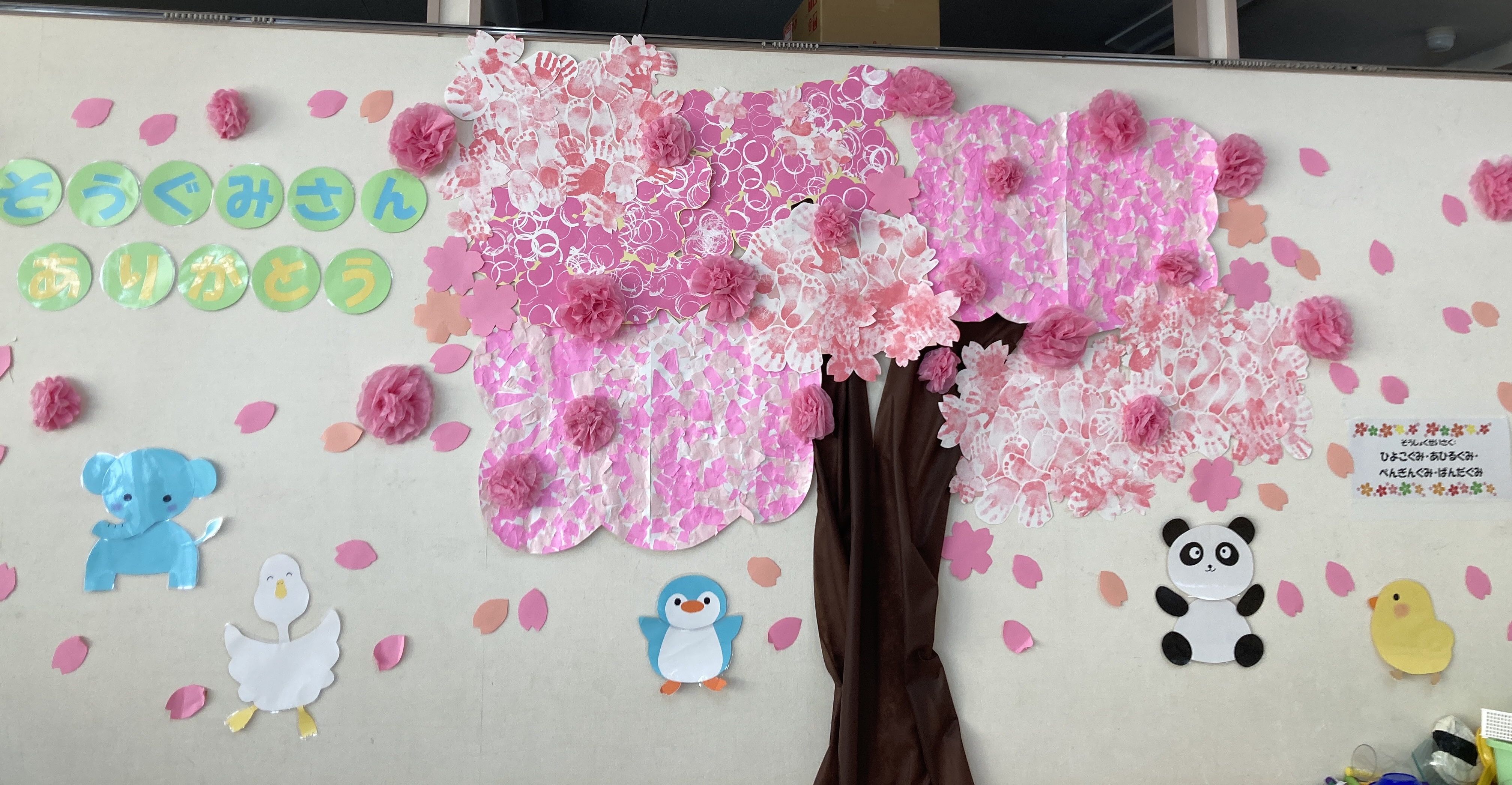 在園児みんなで制作した素敵な桜の装飾で会を明るく彩りました。