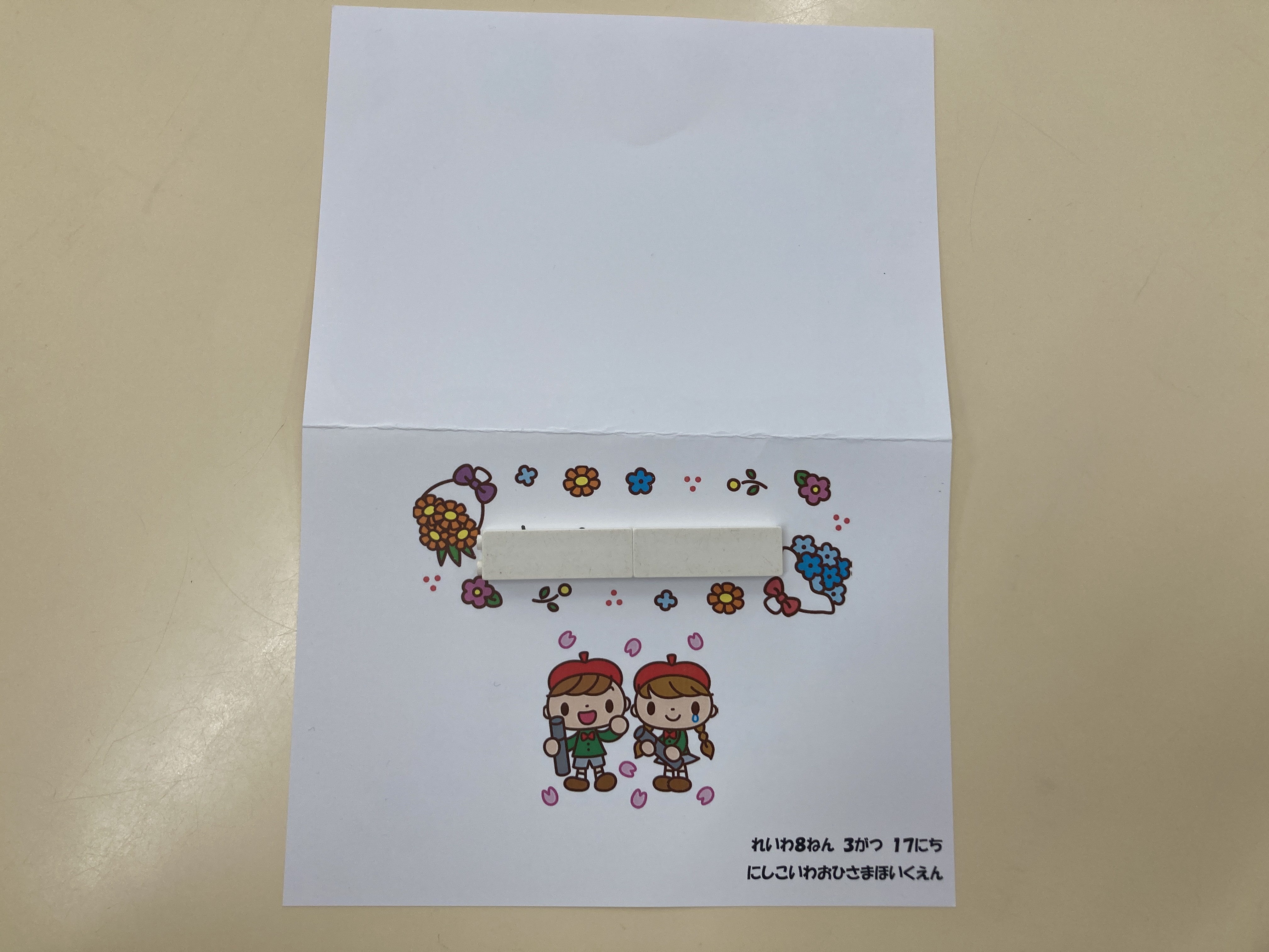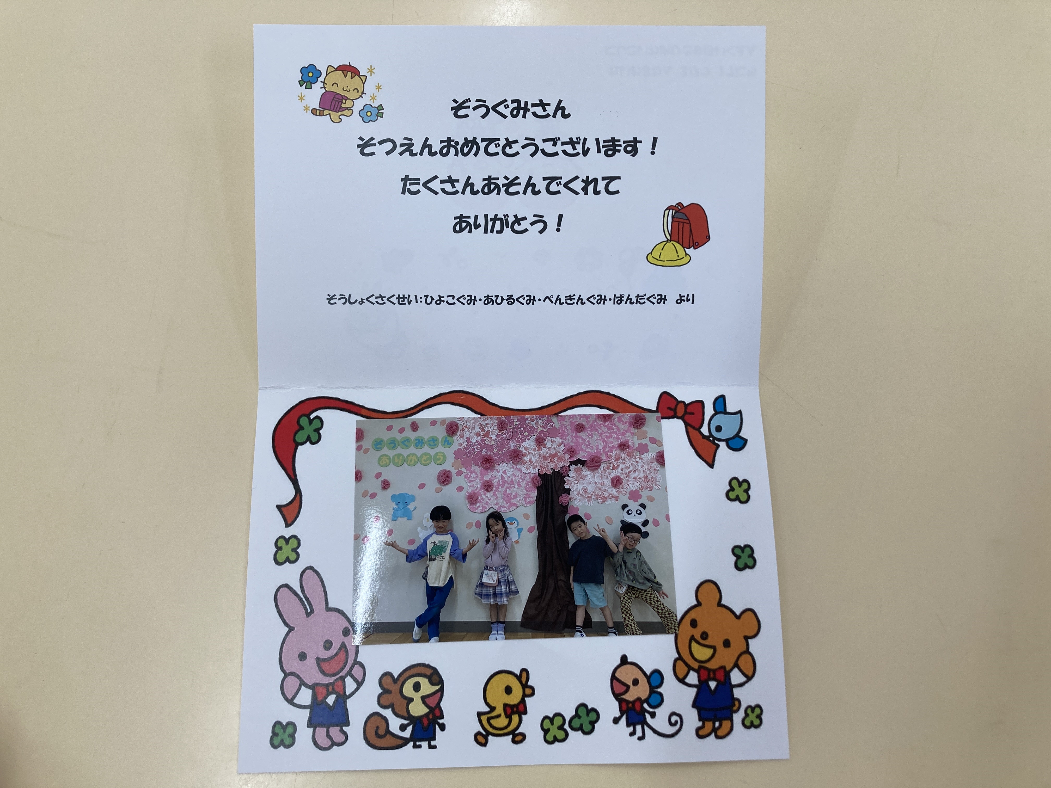 子どもたちからのプレゼントは、各クラス歌のプレゼントと手作り装飾の前で撮った写真を貼ったカードです。ぞう組さんもお礼の歌を唄ってくれて、子どもたちの気持ちが沢山詰まった温かい会となりました。最後は、在園児みんなで花道を作り、ぞう組さんを送り出しました♪
