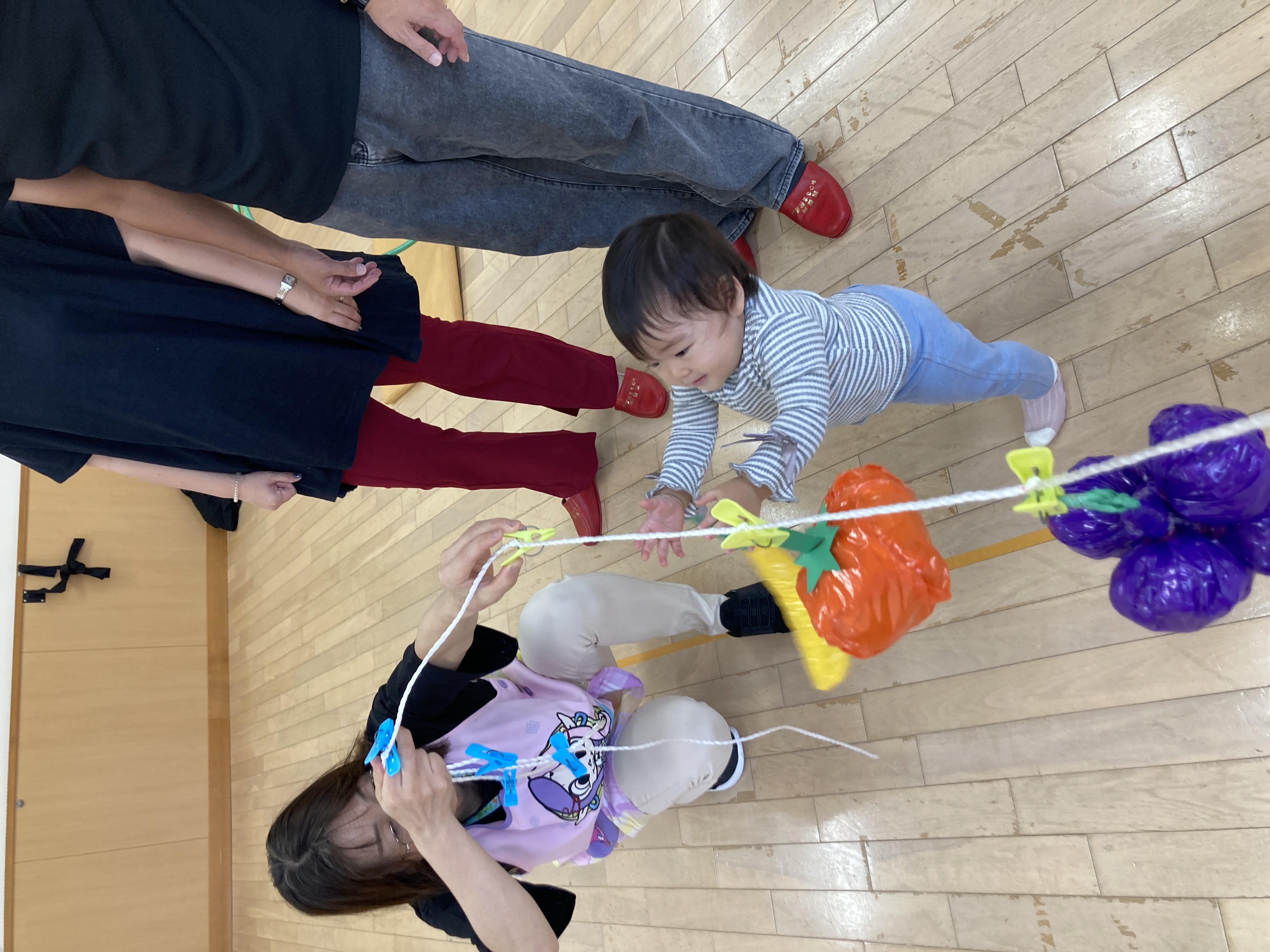 1歳児クラスが運動会で行った競技を行いました。「くいしんぼうのゴリラ」の歌をイメージに、トンネルをくぐり、果物を選んでゴリラさんに食べさせてあげるという流れです。