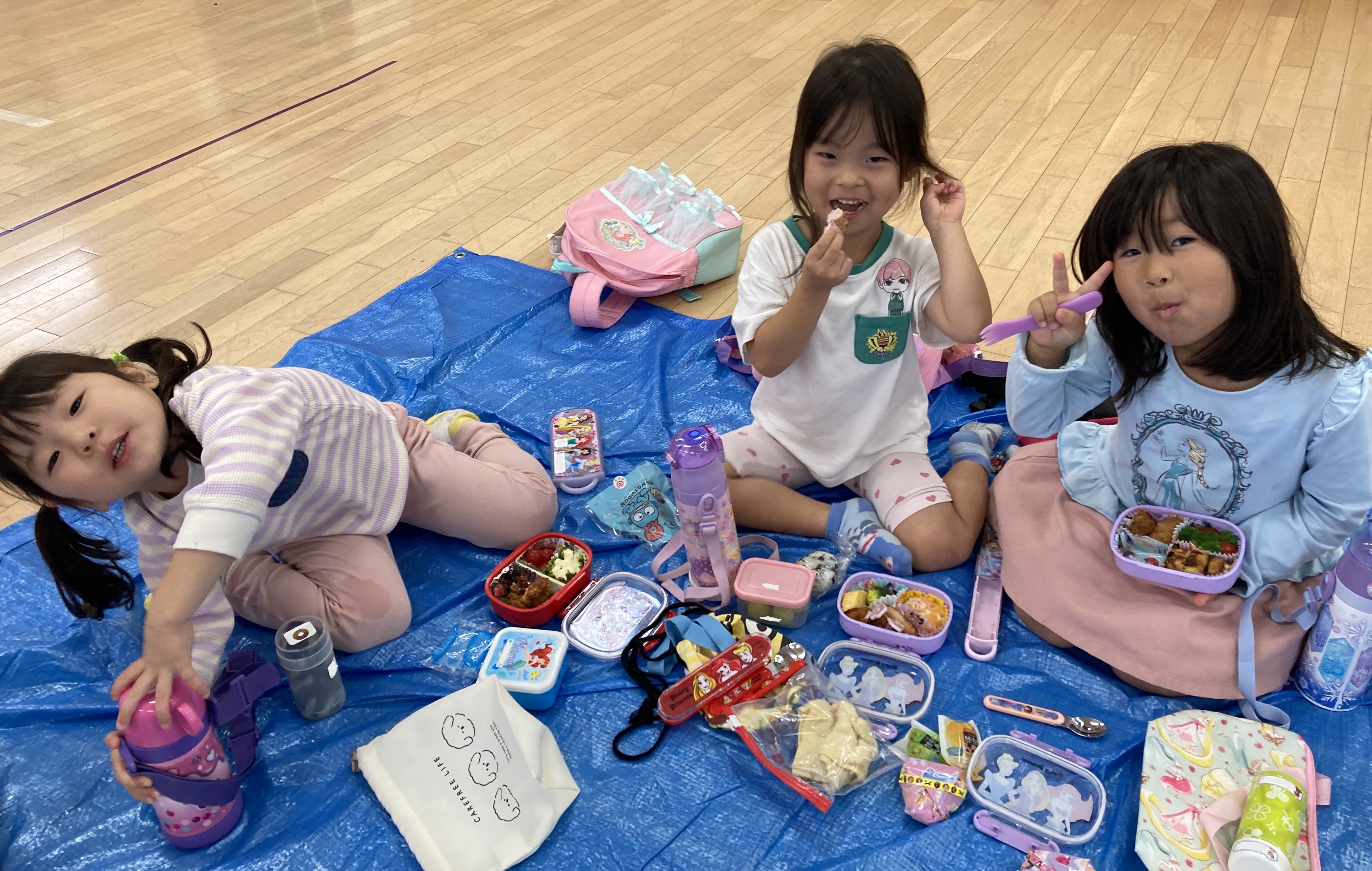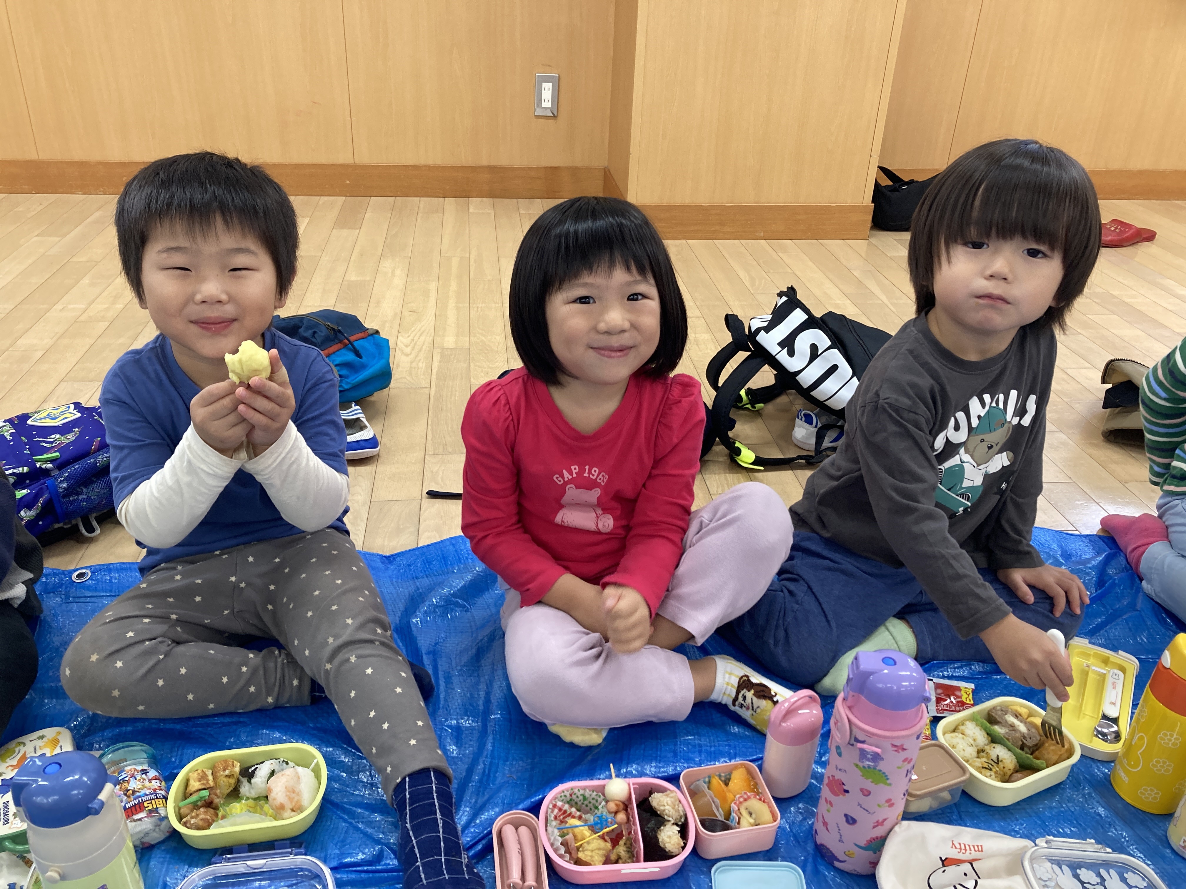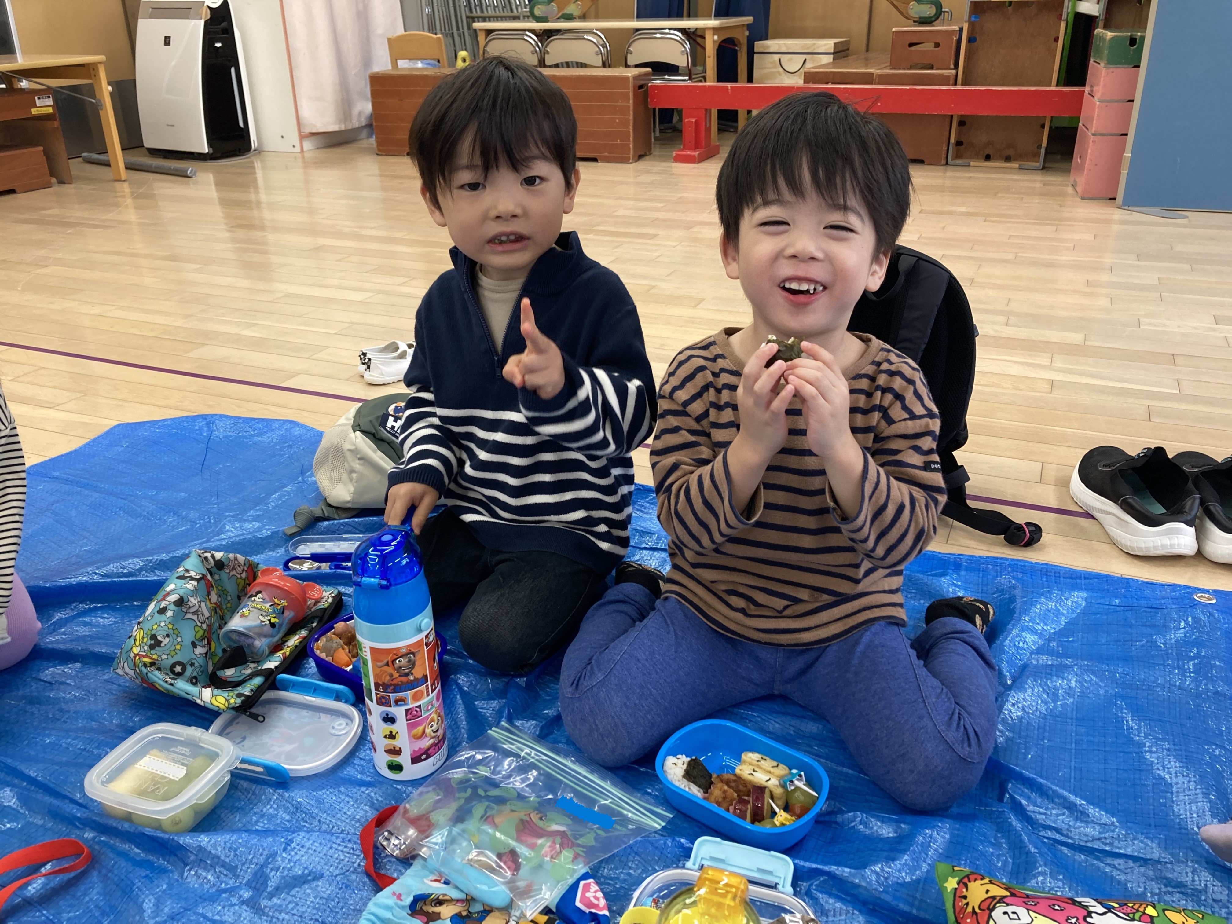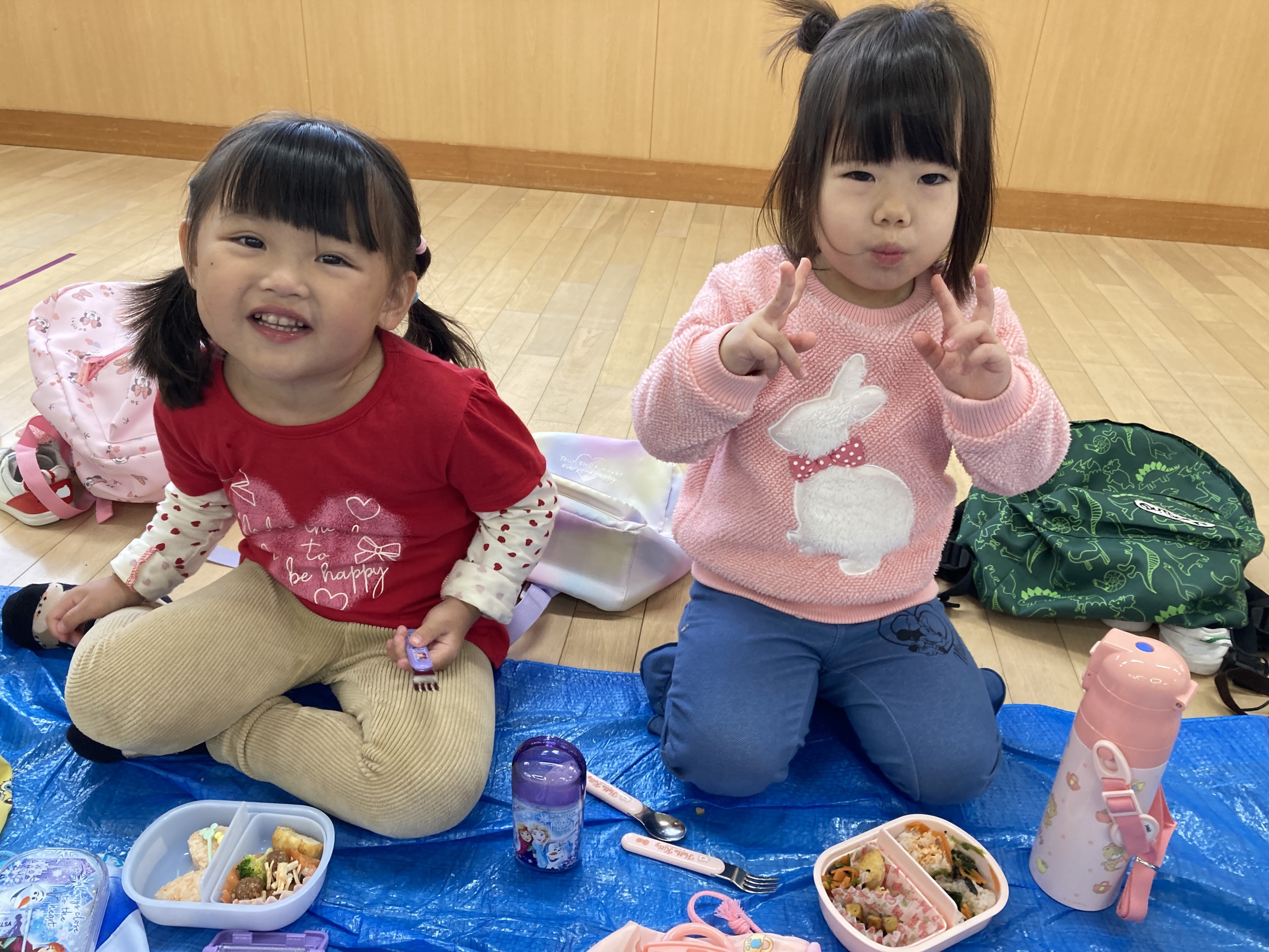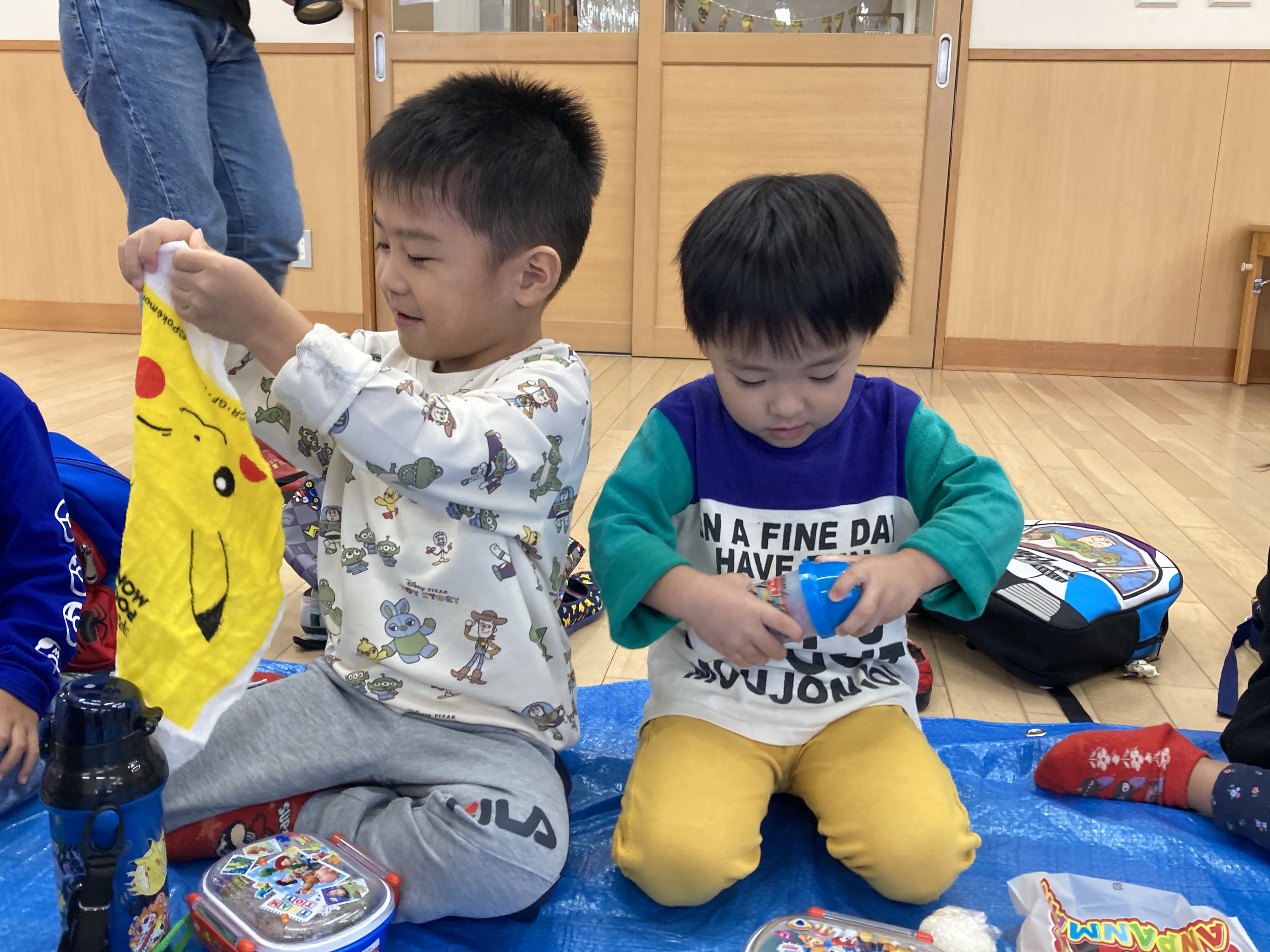 苦戦しながらも自分でおしぼりやお弁当を出して、お友達と一緒に会話を楽しみながら食べていました!