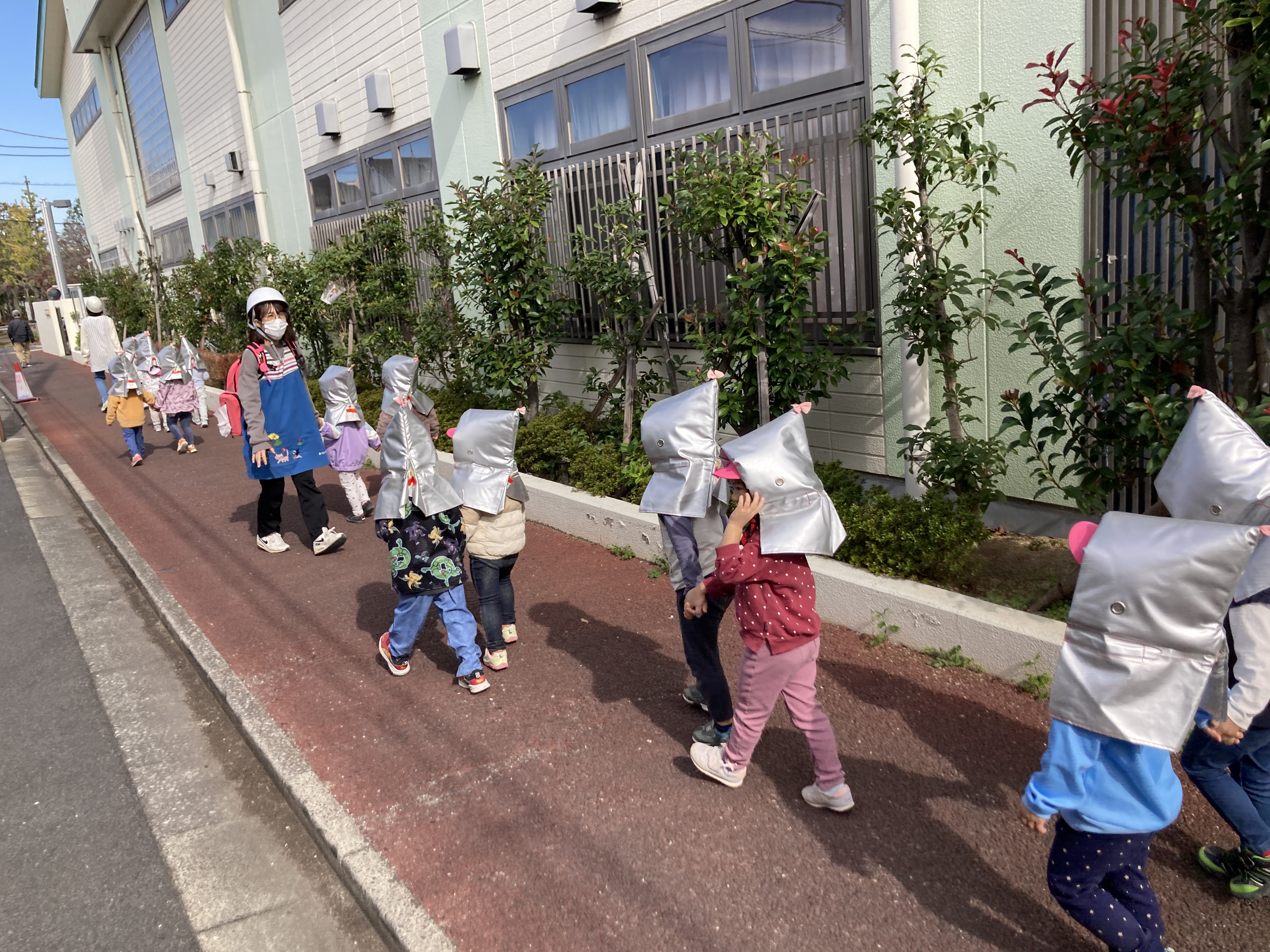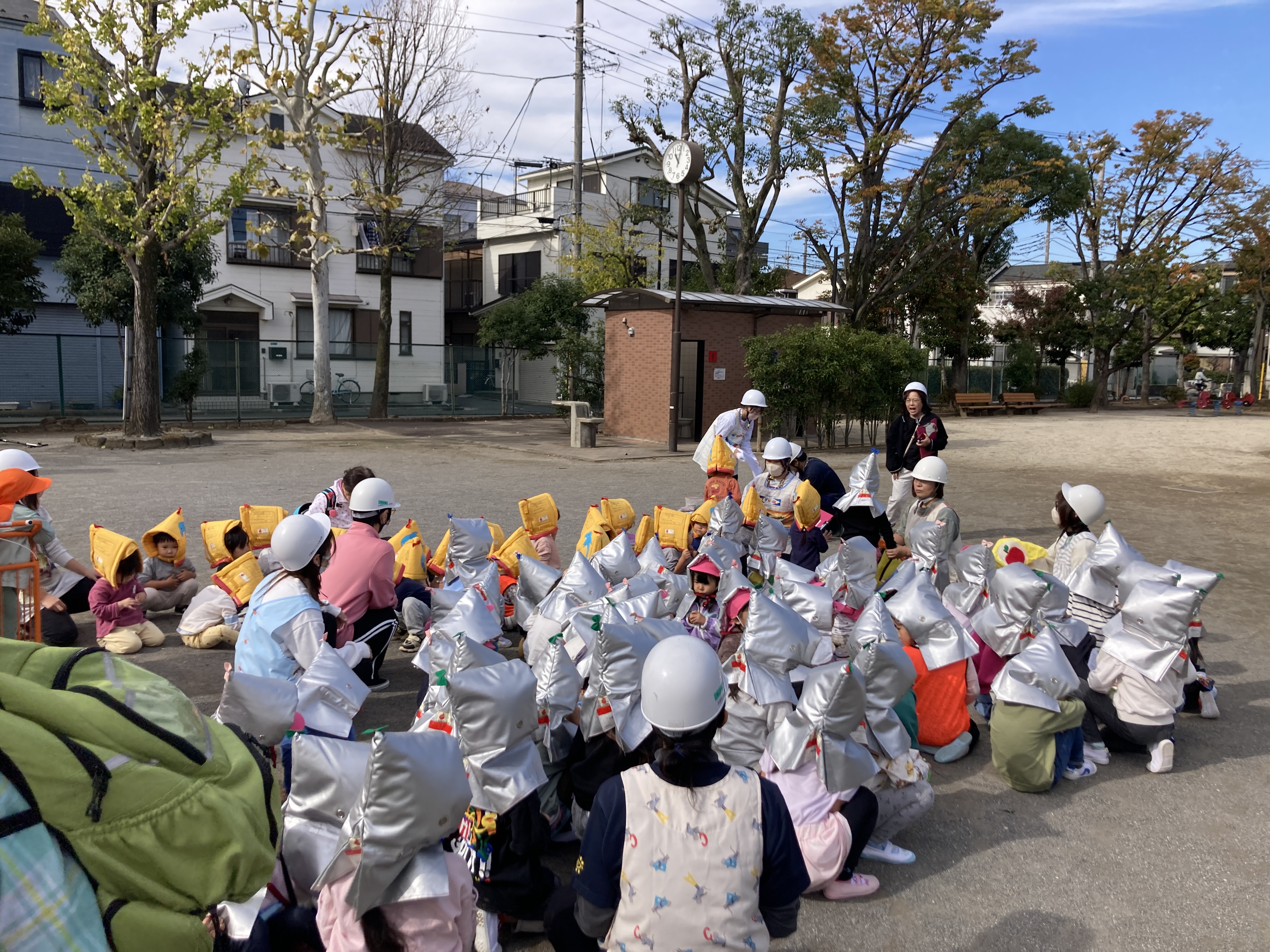 訓練は震度6の地震発生後、園舎内でのガラス破損等があった事を想定し、近隣の公園に避難しました。