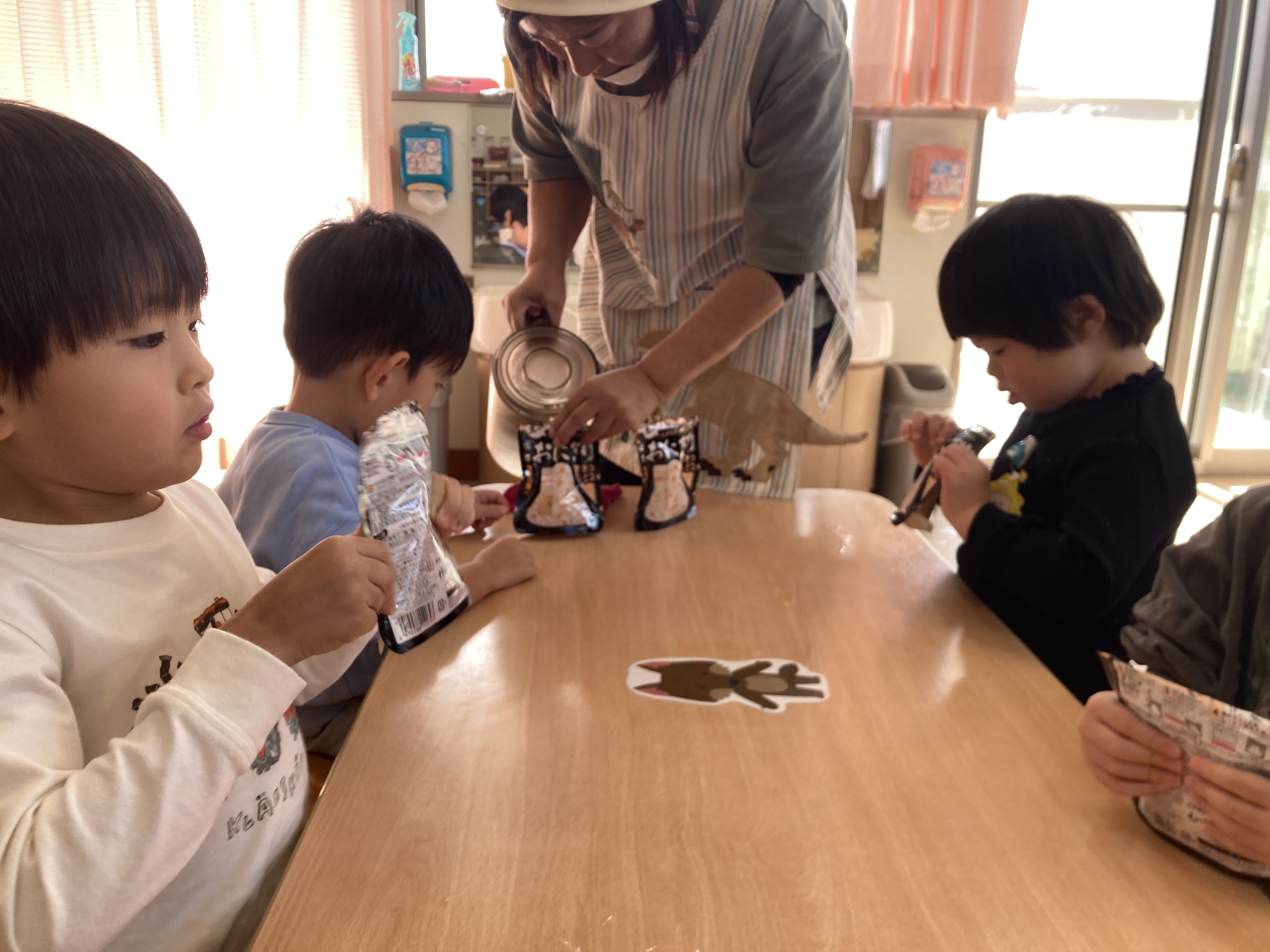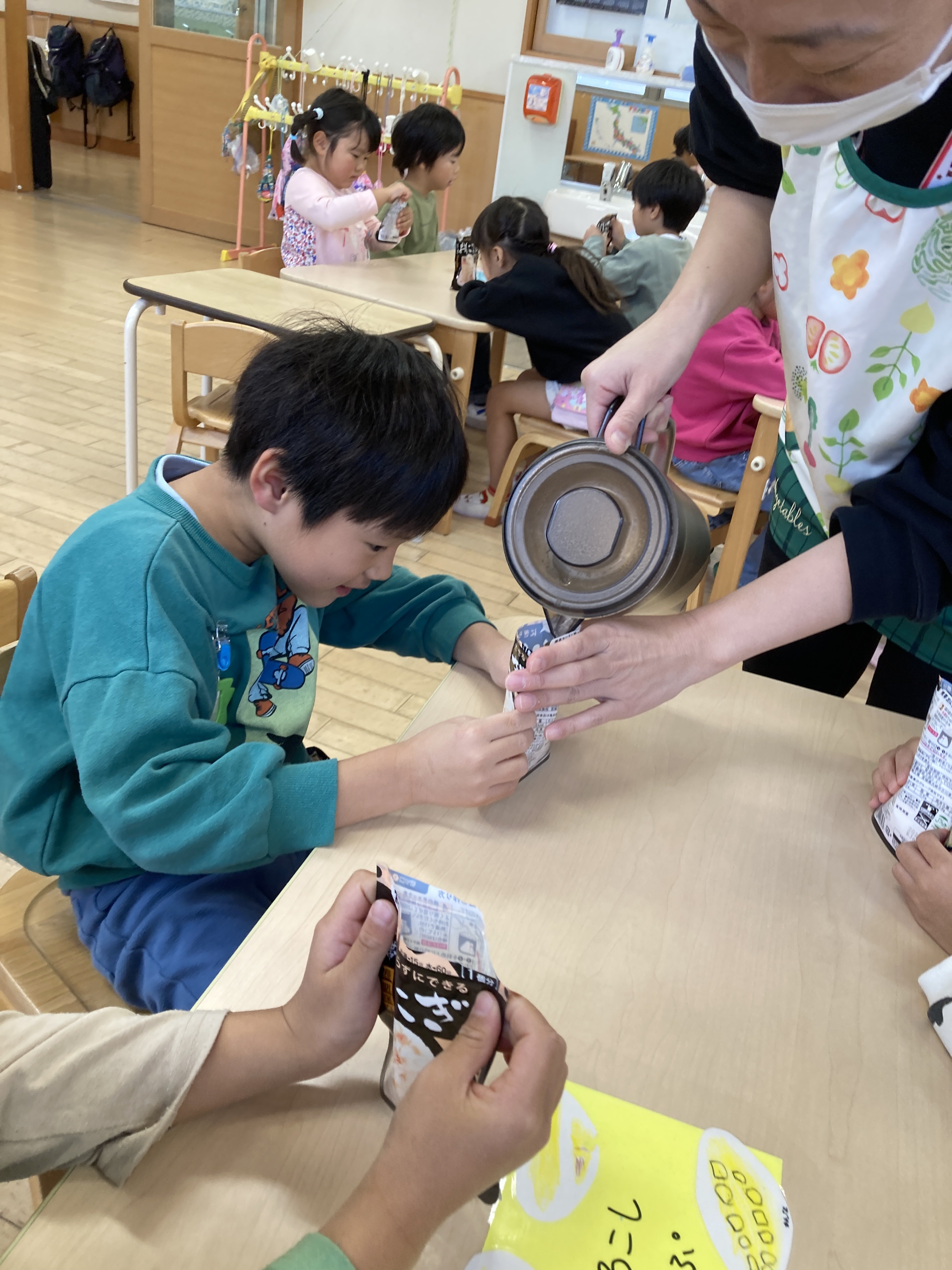 4歳児、5歳児は実際に水を入れて、調理体験。「ほんとにこれでできるの?」との声もありましたが