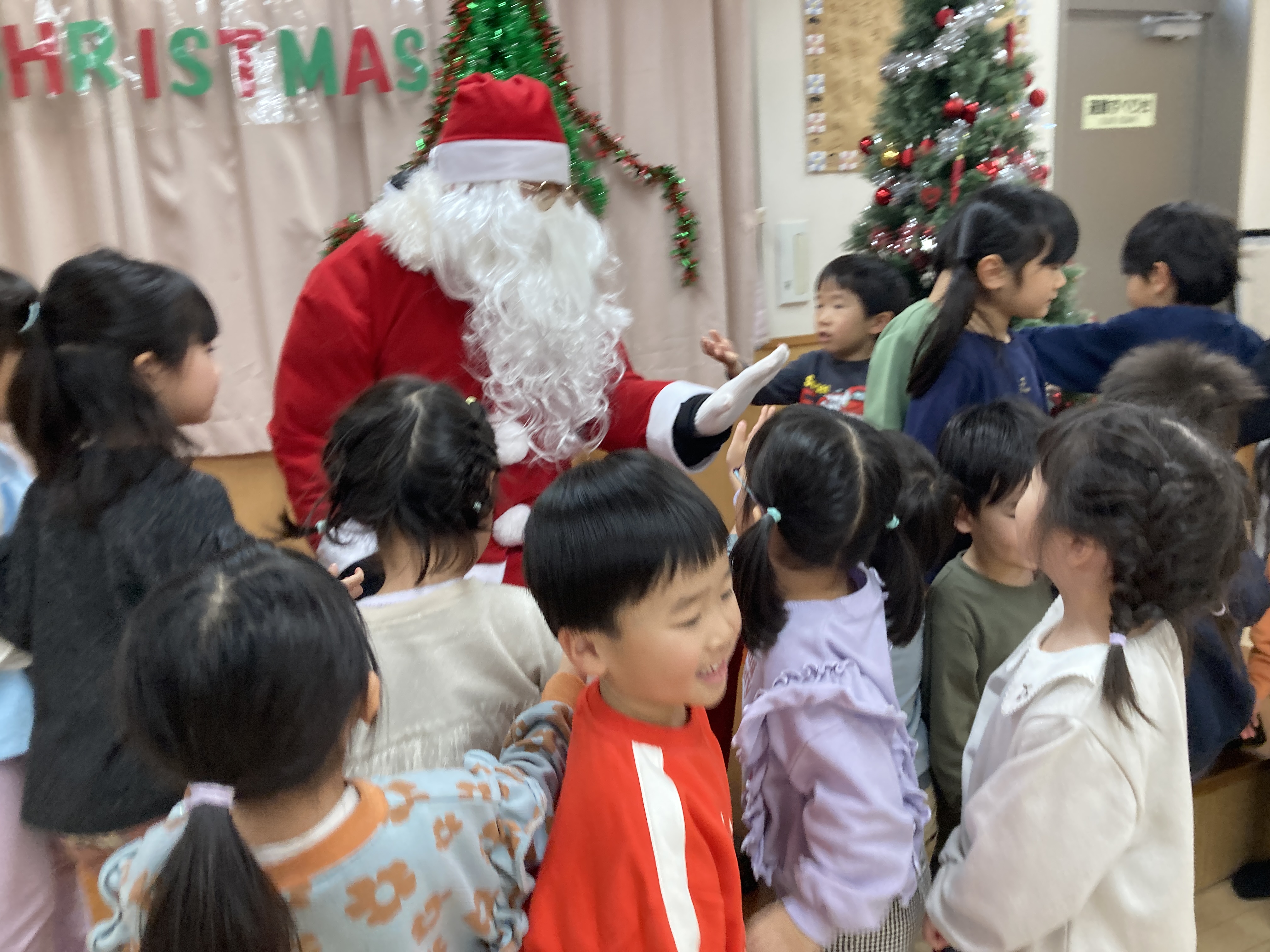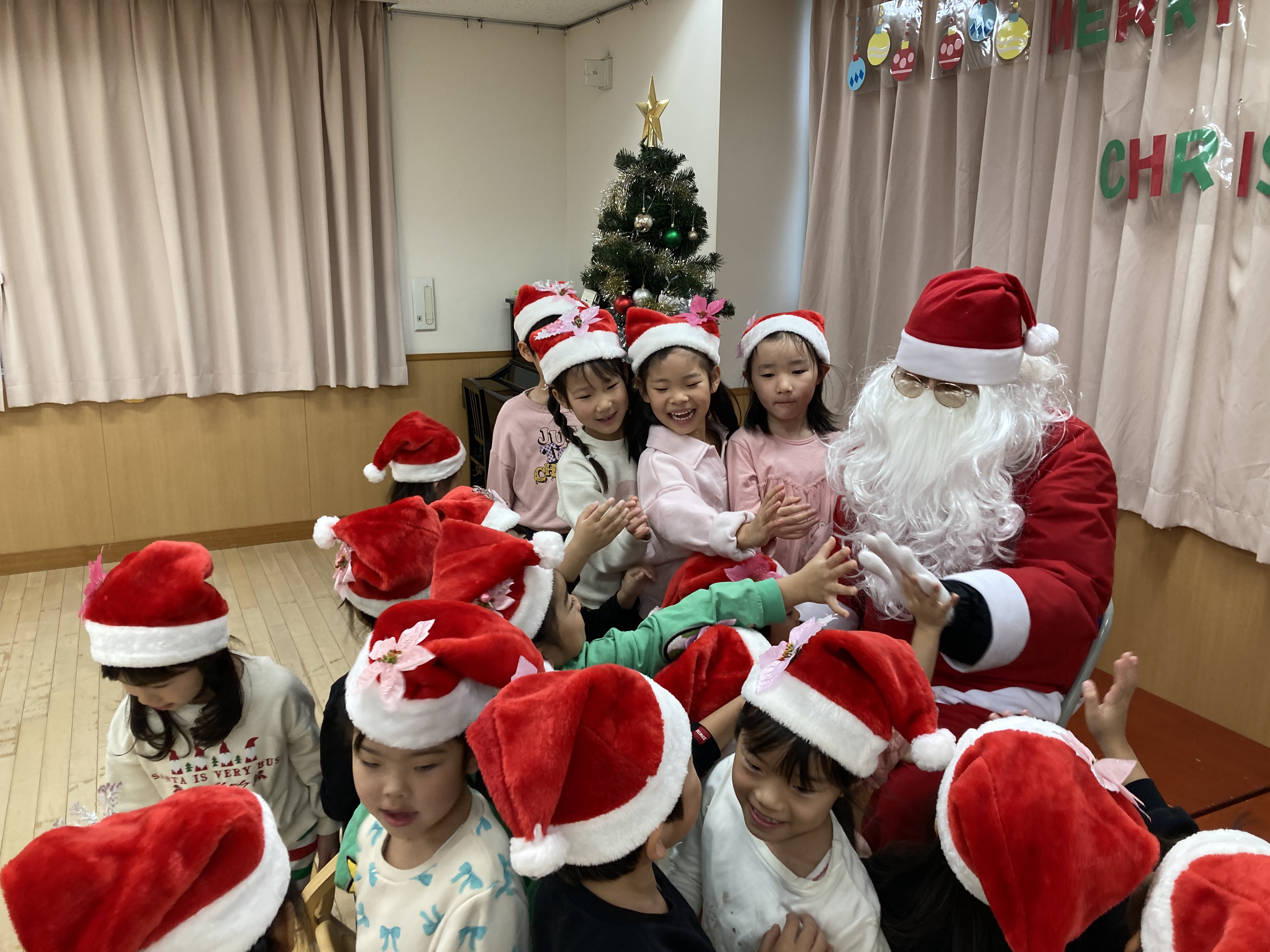 サンタさんから『皆のお部屋にプレゼント置いてきたよ!』というお話を聞くと、「やったー!!」と大喜びの子ども達。最後はサンタさんと記念写真を撮り、ハイタッチやバイバイをしました。