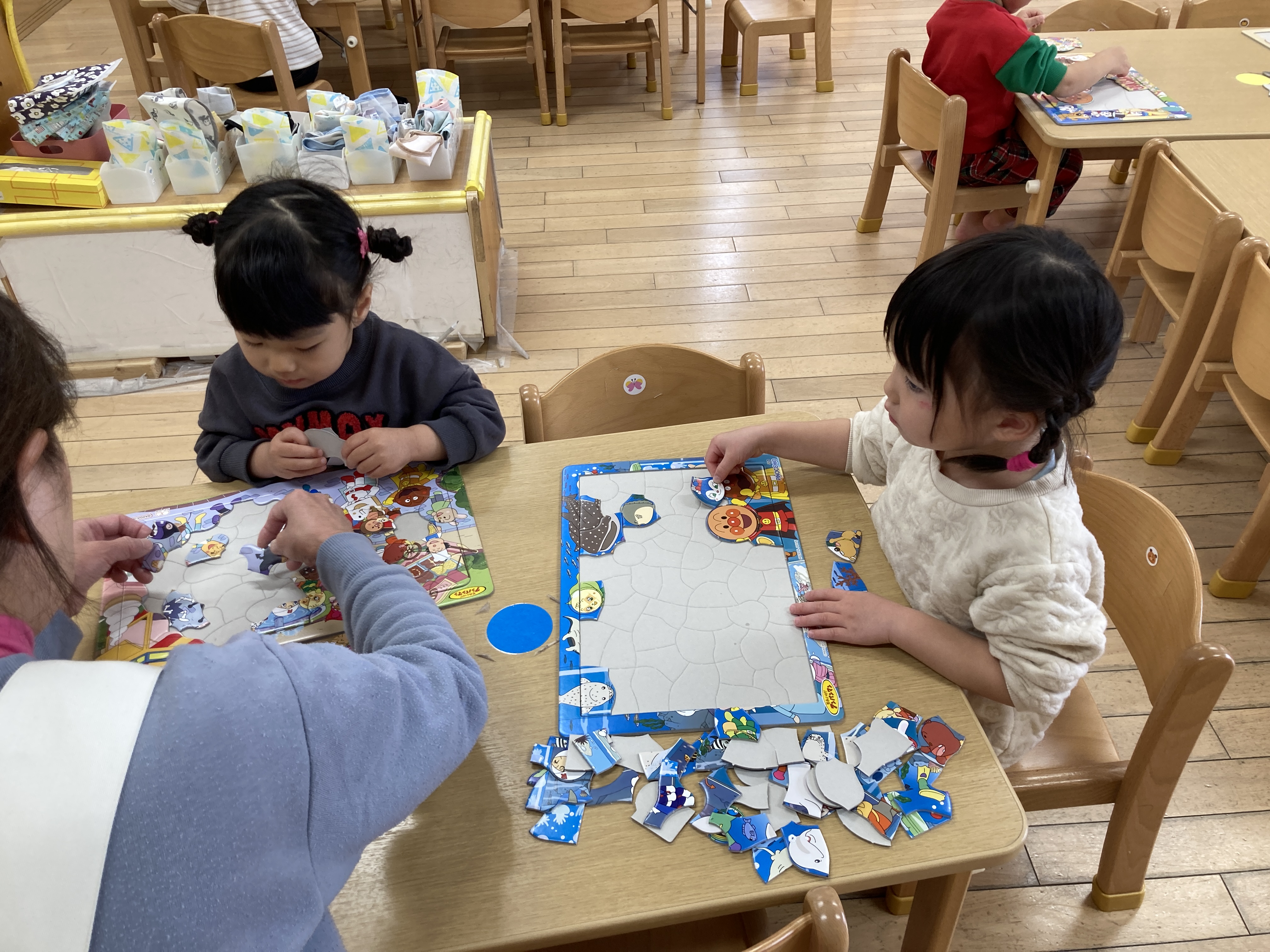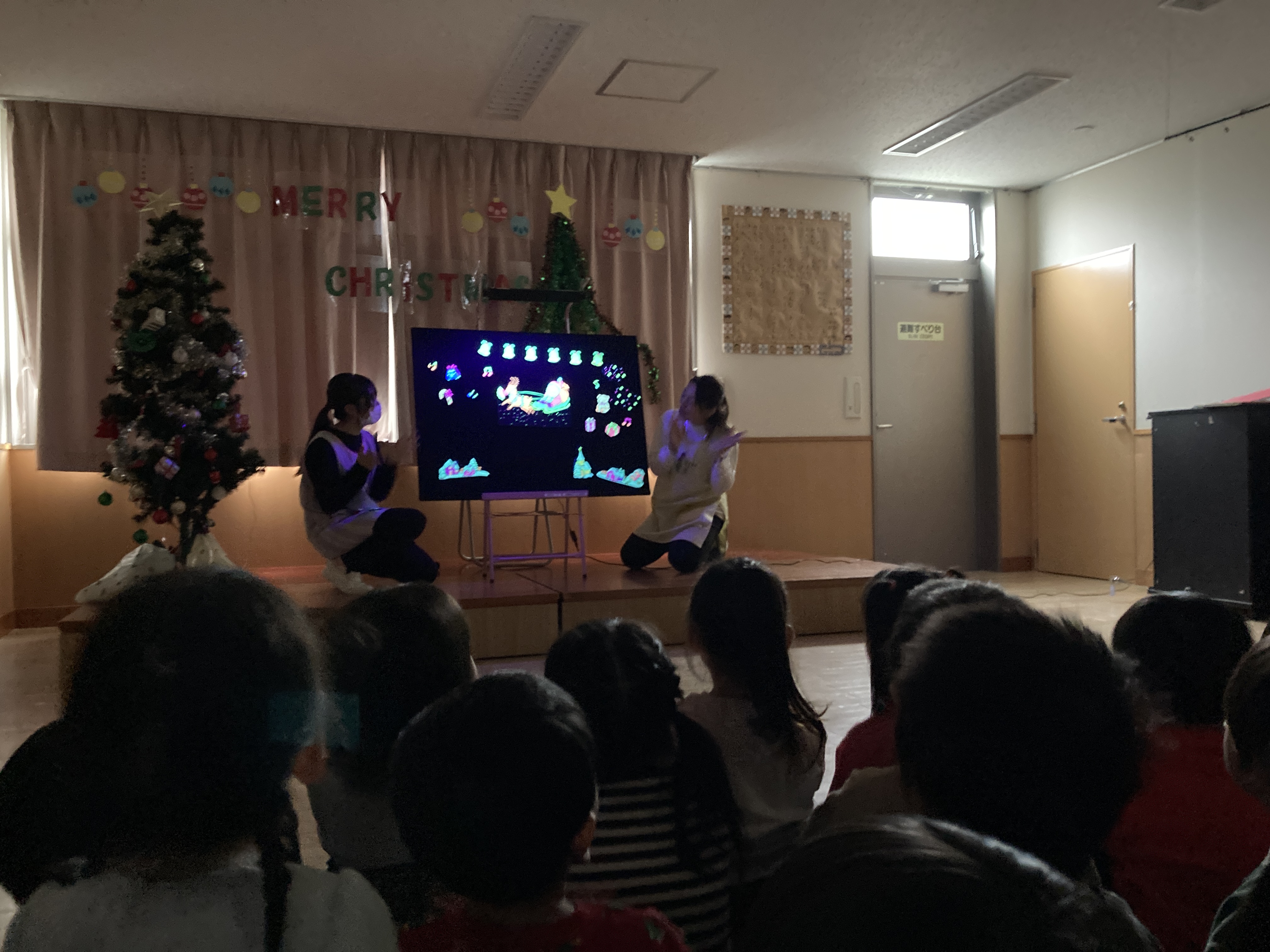 暗いところで光って見えるブラックシアターでは、「赤鼻のトナカイ」「ジングルベル」の歌を歌いながら鑑賞しました。光るサンタさんたちを見て「お~!」と驚き、パネルに集中しながら楽しんで歌っていました。