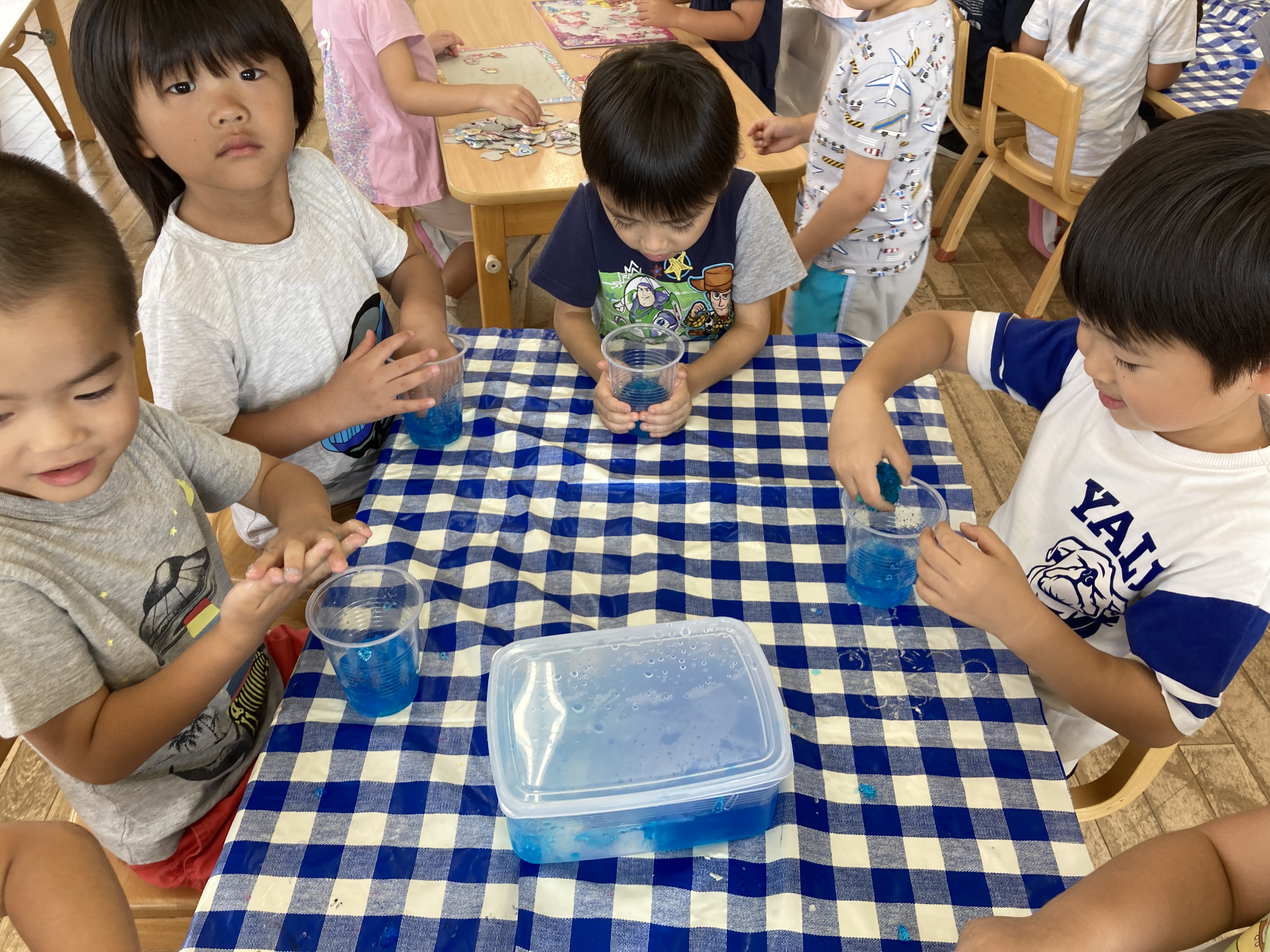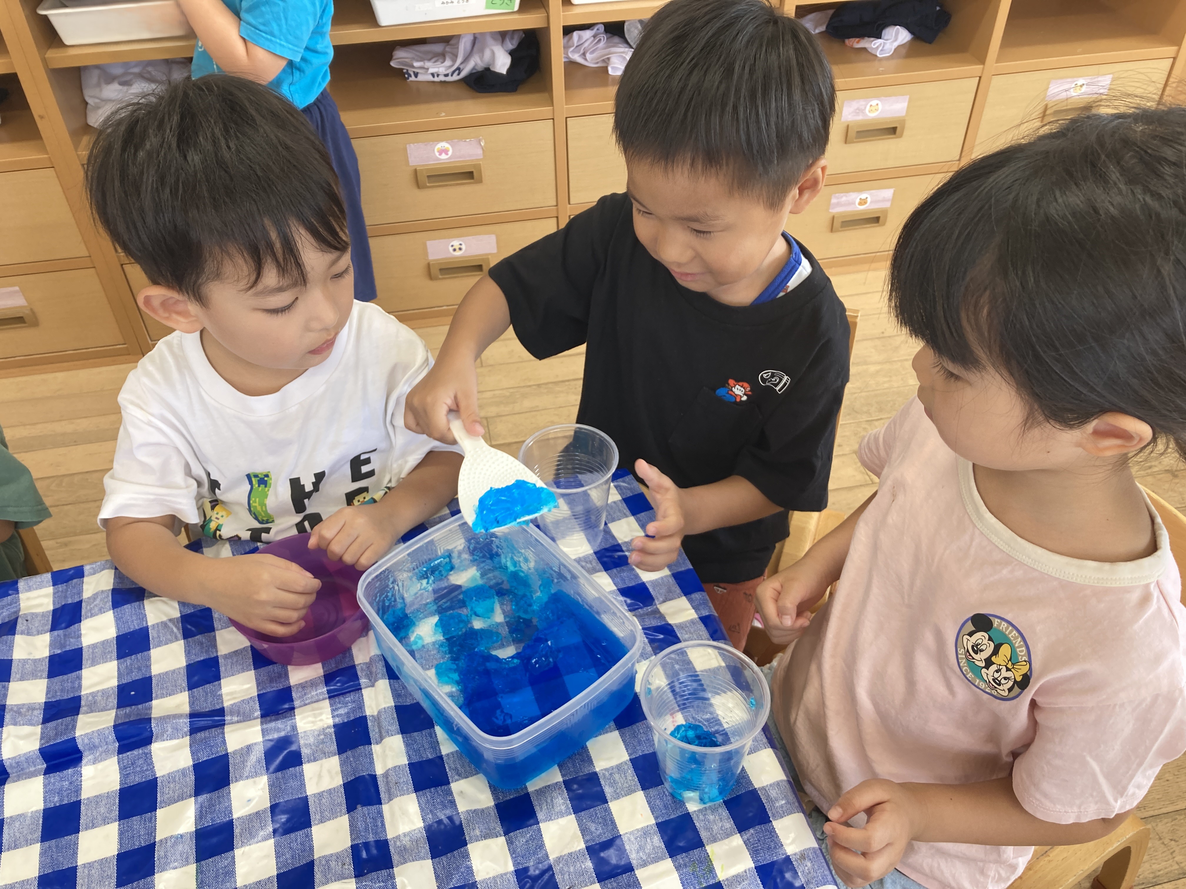 色の変化に気付いたり、寒天では「なんで固まるのか」「触っていくうちに体温で柔らかくなる」という気付もありました。寒天の作り方を教えると、「すごーい」「ゼラチンは魔法の粉だね」「水は色んなことで使えるね」と子ども達は話していました。