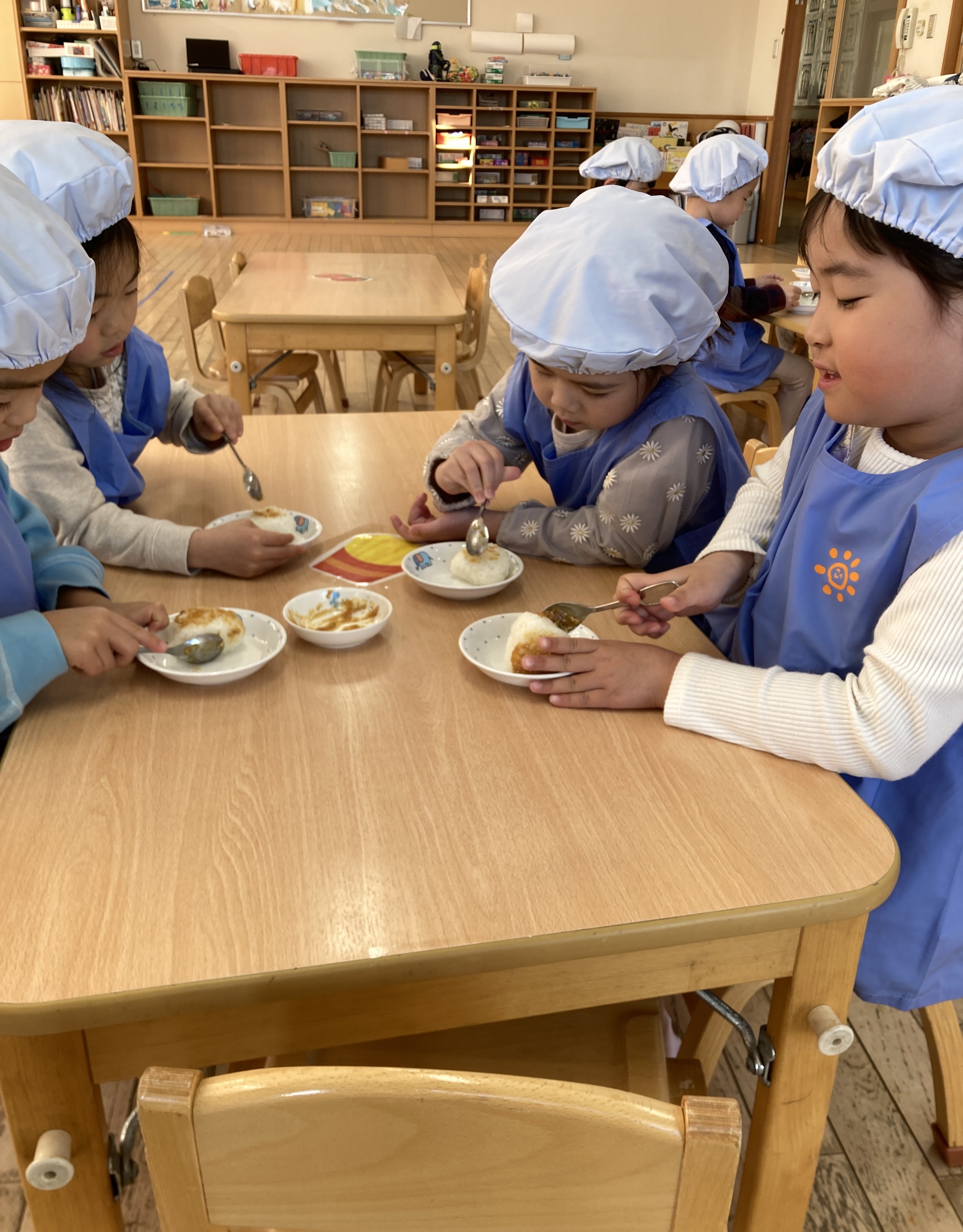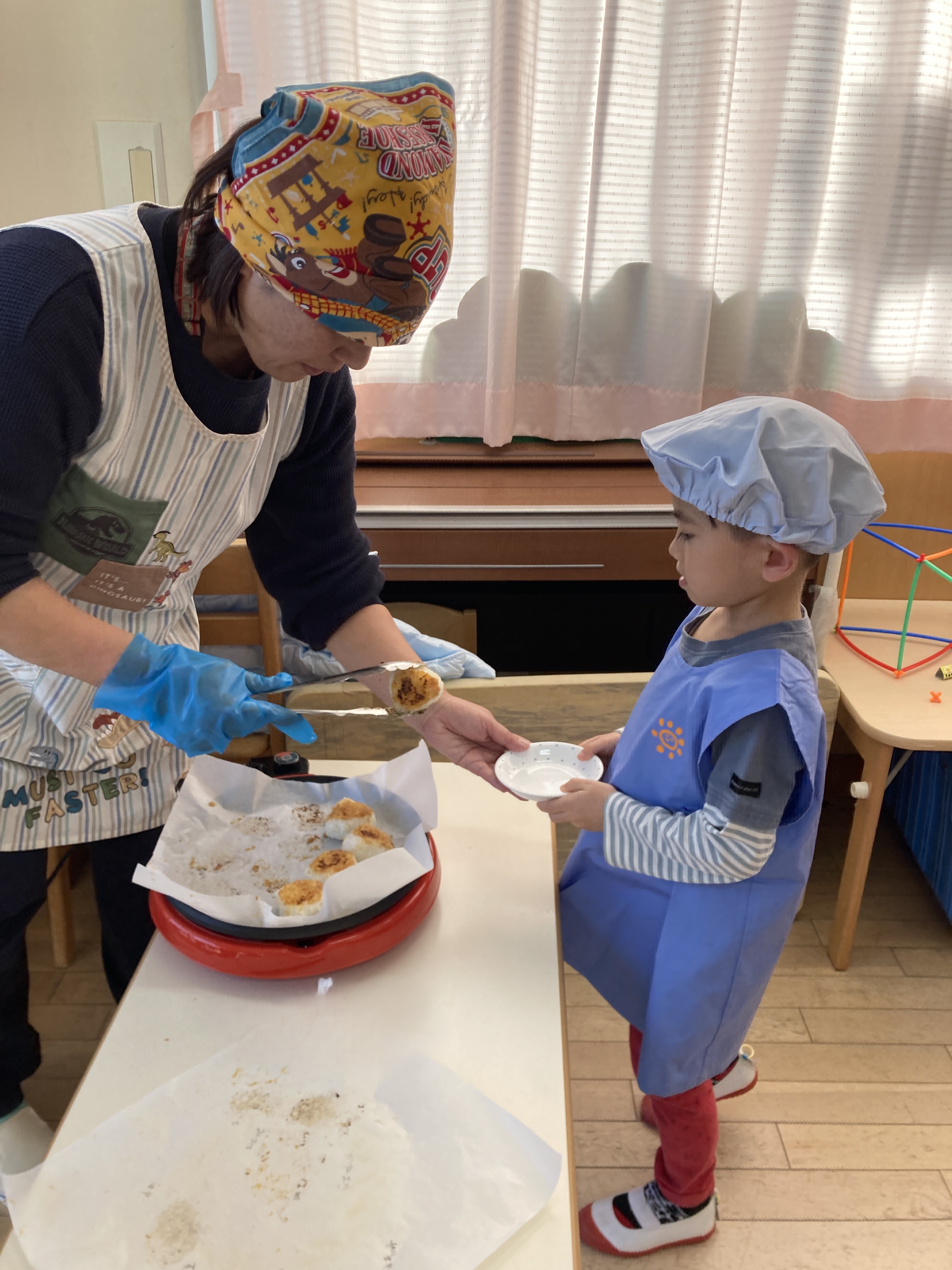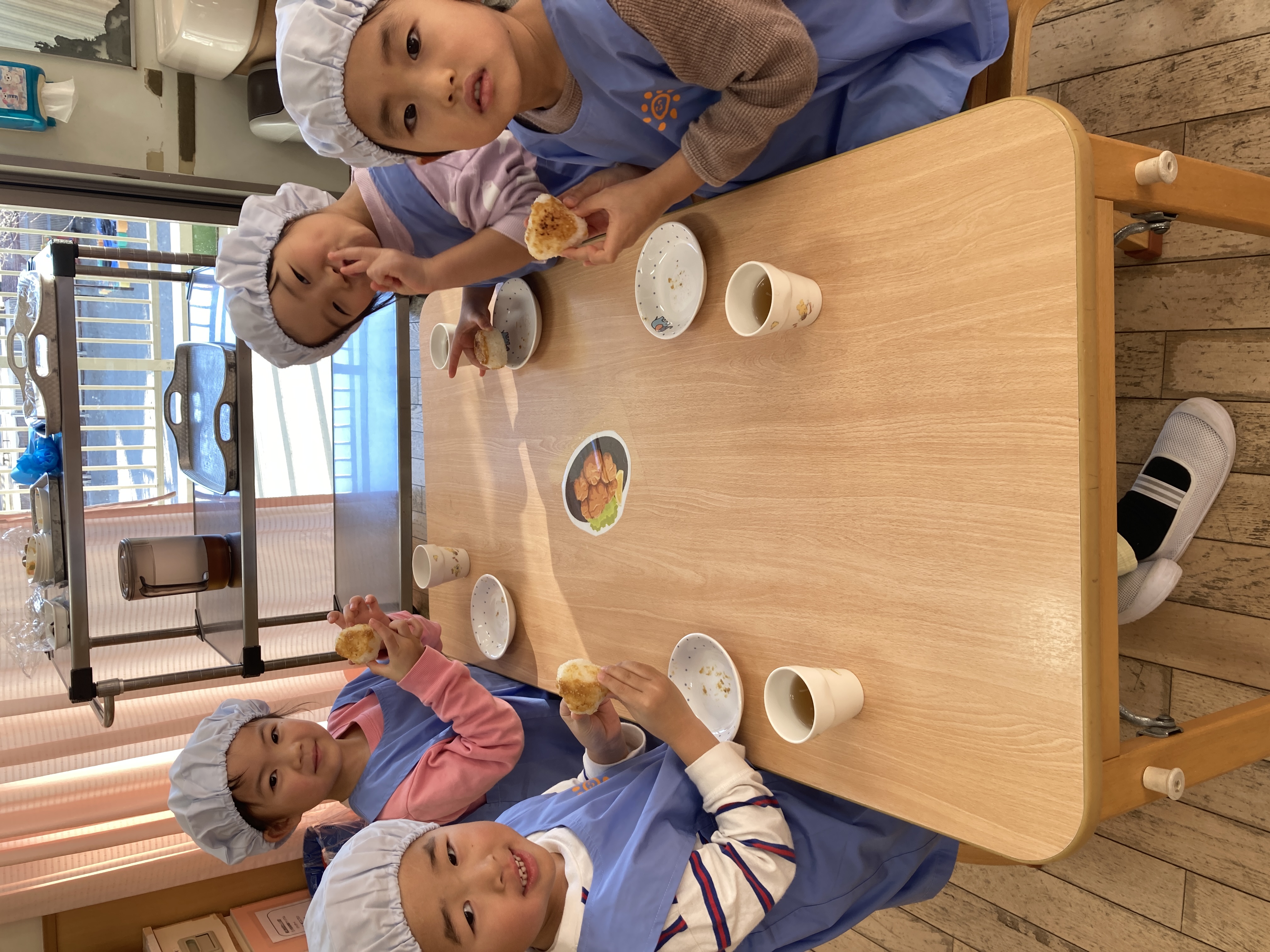 今日のおやつはみそ焼きおにぎりで、ぶどう組はクッキングをしました。