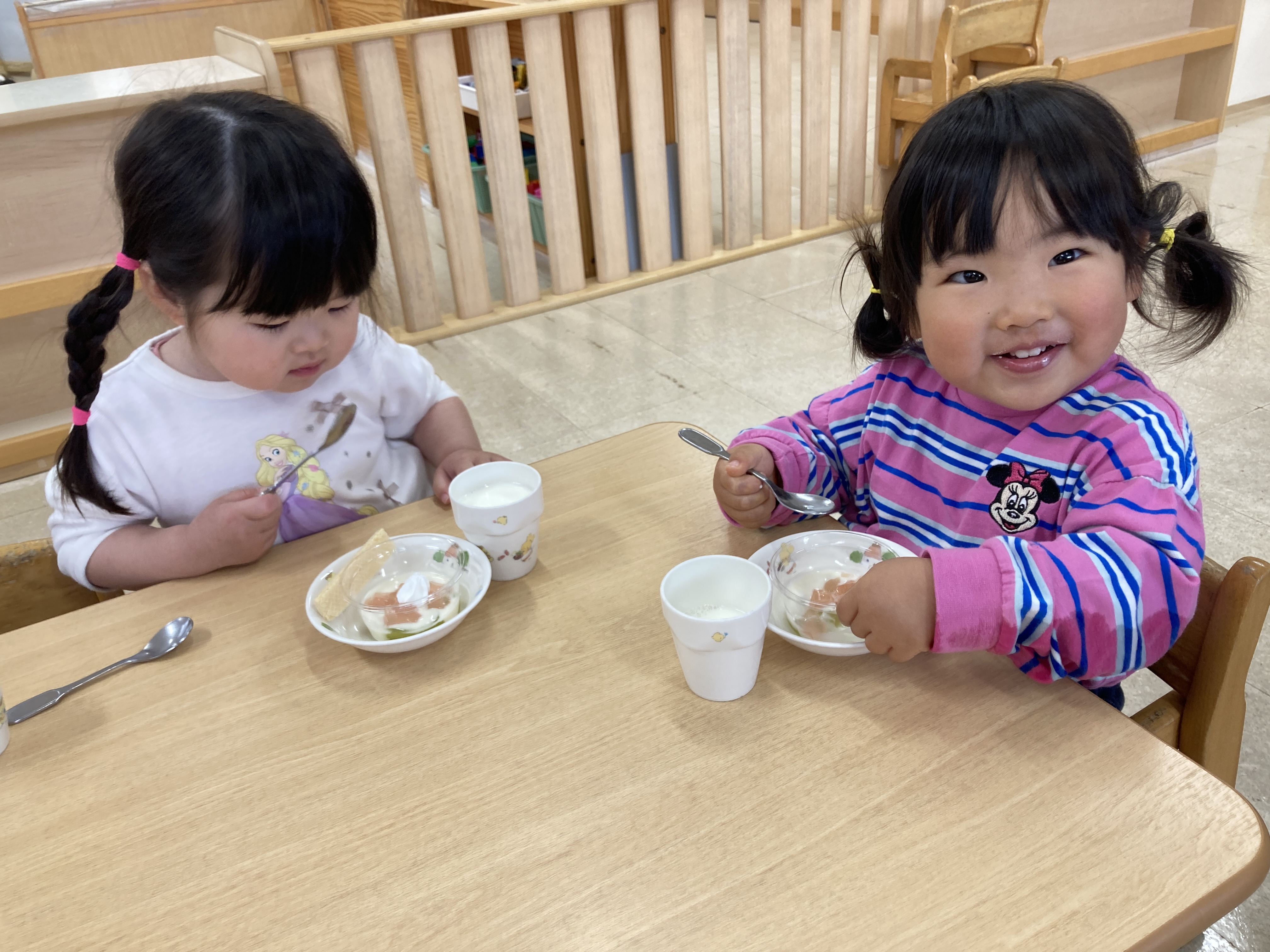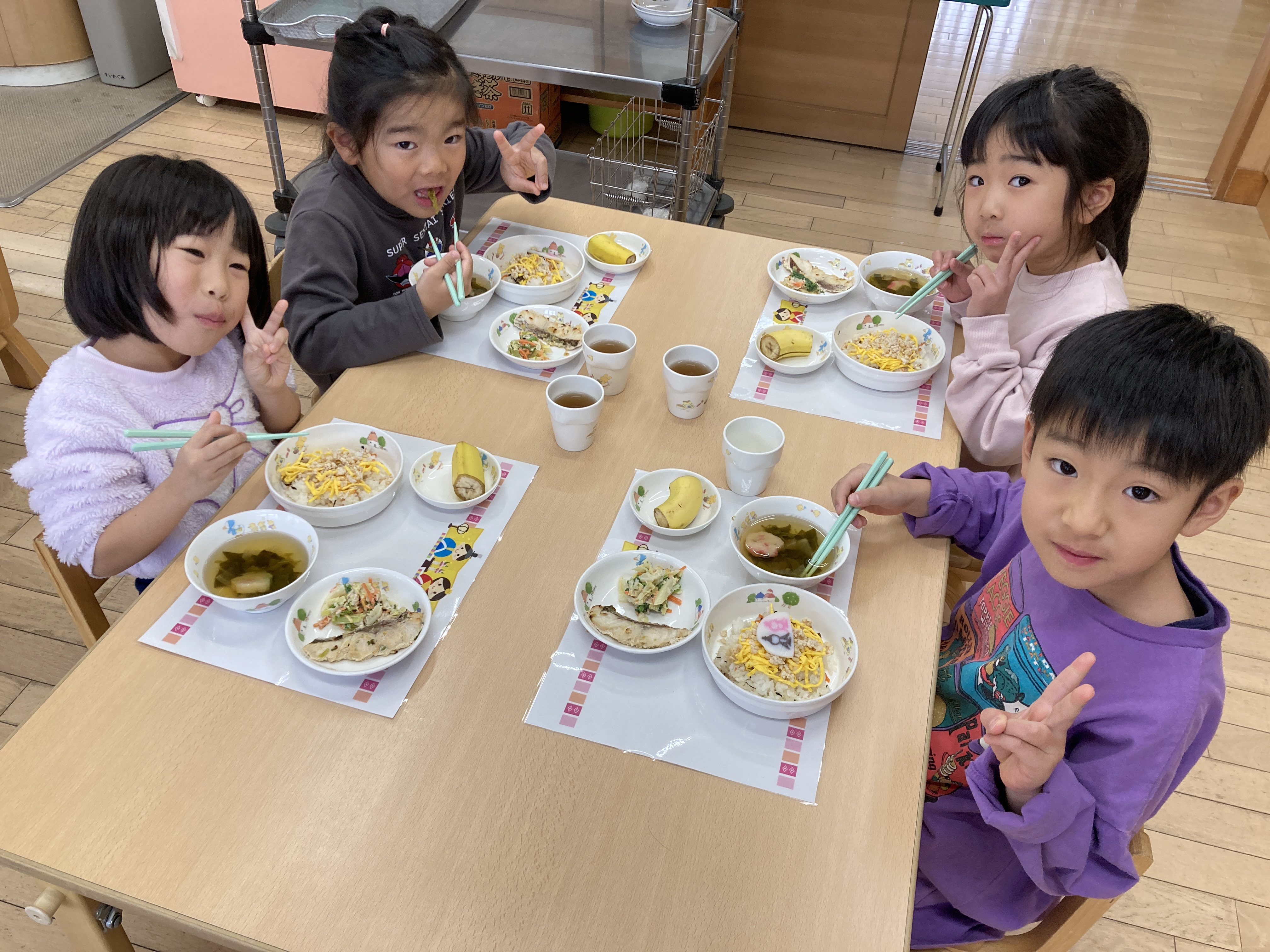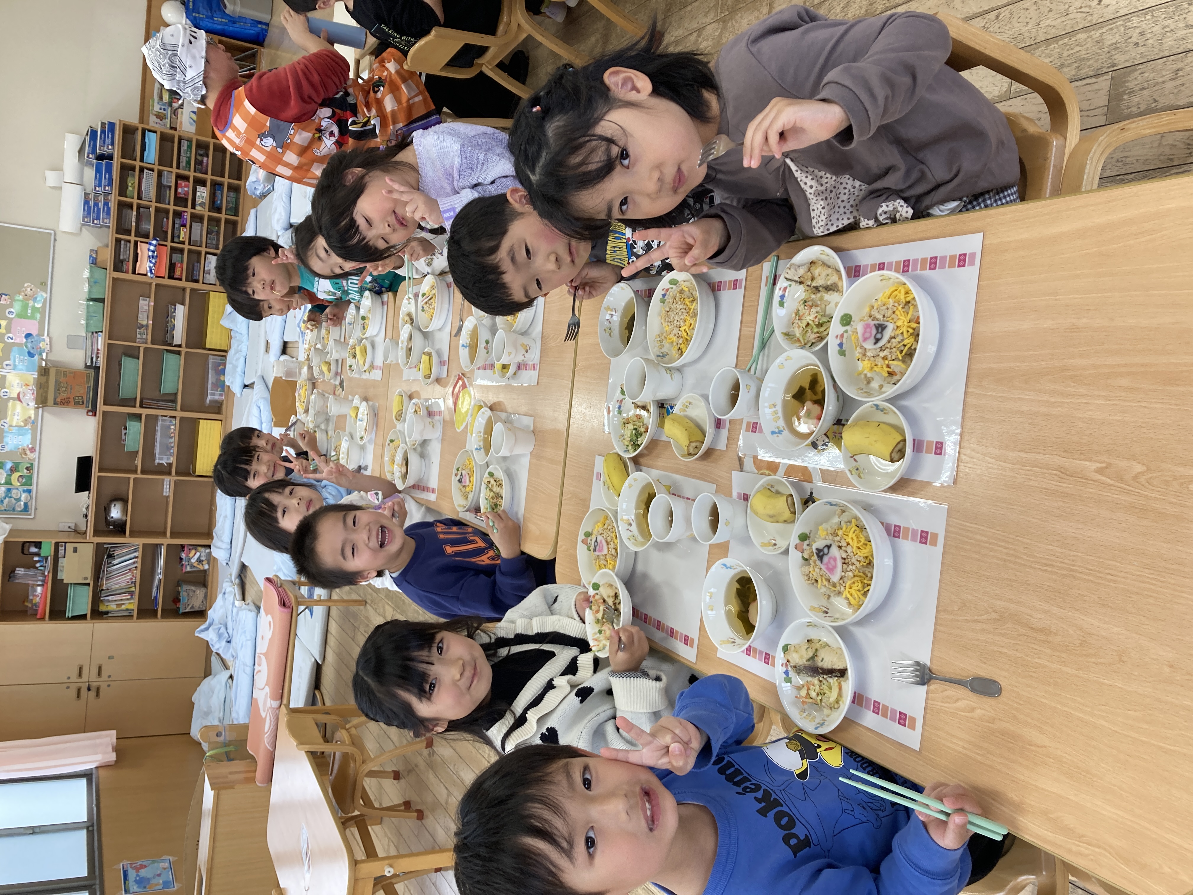 目にも鮮やかなお給食に「すごーい!美味しそうだね♪」とお友だちとお顔を見合わせワクワク♪
