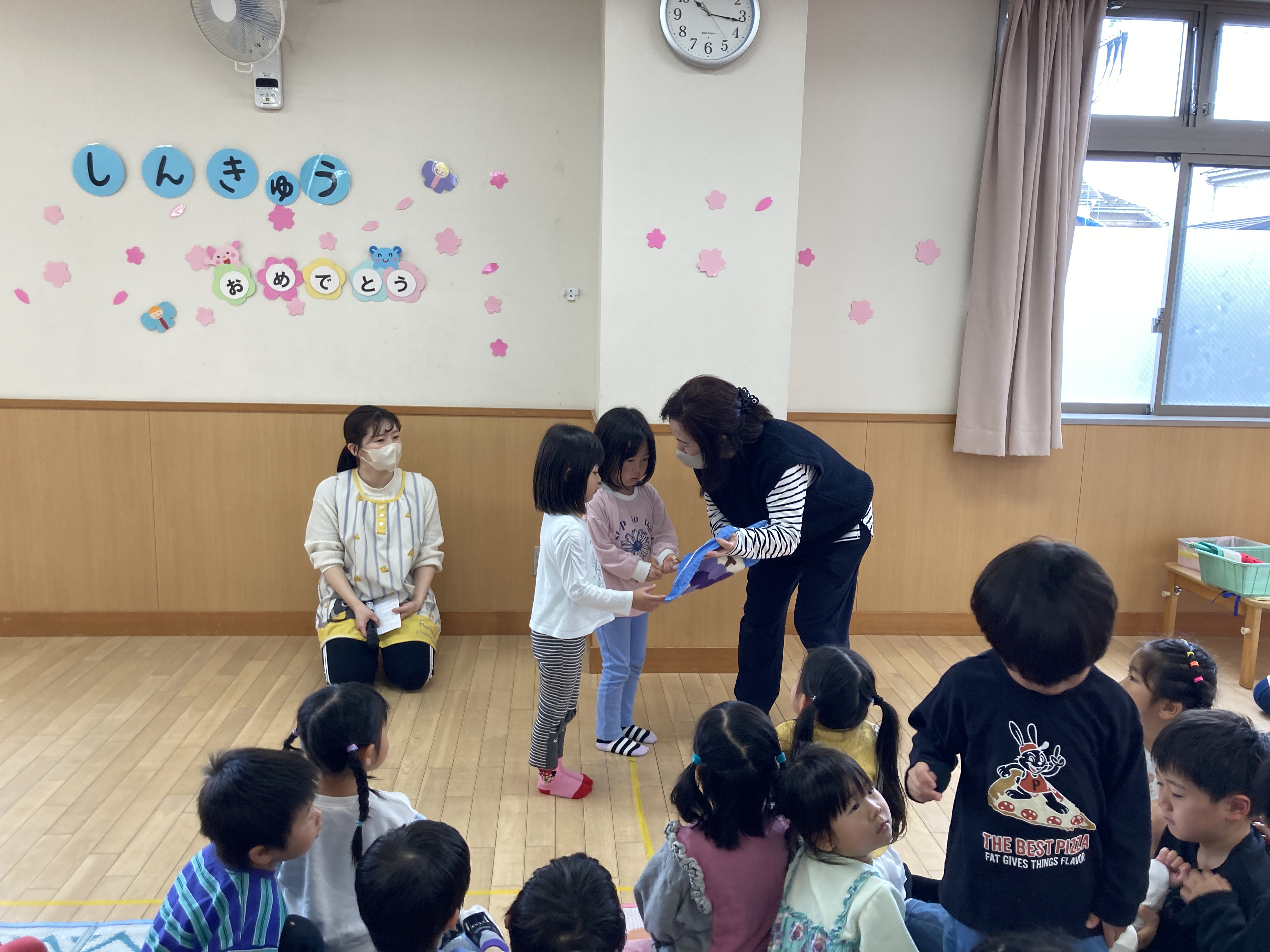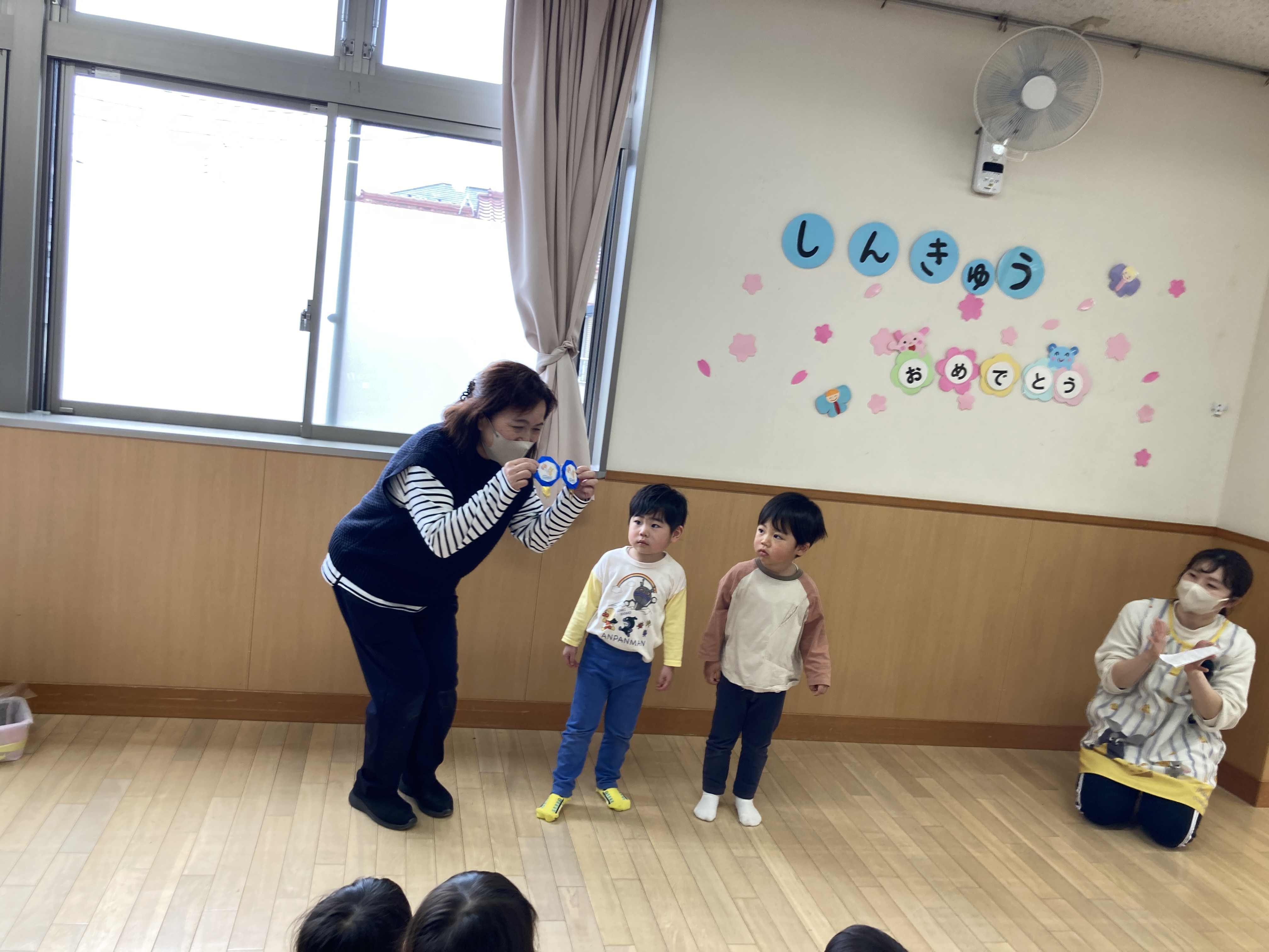 4月からすいか組になるぶどう組は園長先生から1人ずつバッチを貰って