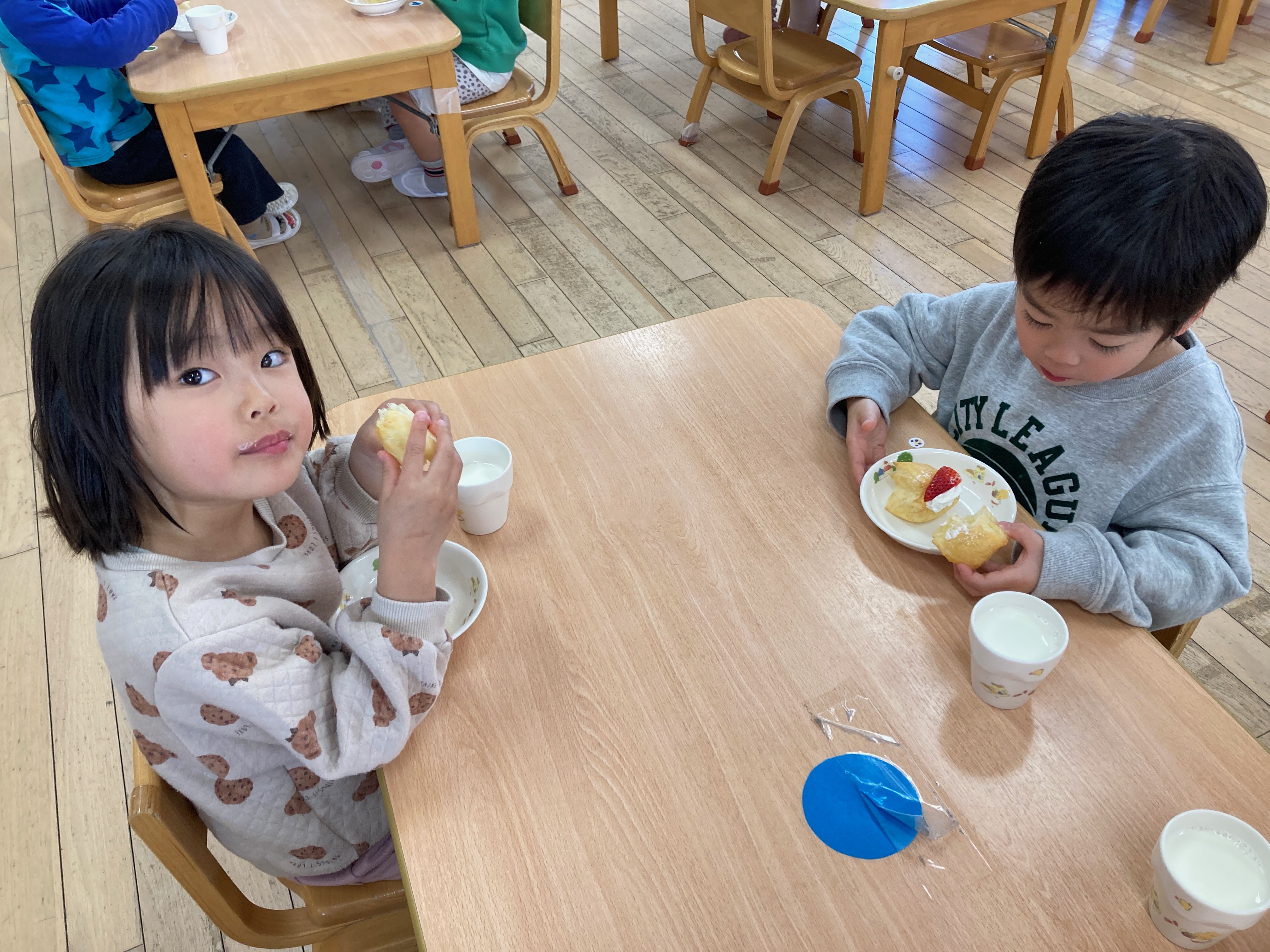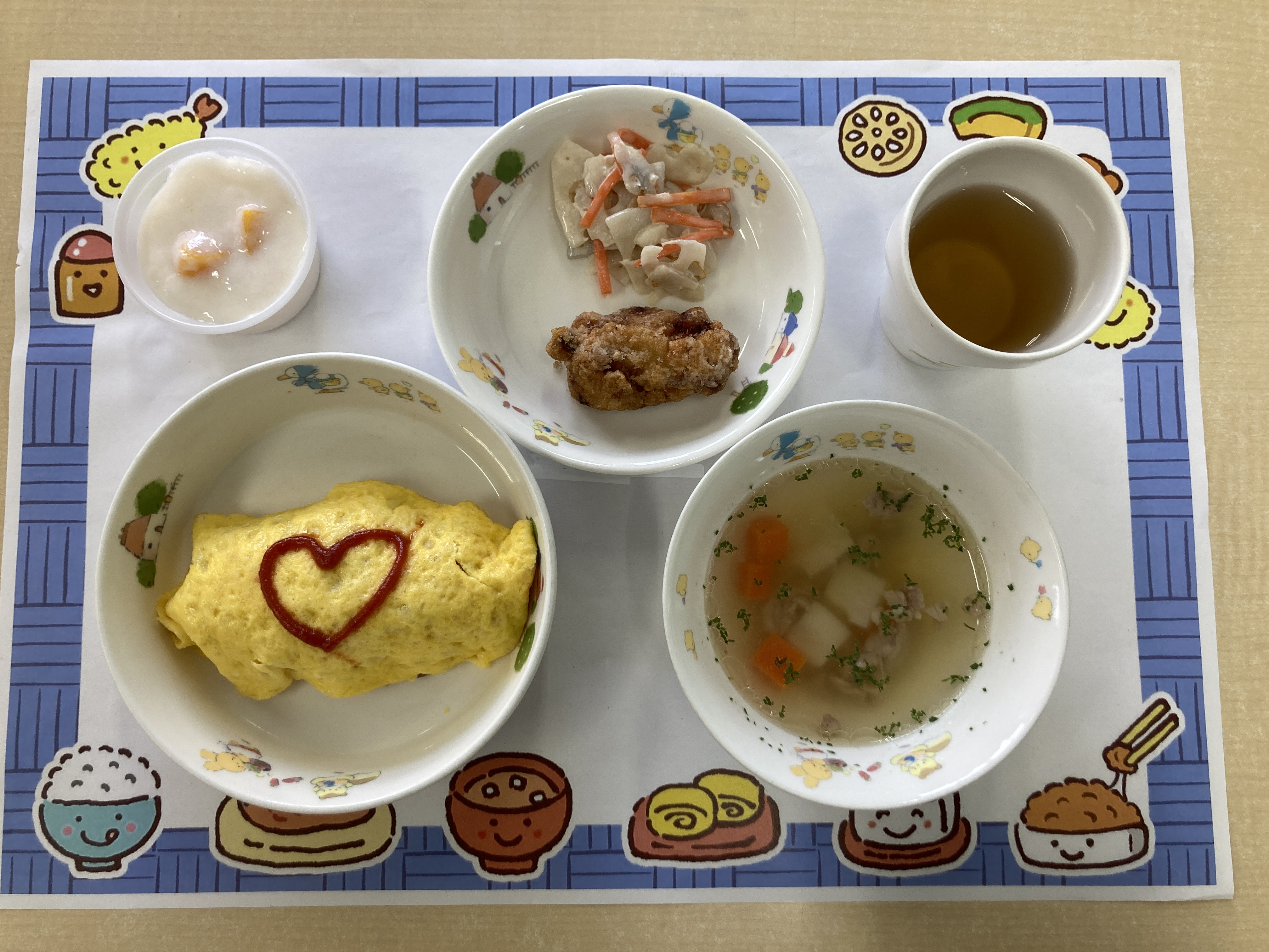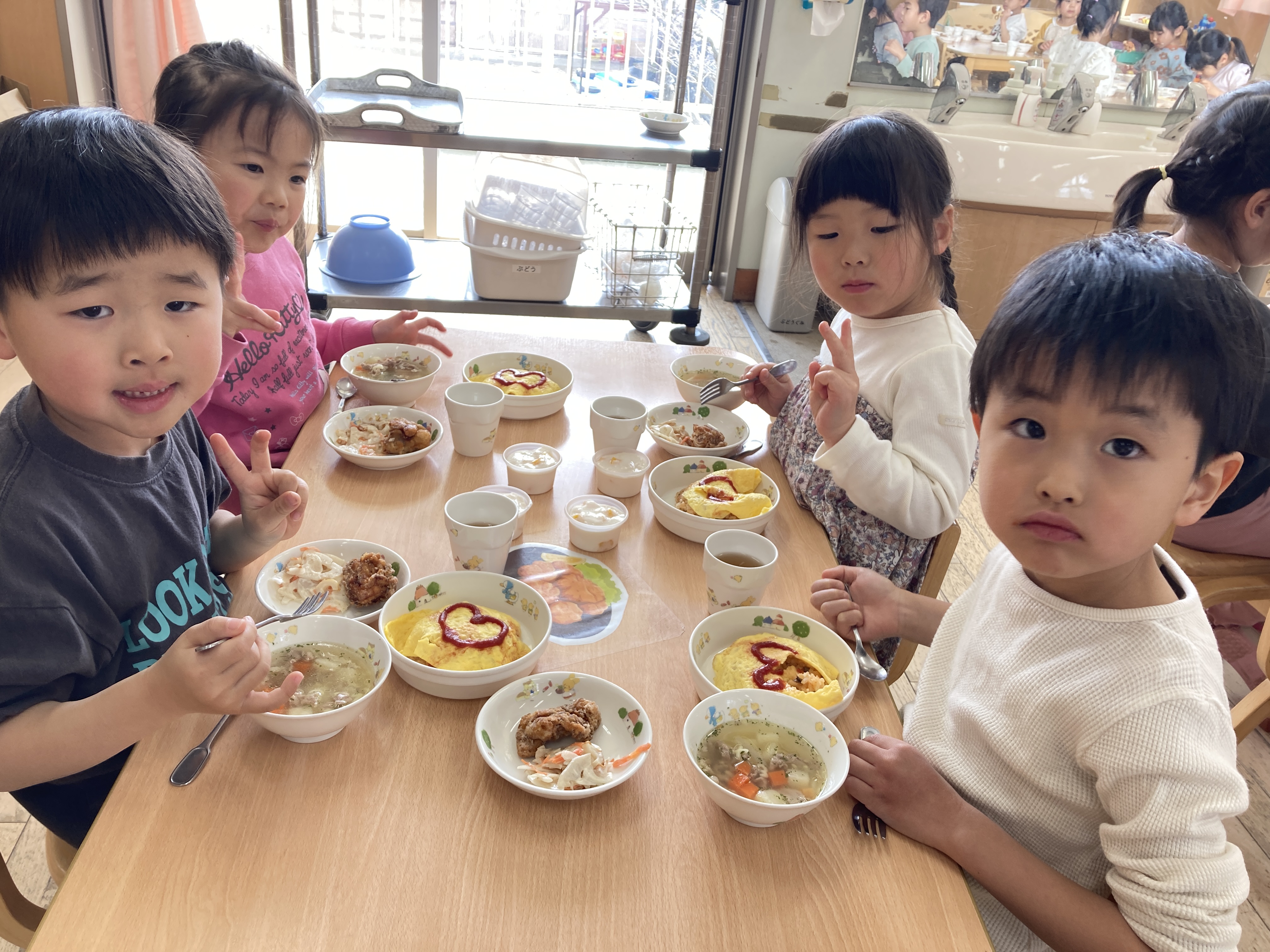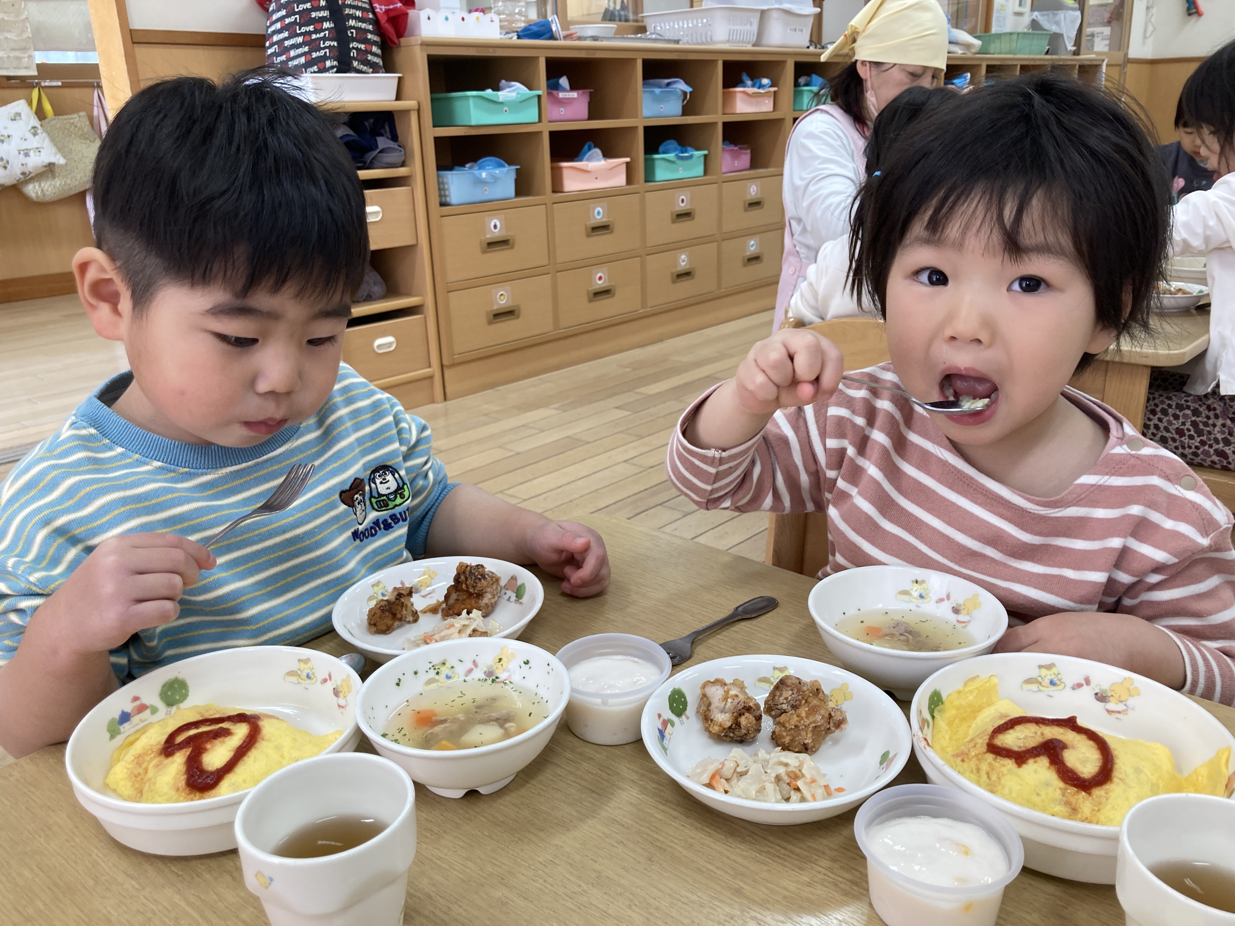 「ハートかわいいー」「からあげもあるー」「ABCスープだ」とどれから食べようかわくわくの表情の子ども達。ニコニコ笑顔で嬉しそうに食べる姿が見られました。