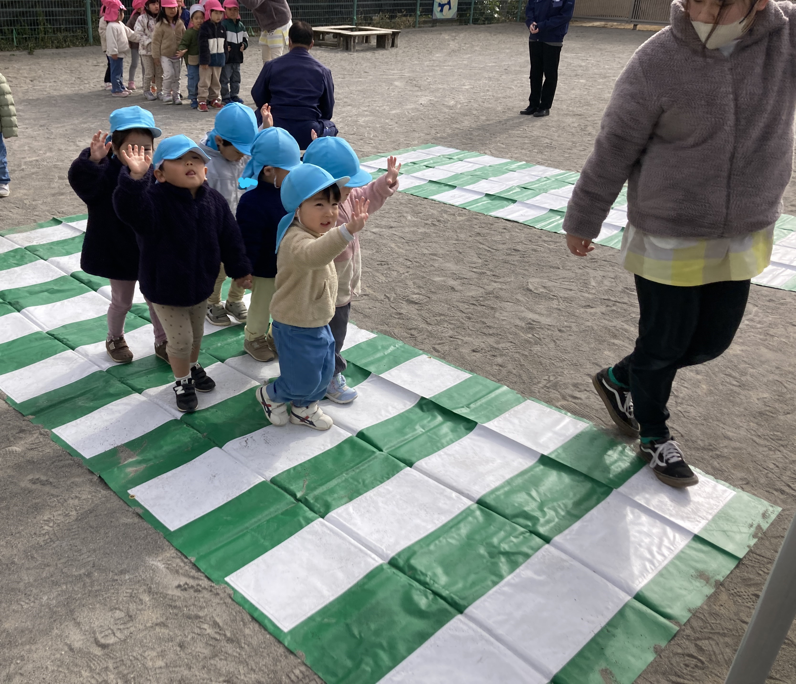 おさるさんが手を上げるのを真似して、どのクラスも手をあげて横断歩道を渡っていました。