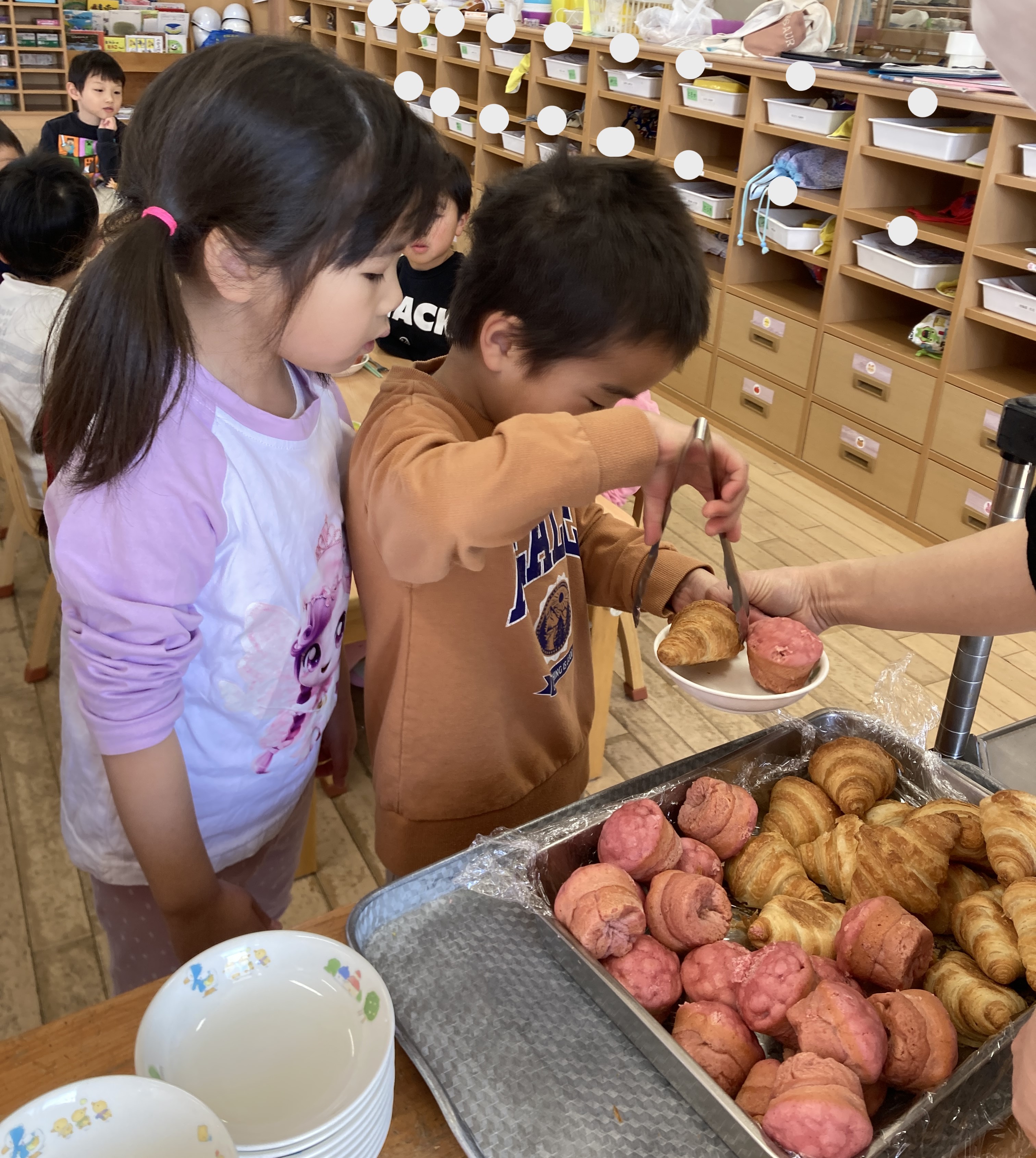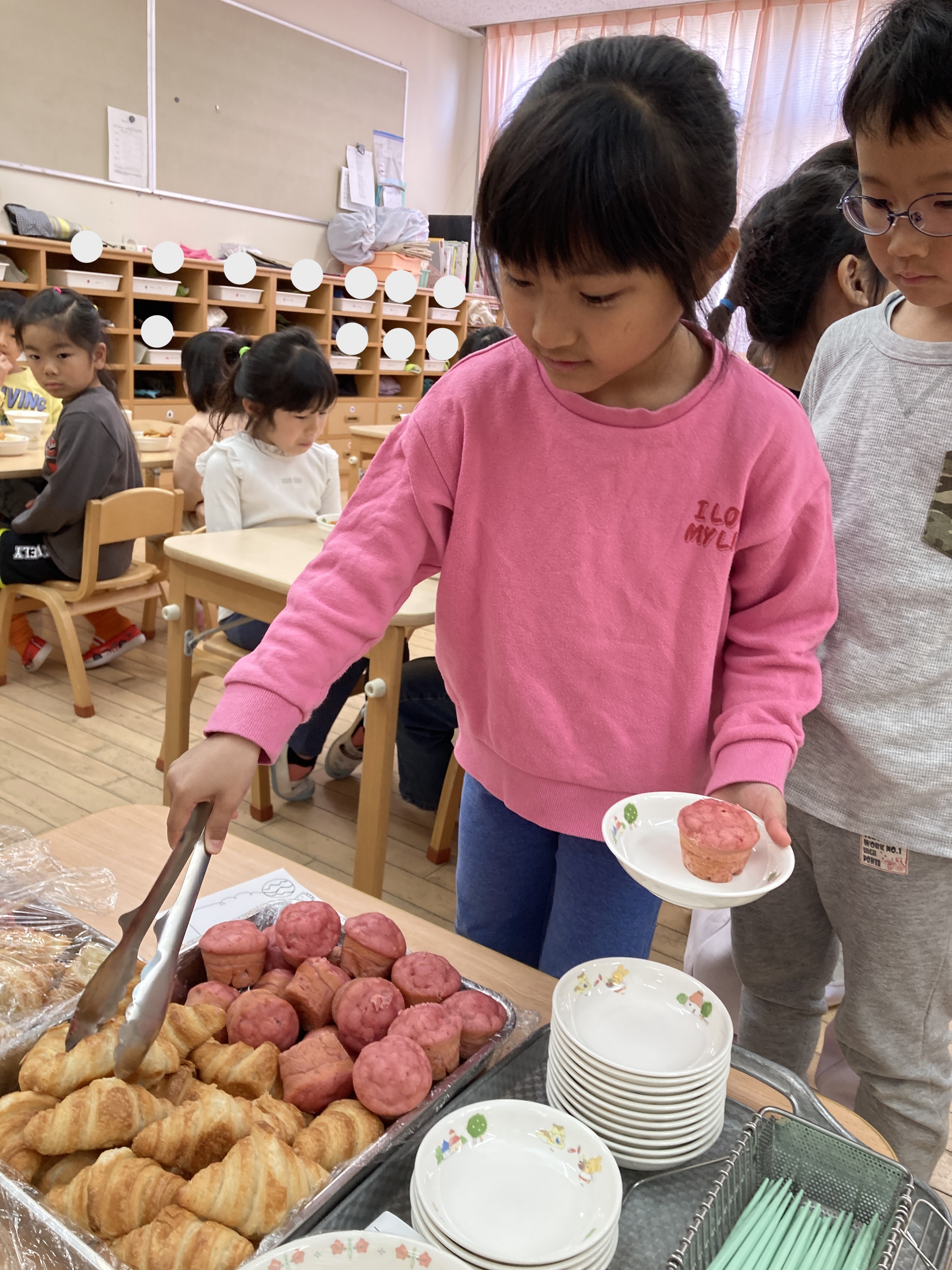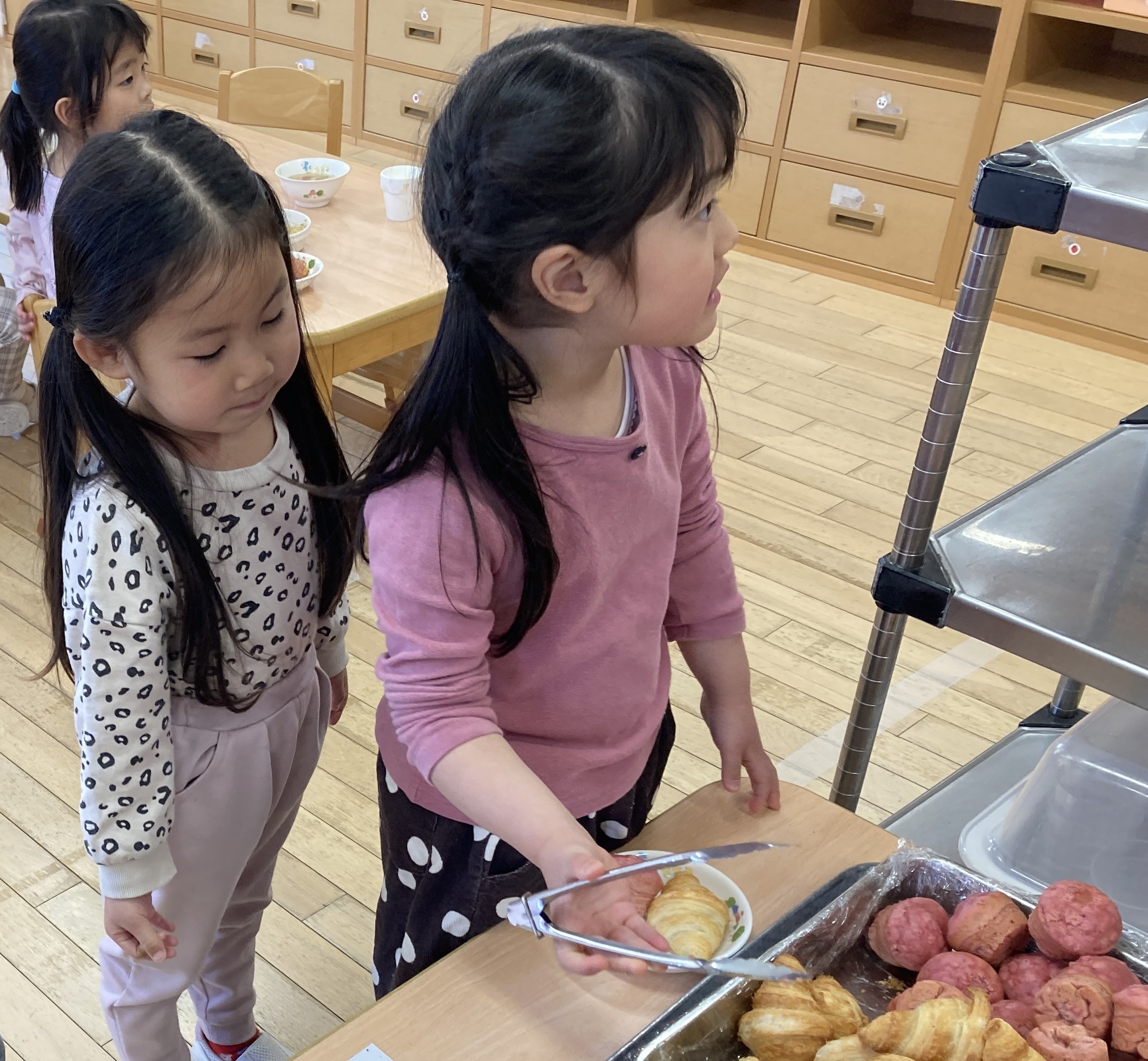 3.4.5歳クラスは、バイキング形式で自分たちで盛り付けしました。