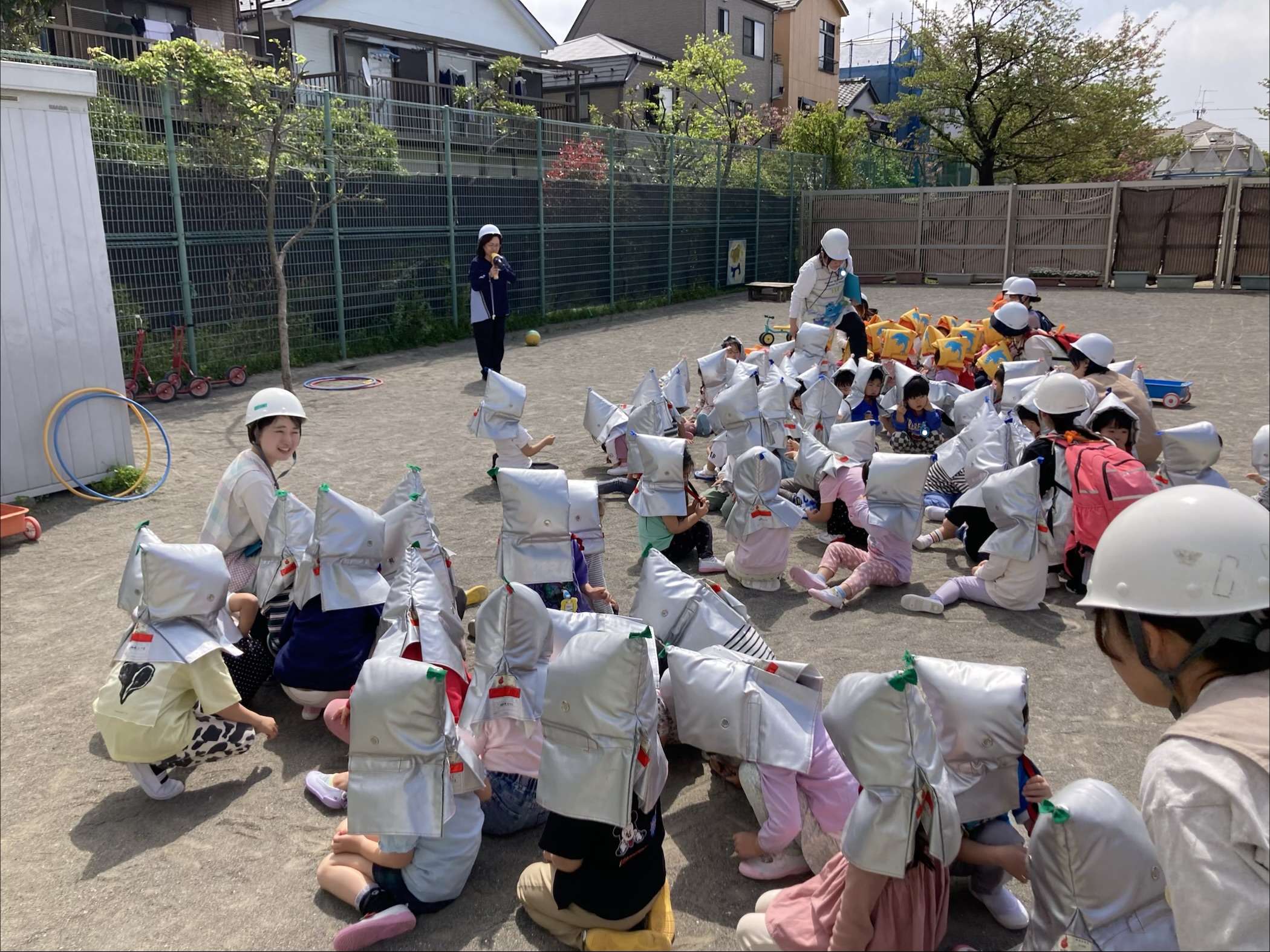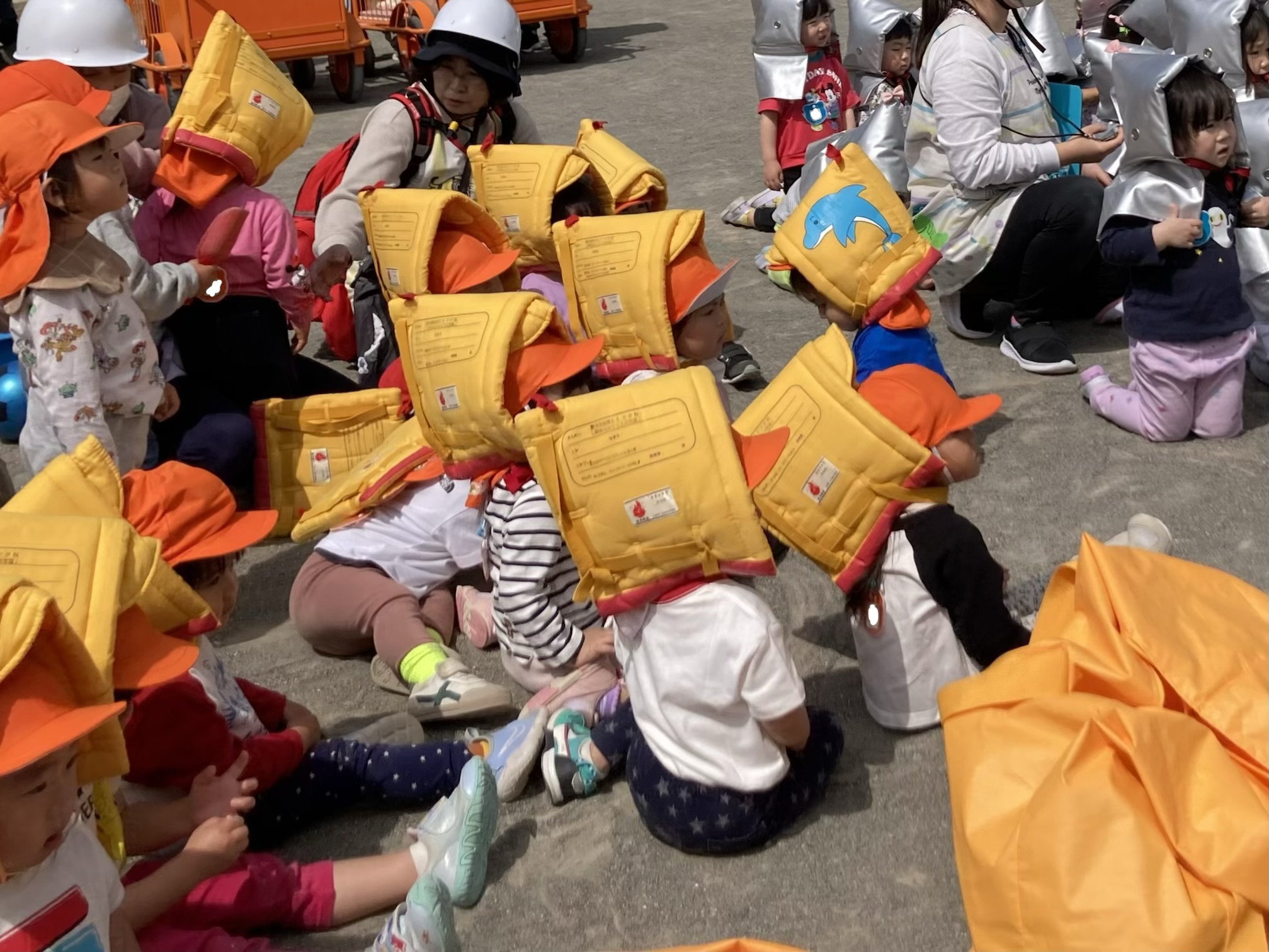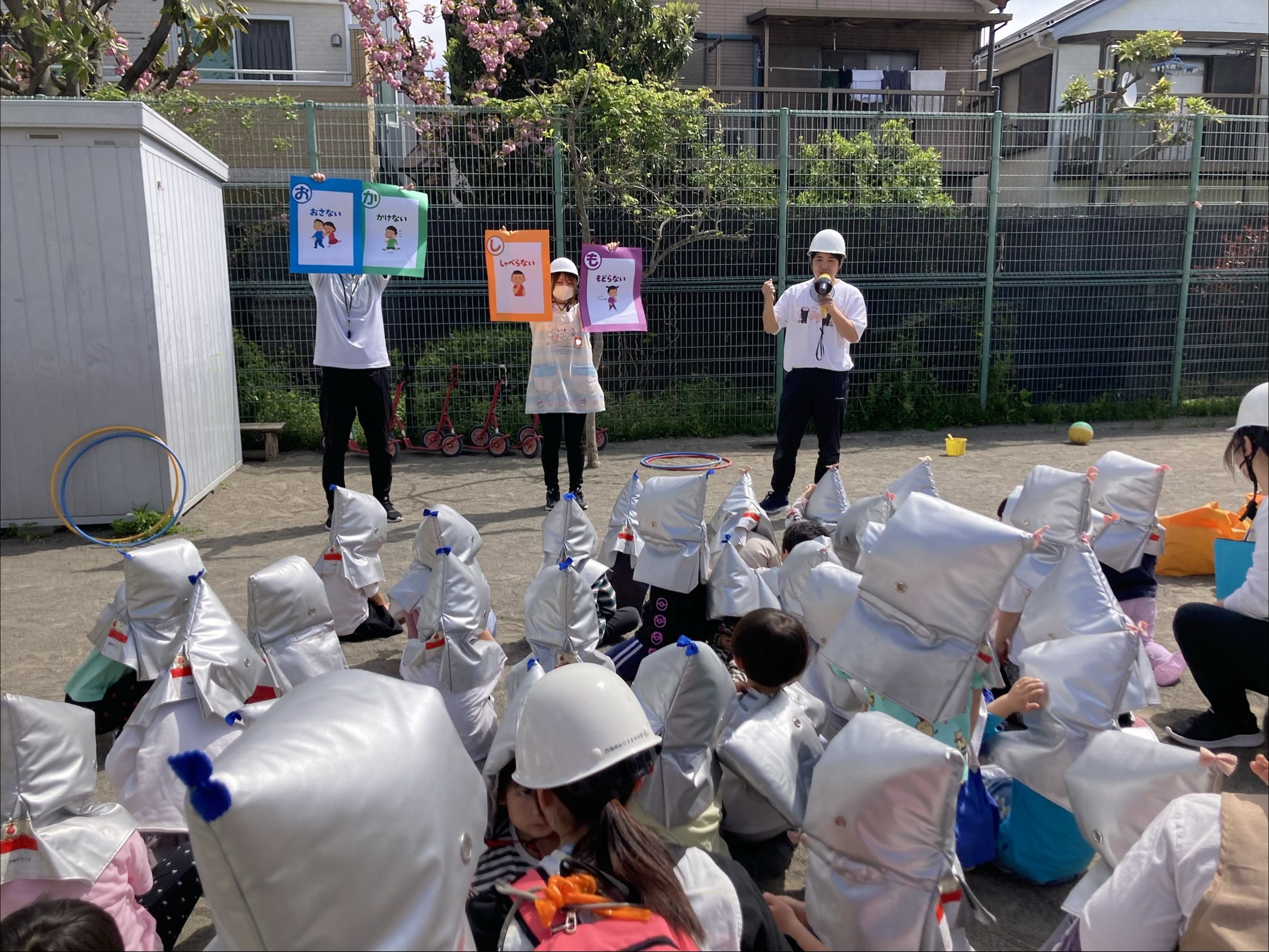 防災頭巾はまだ難しく被れませんでしたが、これから保育の中で練習していきたいと思います。