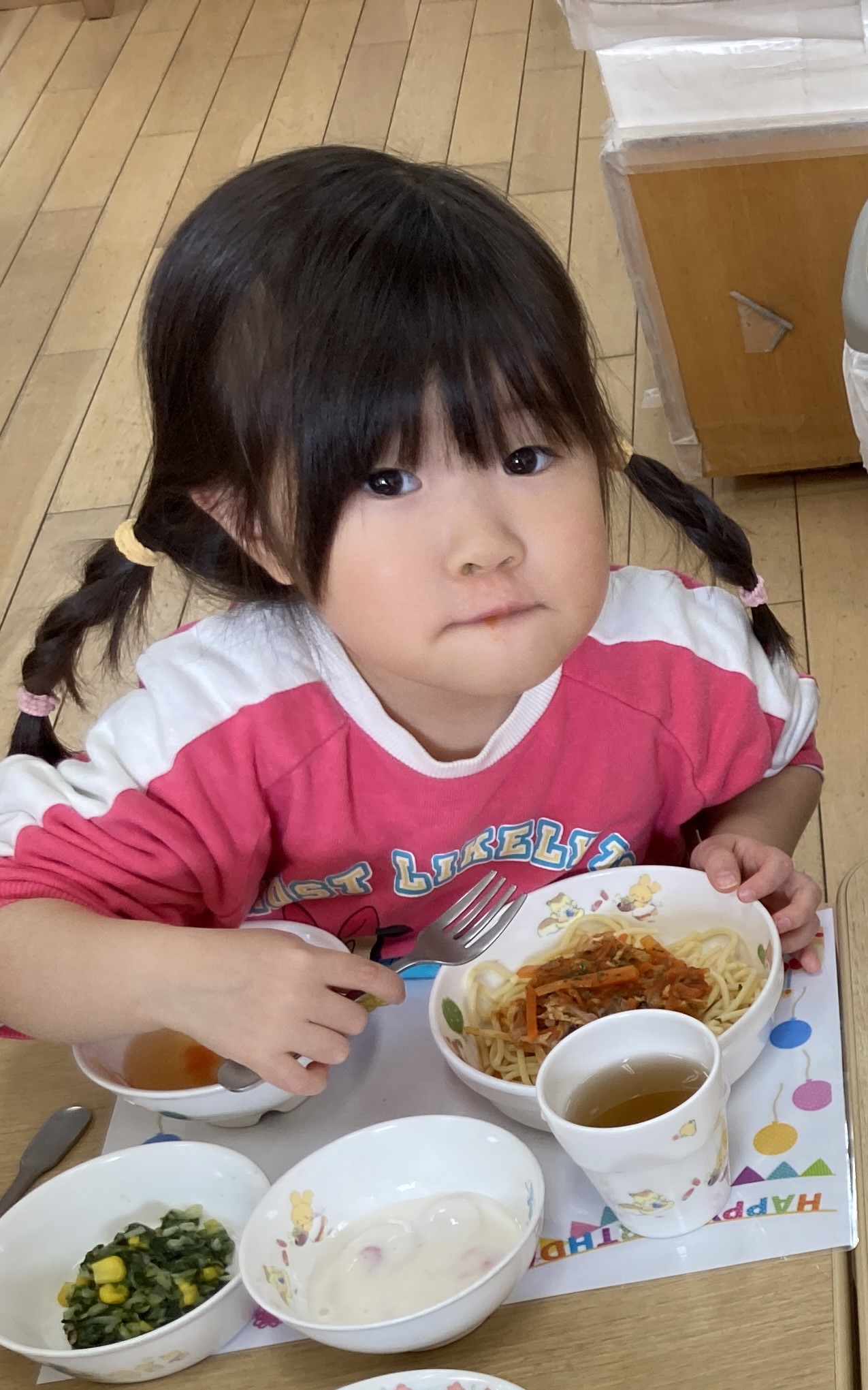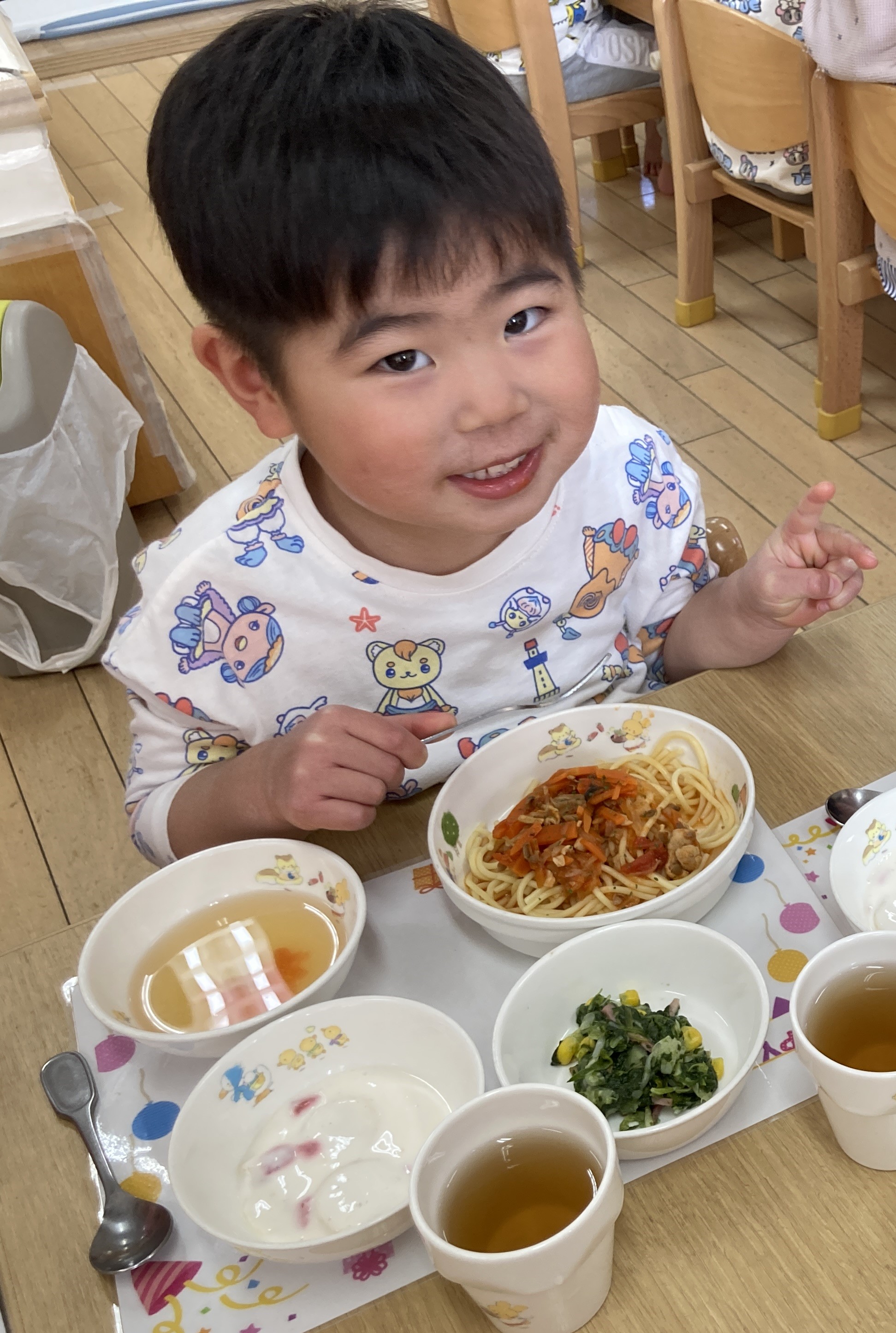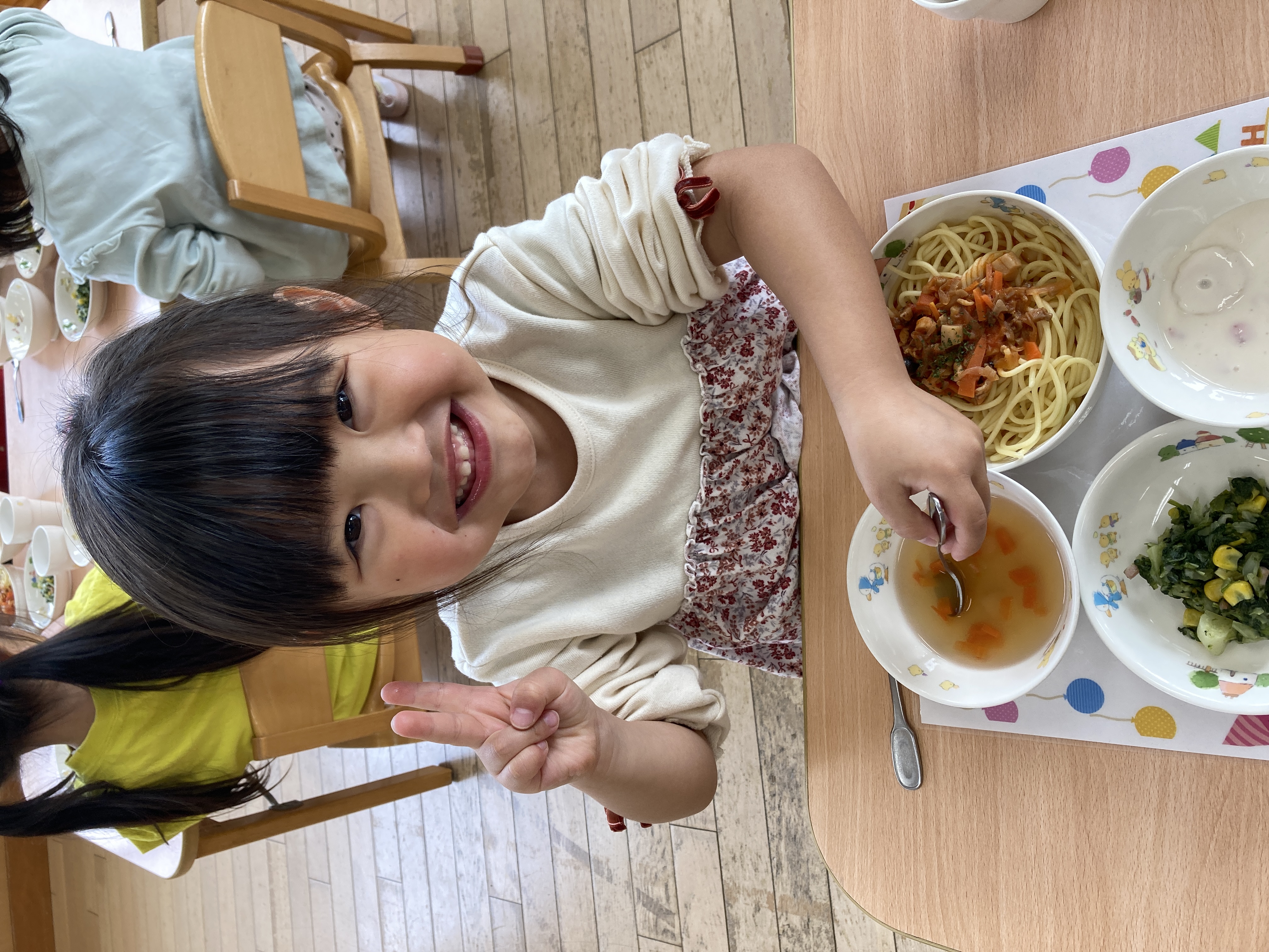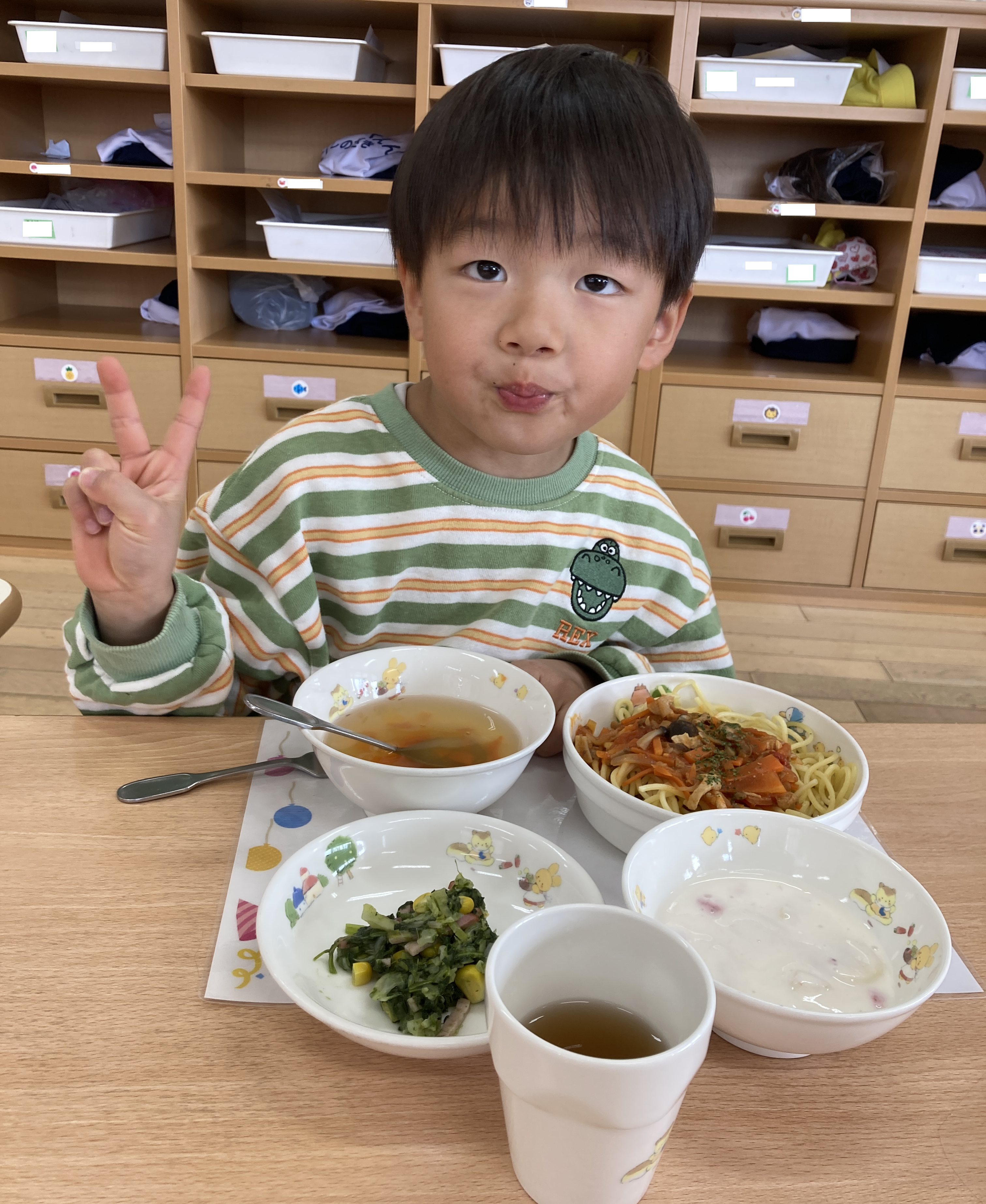 今日のメニューには「ポパイサラダ」があり、名前を聞いて「ポパイ?」と不思議そうな顔の子ども達。