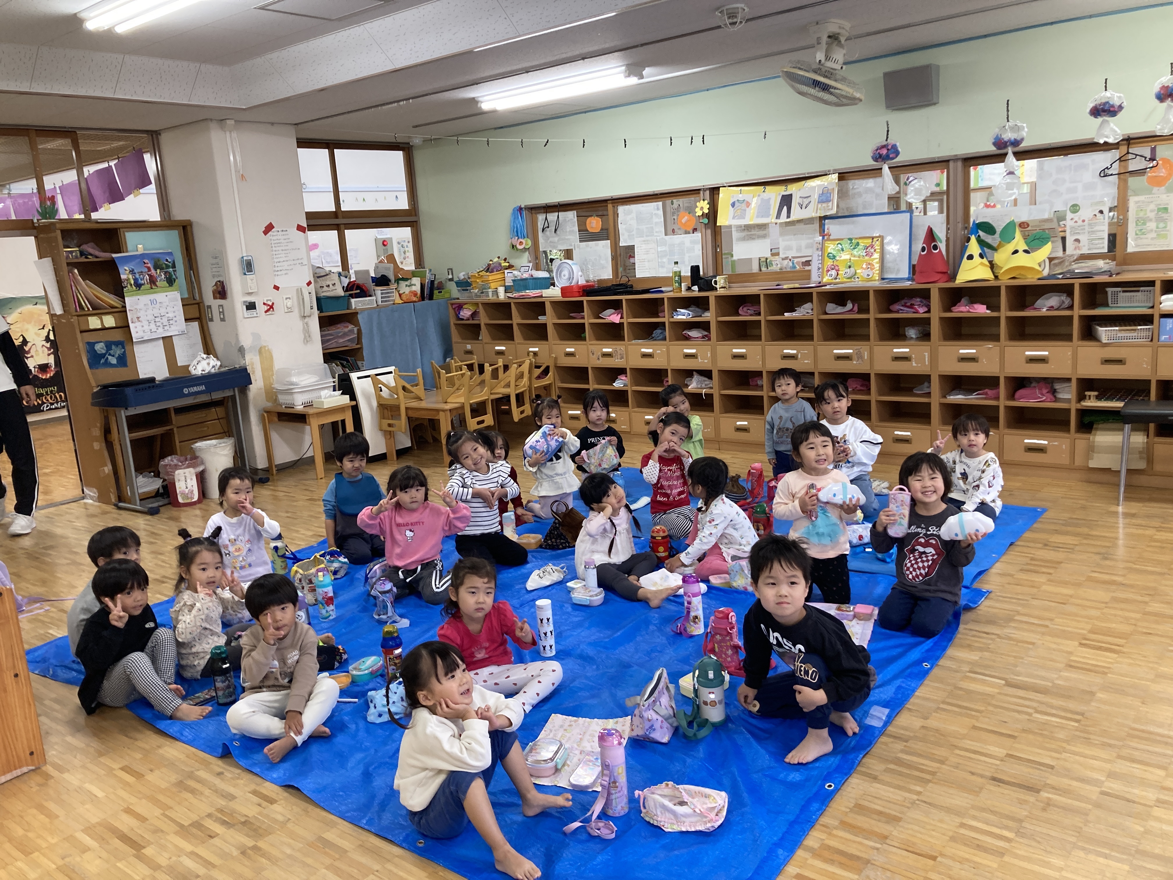 歩き遠足を予定していましたが、雨が降ってしまった為、保育園探検やゲーム遊びをしました。