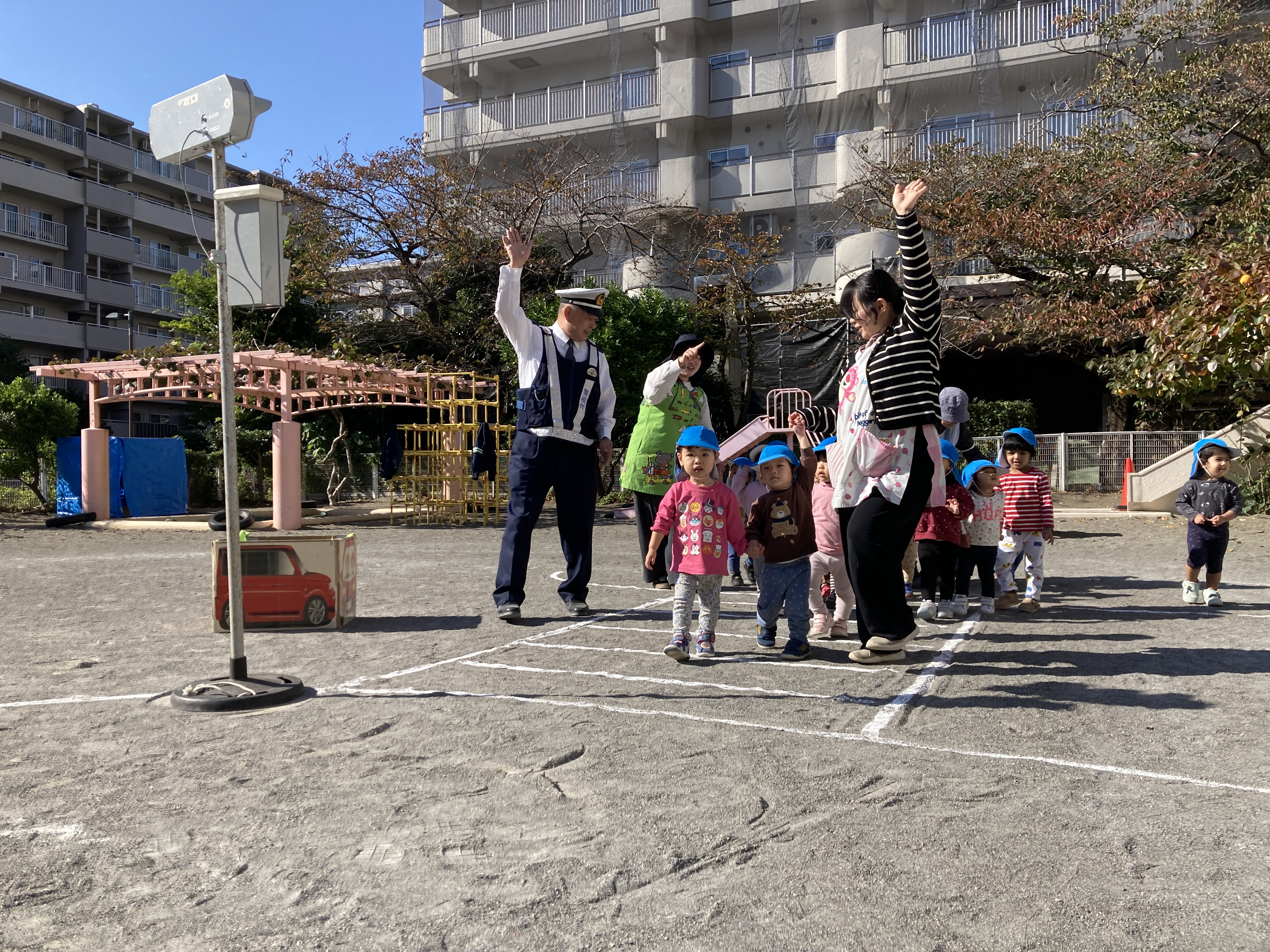 お巡りさんと一緒に右、左、右を見てから手をあげて横断歩道を渡ります。