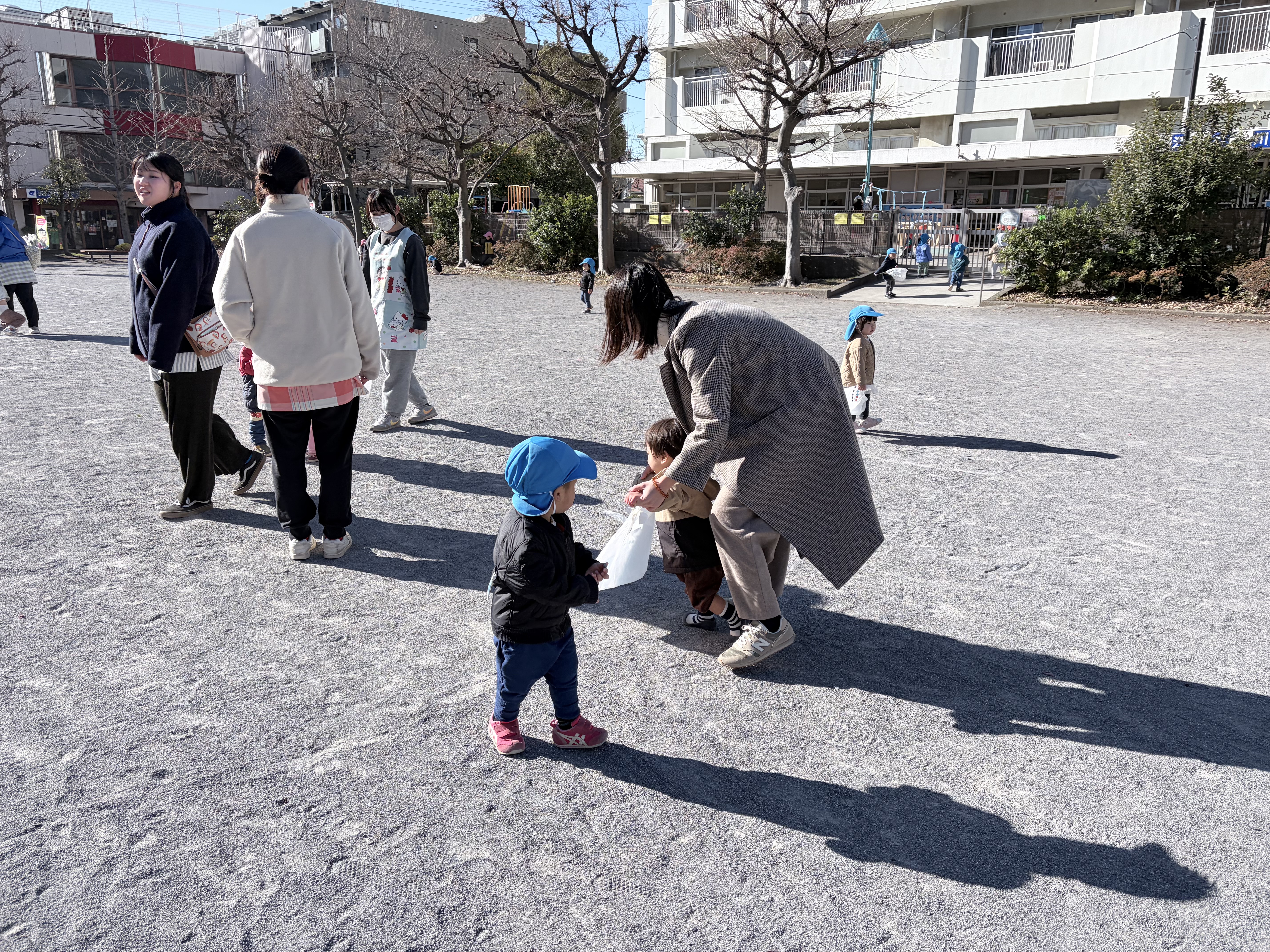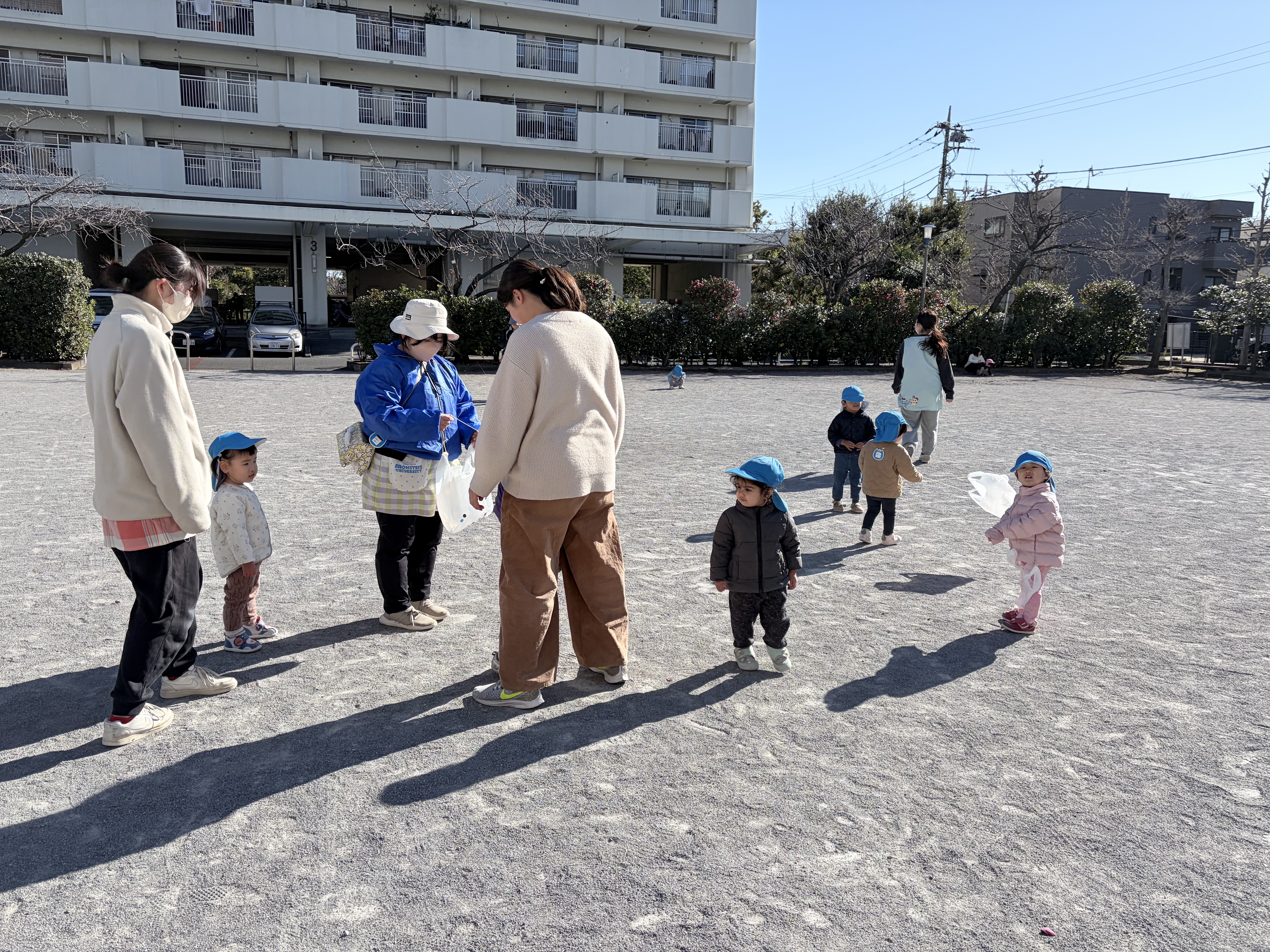 風が冷たくて寒い中でしたが、袋に様々な色の丸シールを貼って、自分だけの凧を完成させることが出来ました!