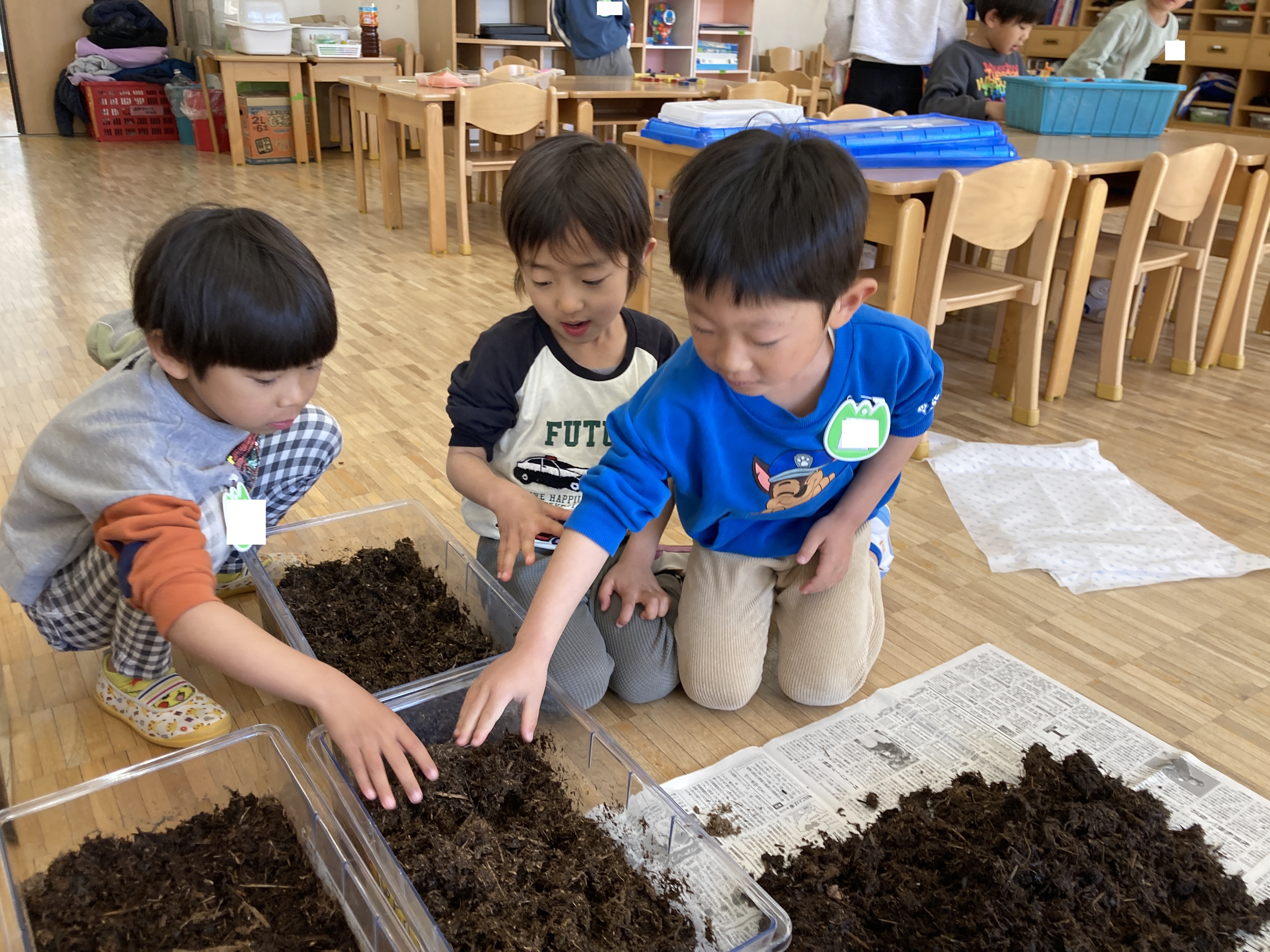 ぶどう組のお部屋にいたカブトムシの幼虫の土をかえる時期になり
