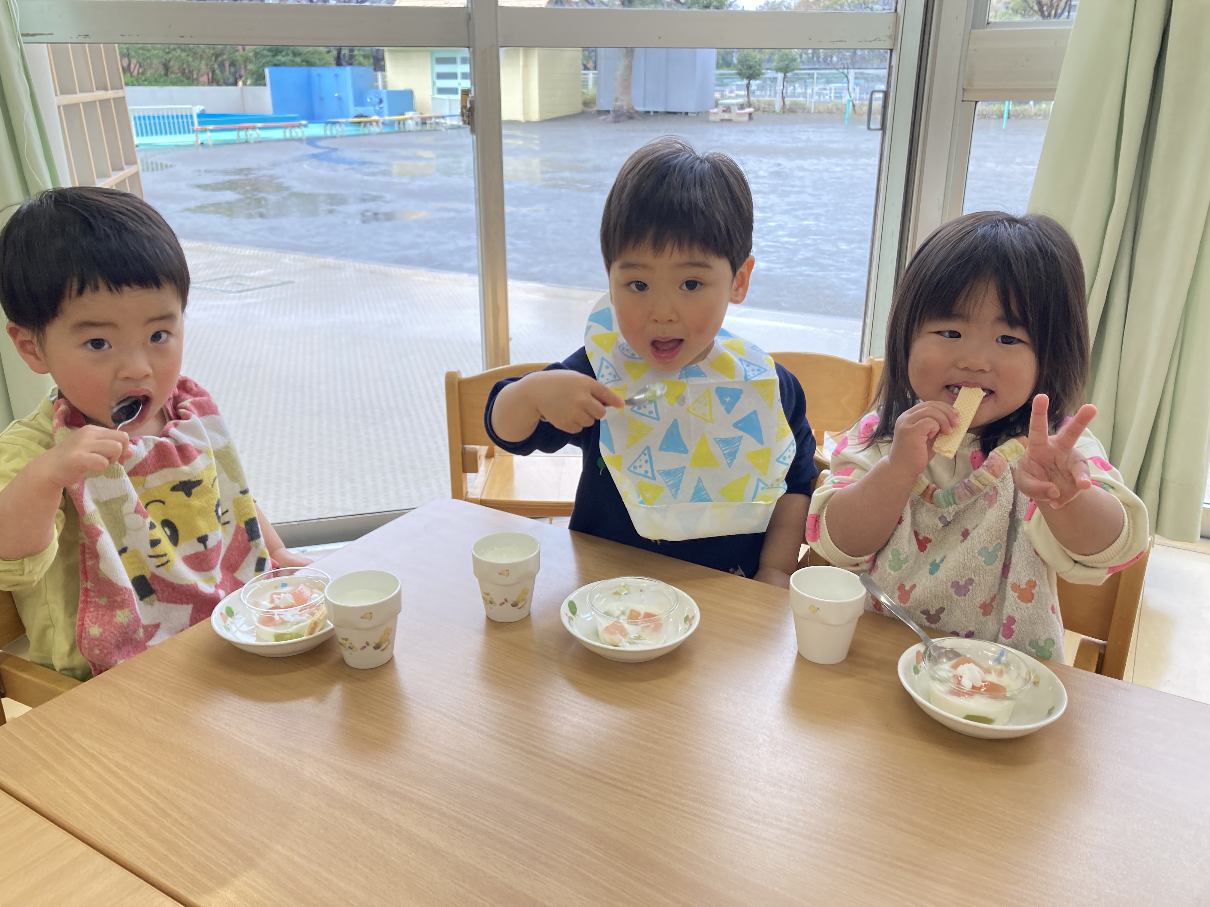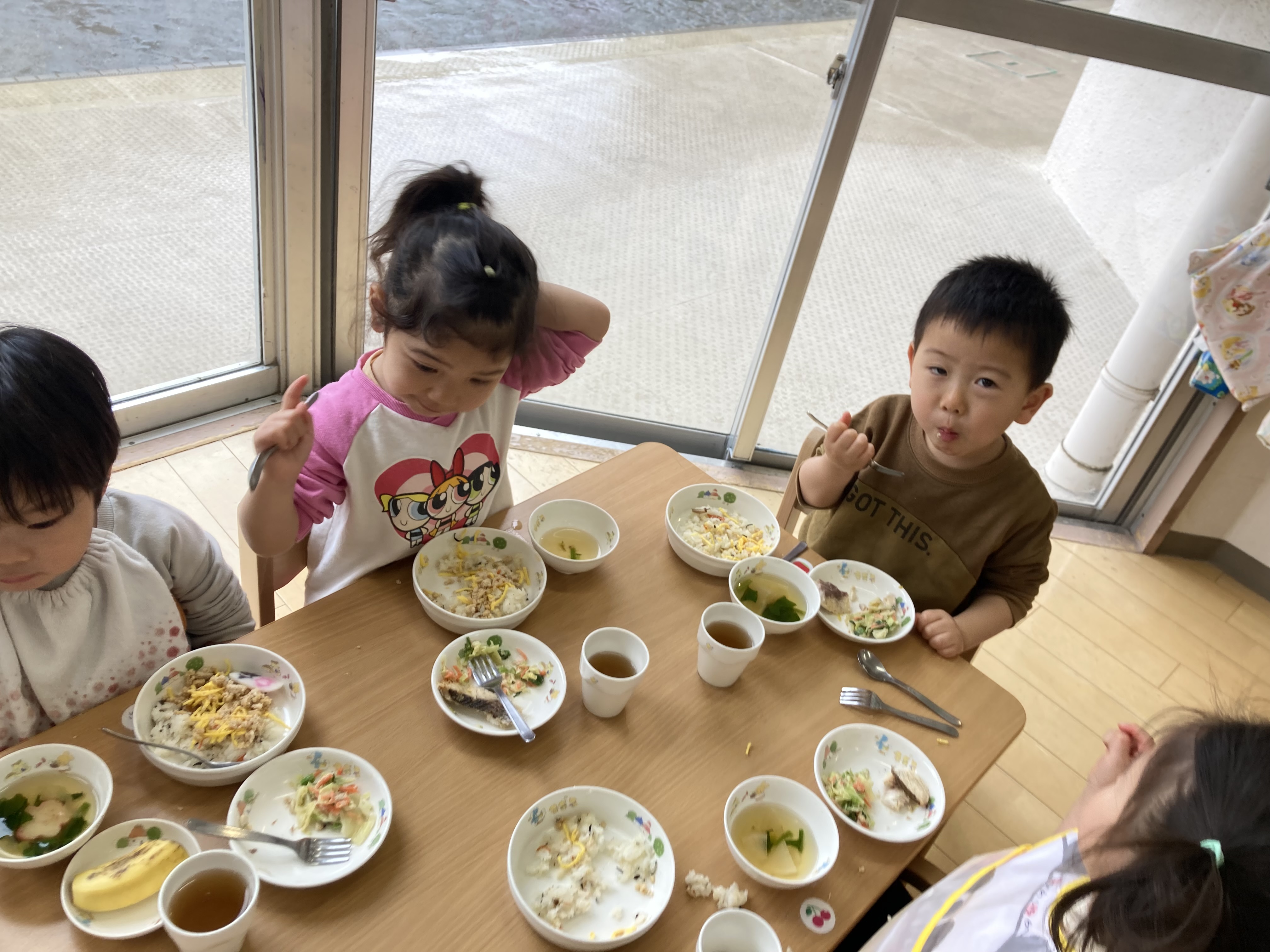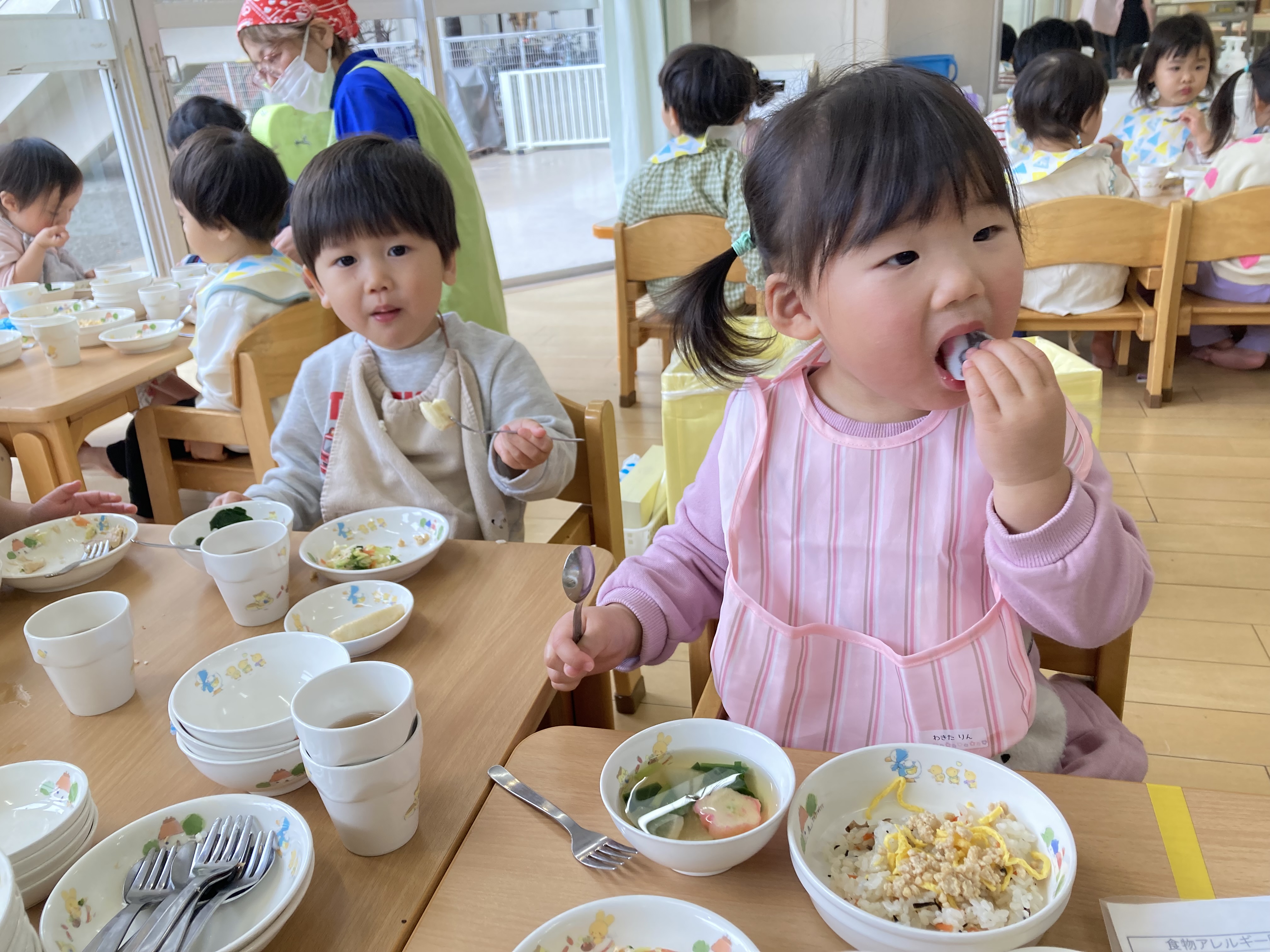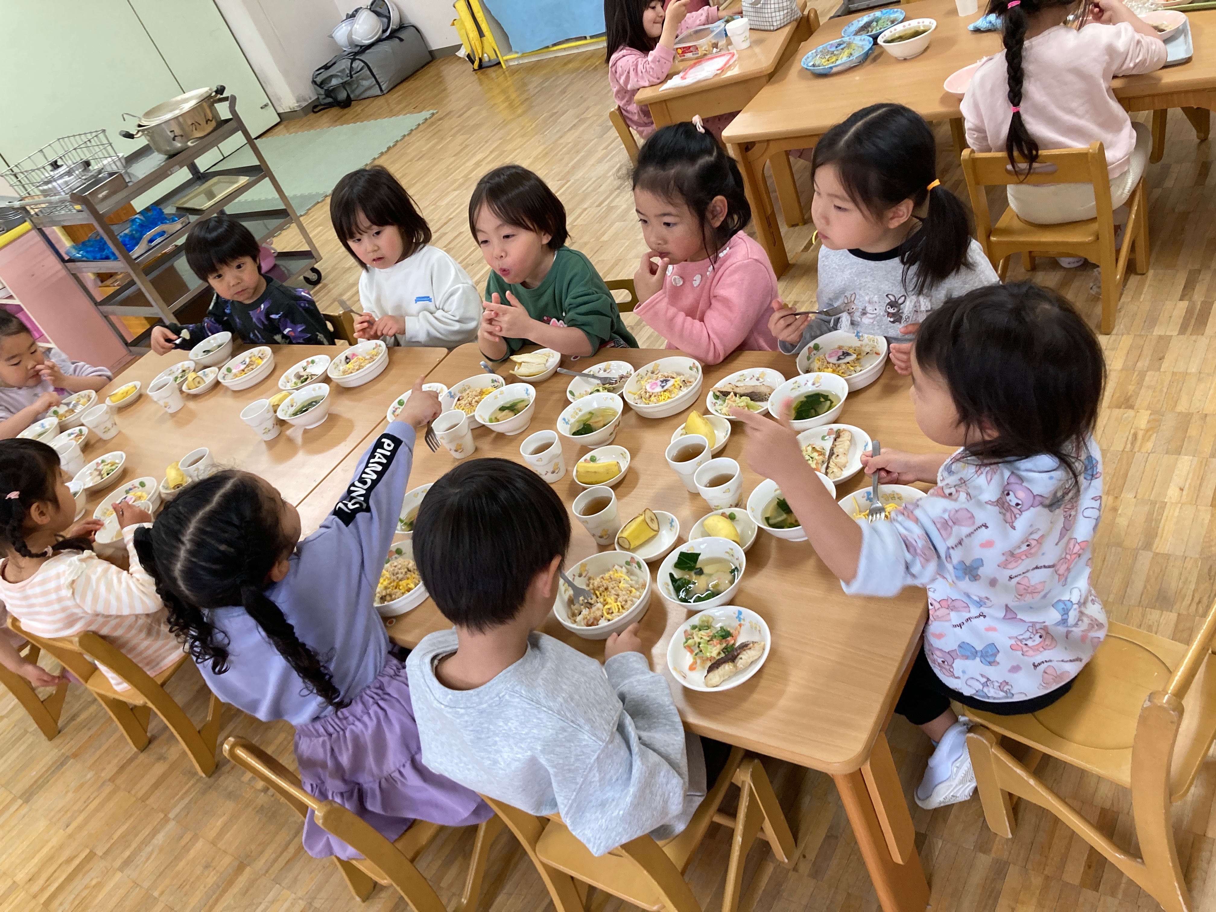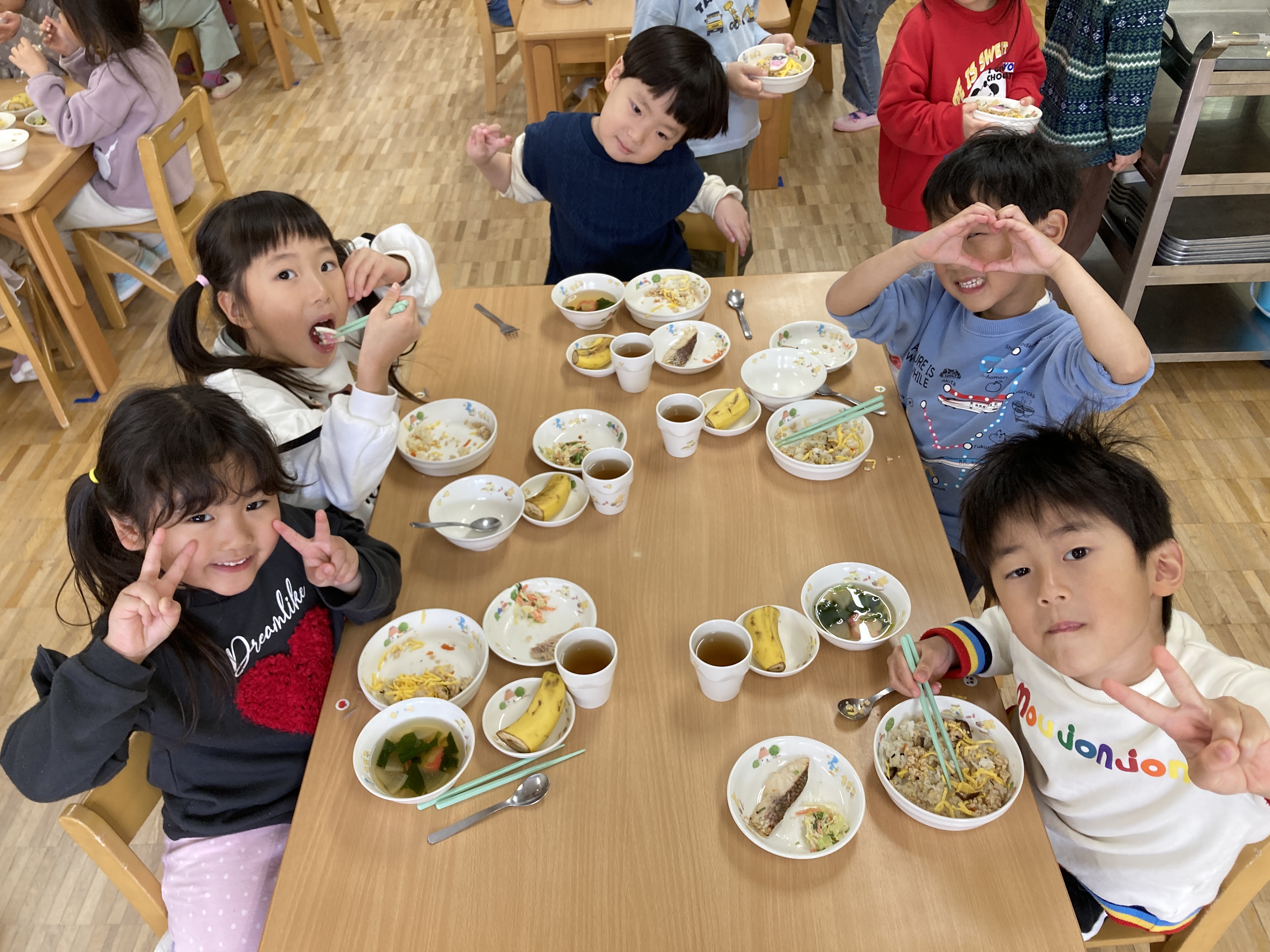 特別なお給食を見て、みんな嬉しそうにもりもり食べていました。