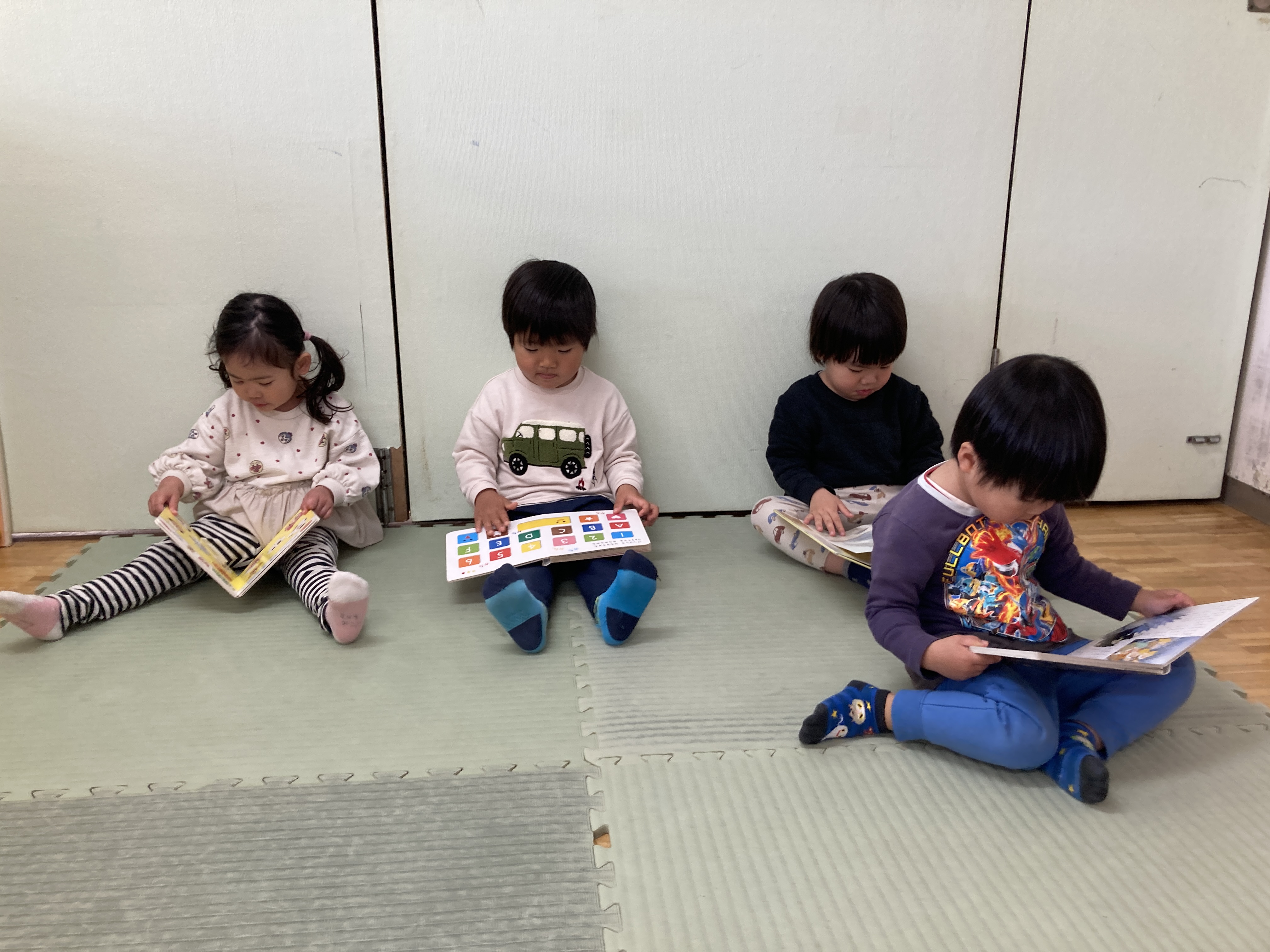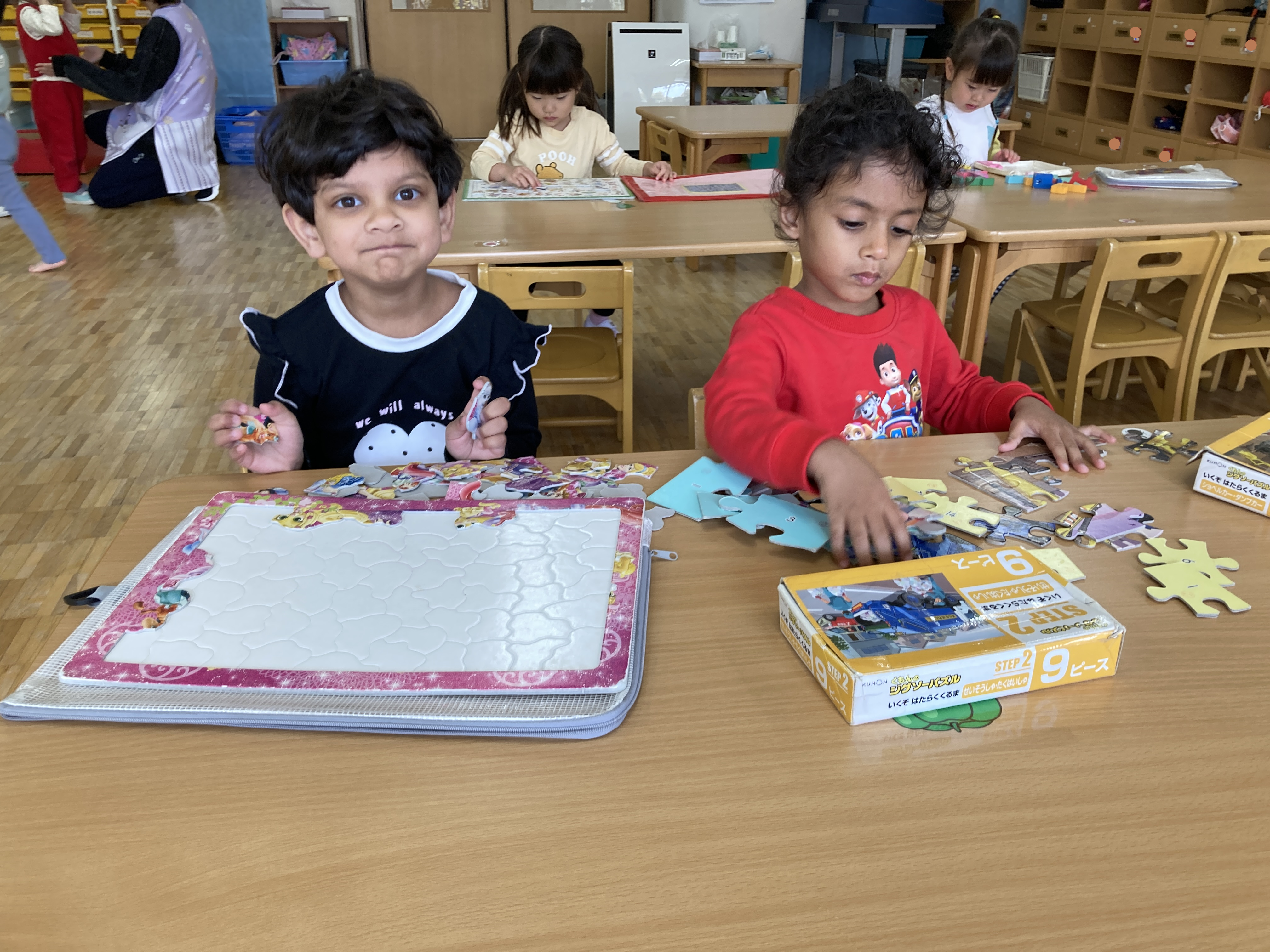 パズルや絵本など個々が好きな遊びを見つけて、お友だちと会話を楽しみながら遊んでいます。