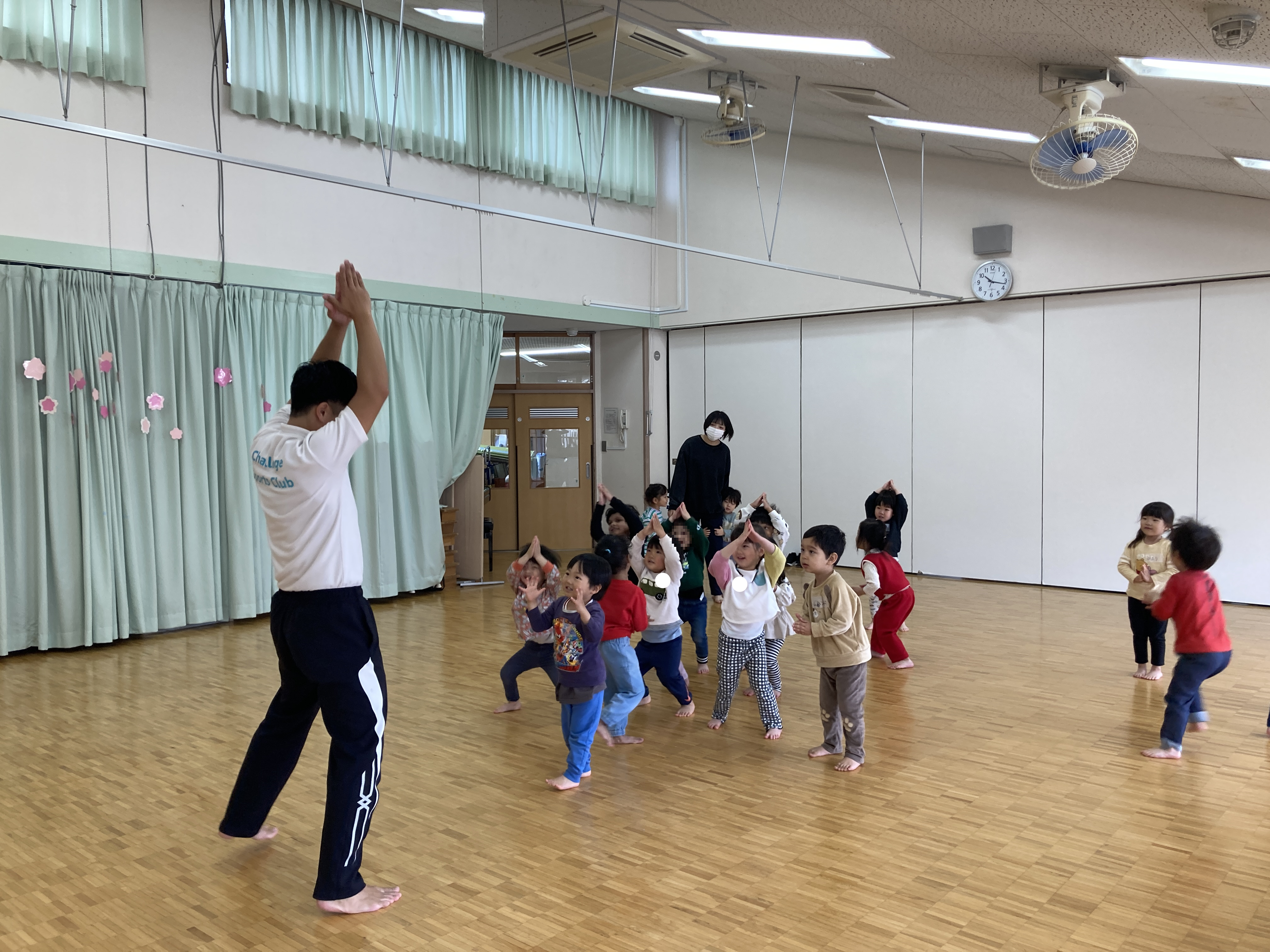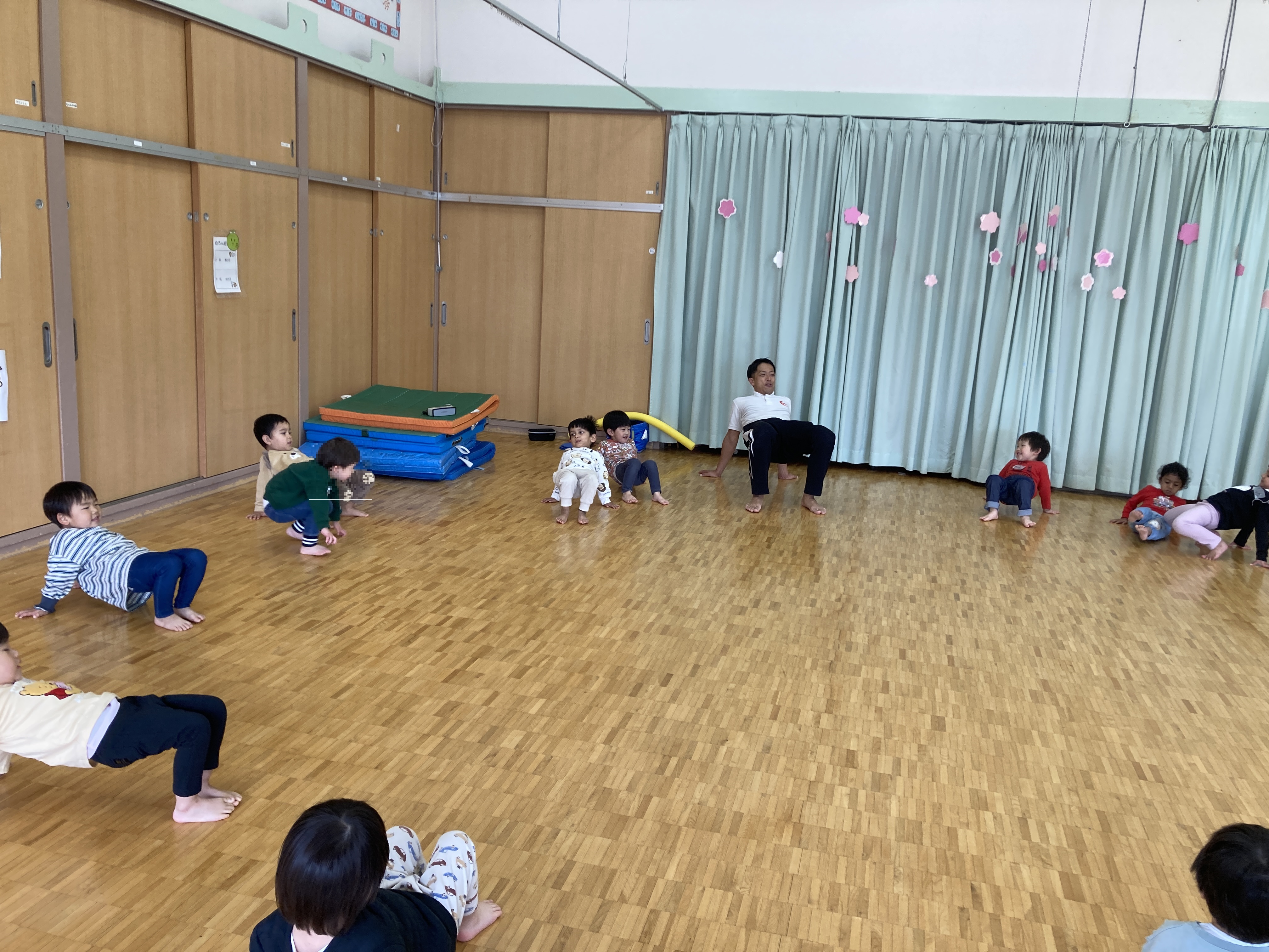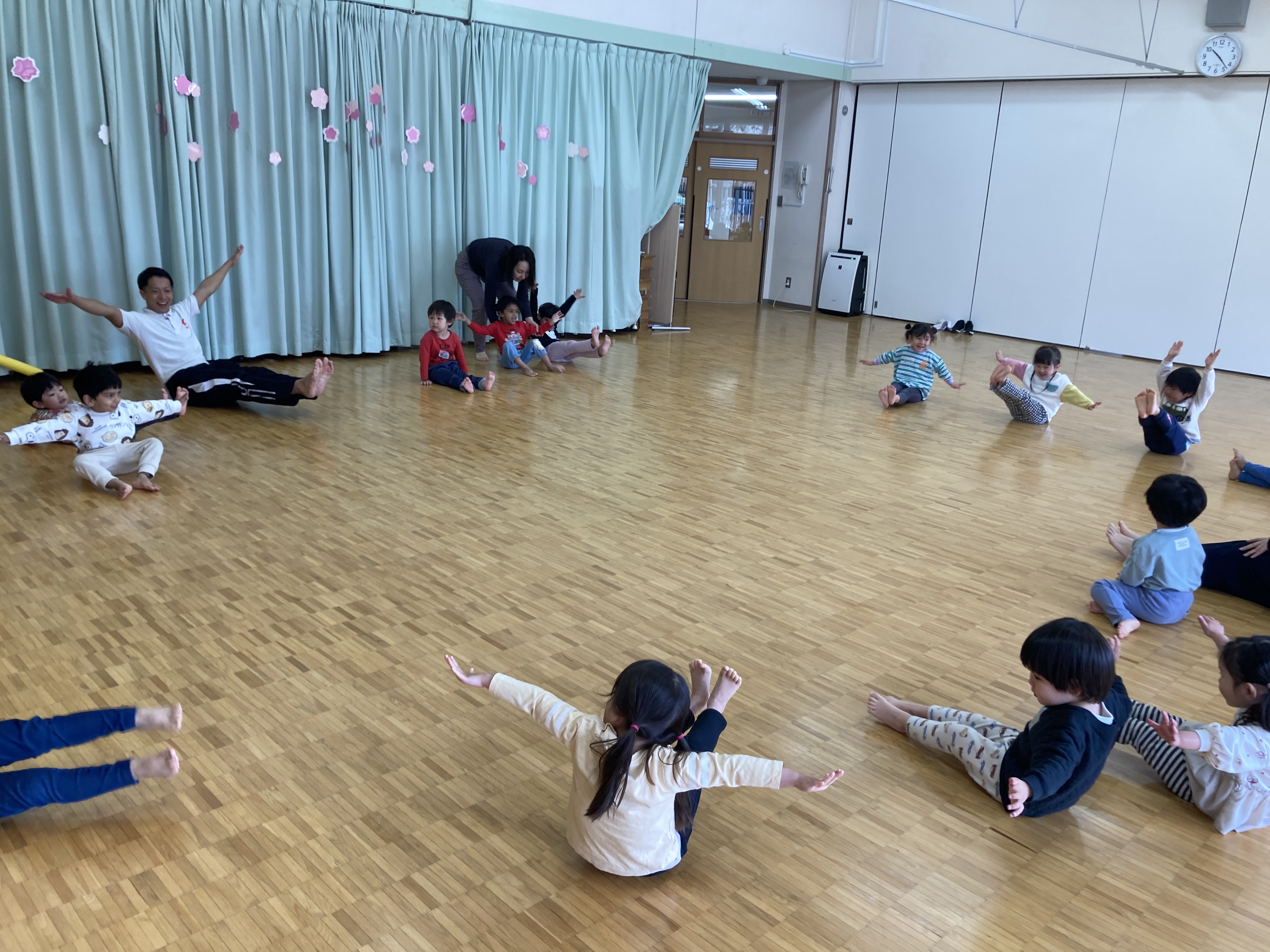 みかん組に進級してからはじめての体育遊び。音楽に合わせて体を動かしました!