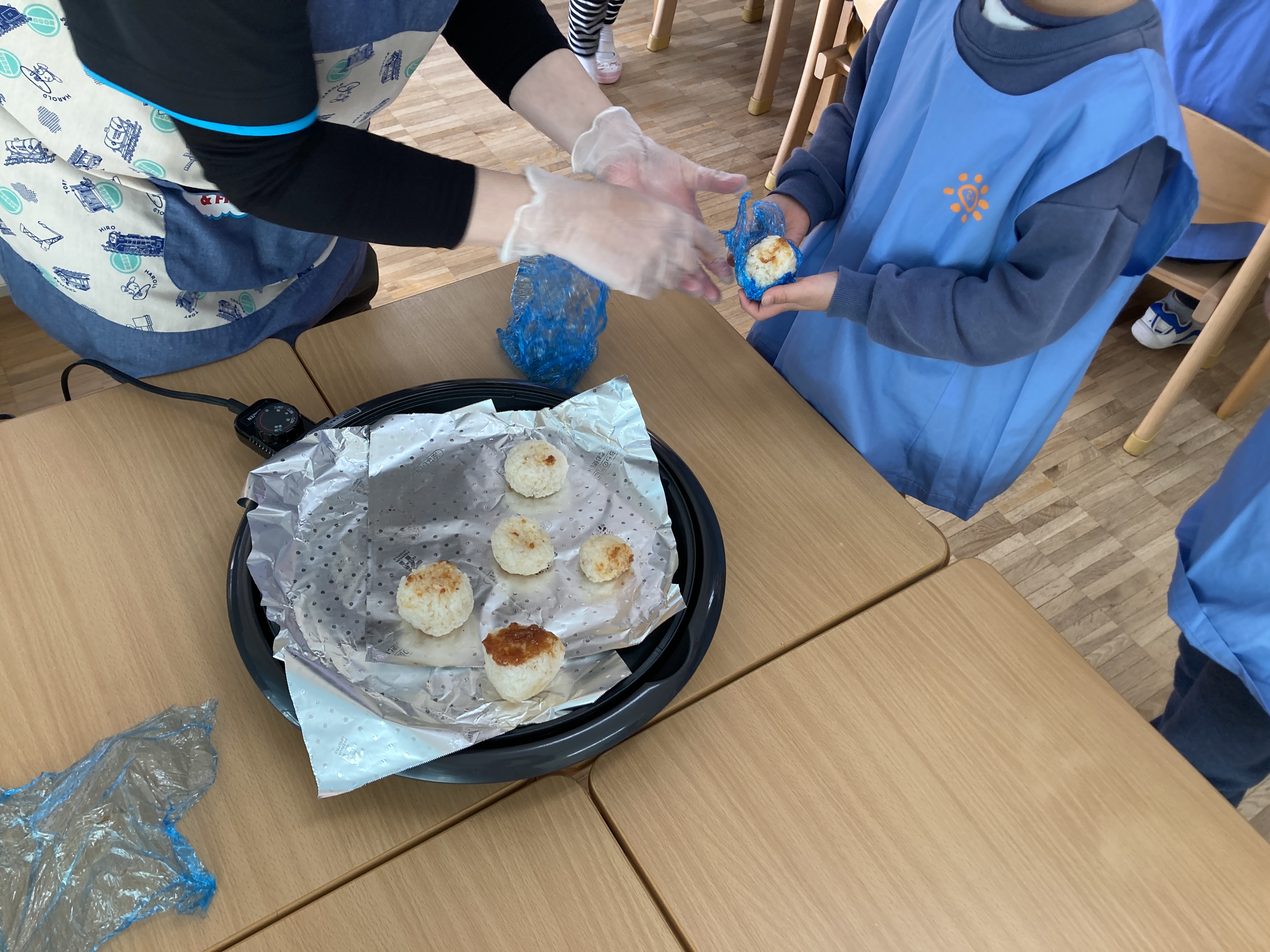 その後保育士がホットプレートで焼き目を付けていると