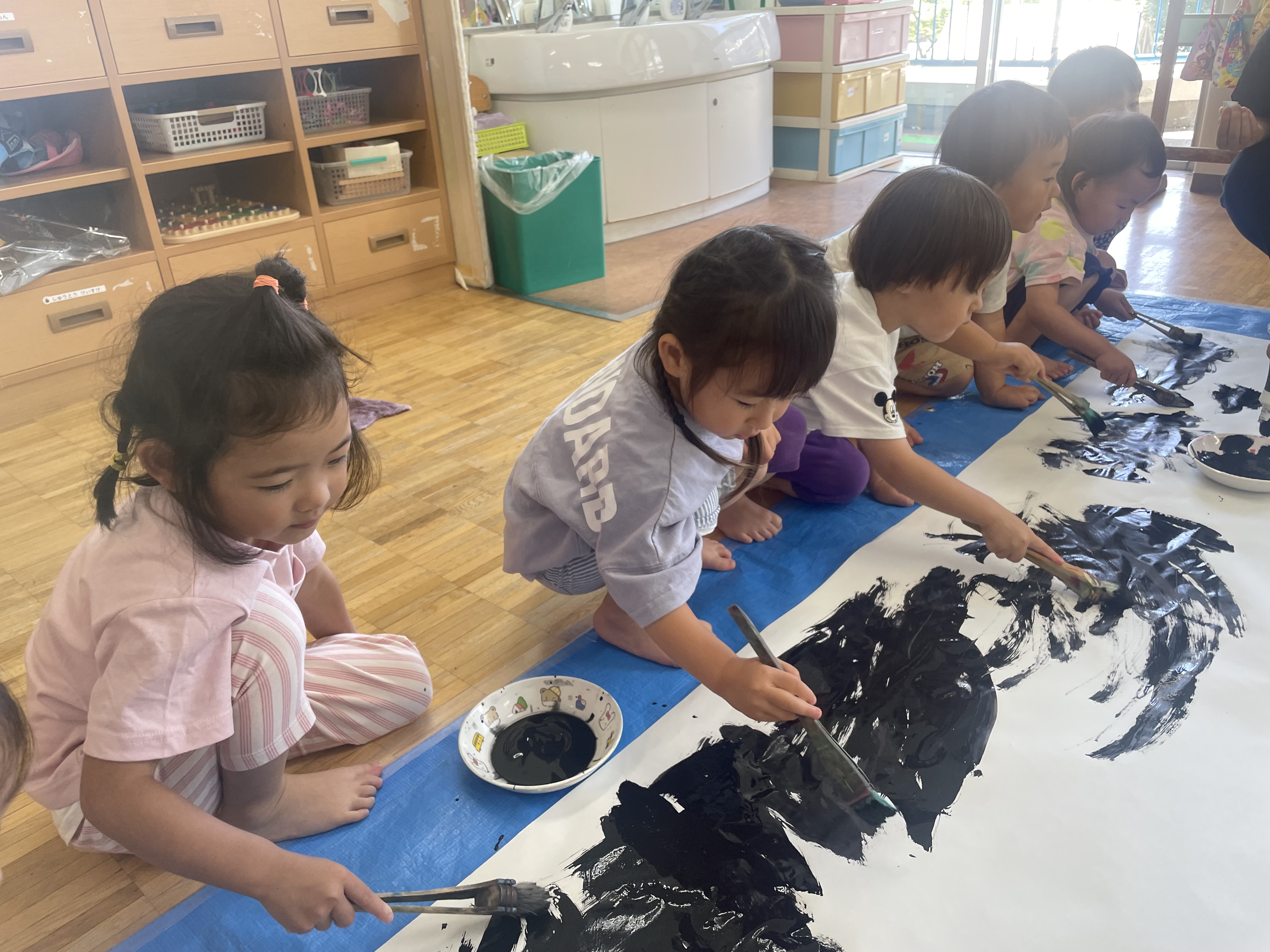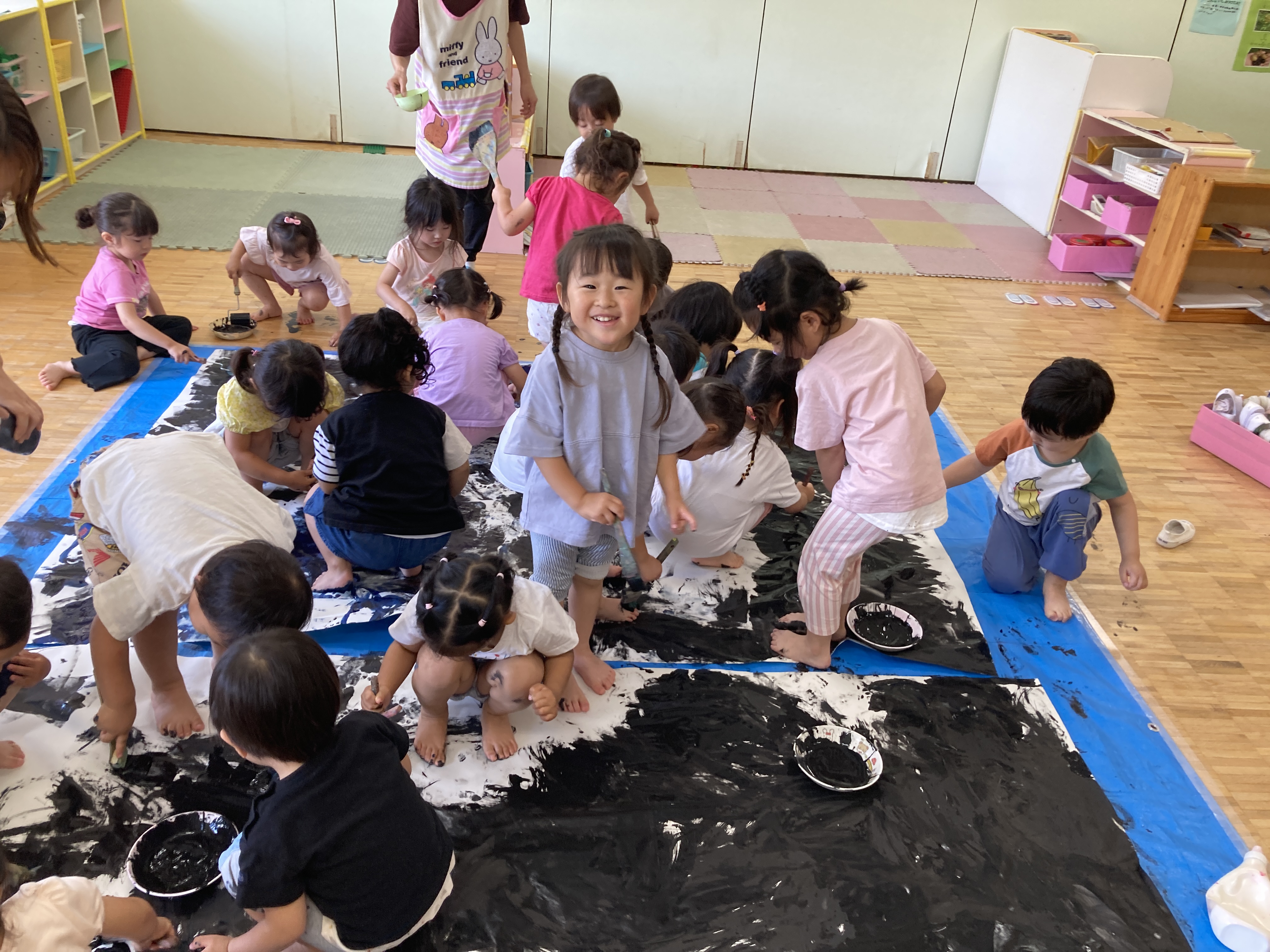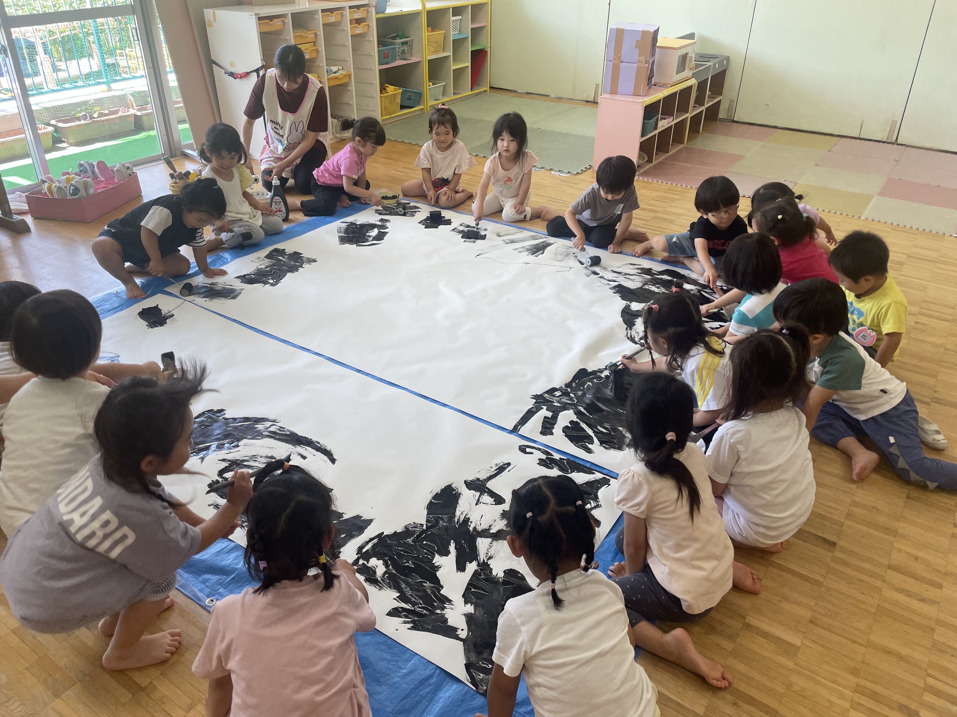 3歳児クラスでは、模造紙に絵の具を使って思う存分、ダイナミックに塗ったりして「こっちも!」「すごいね」などと、盛り上がっていました!