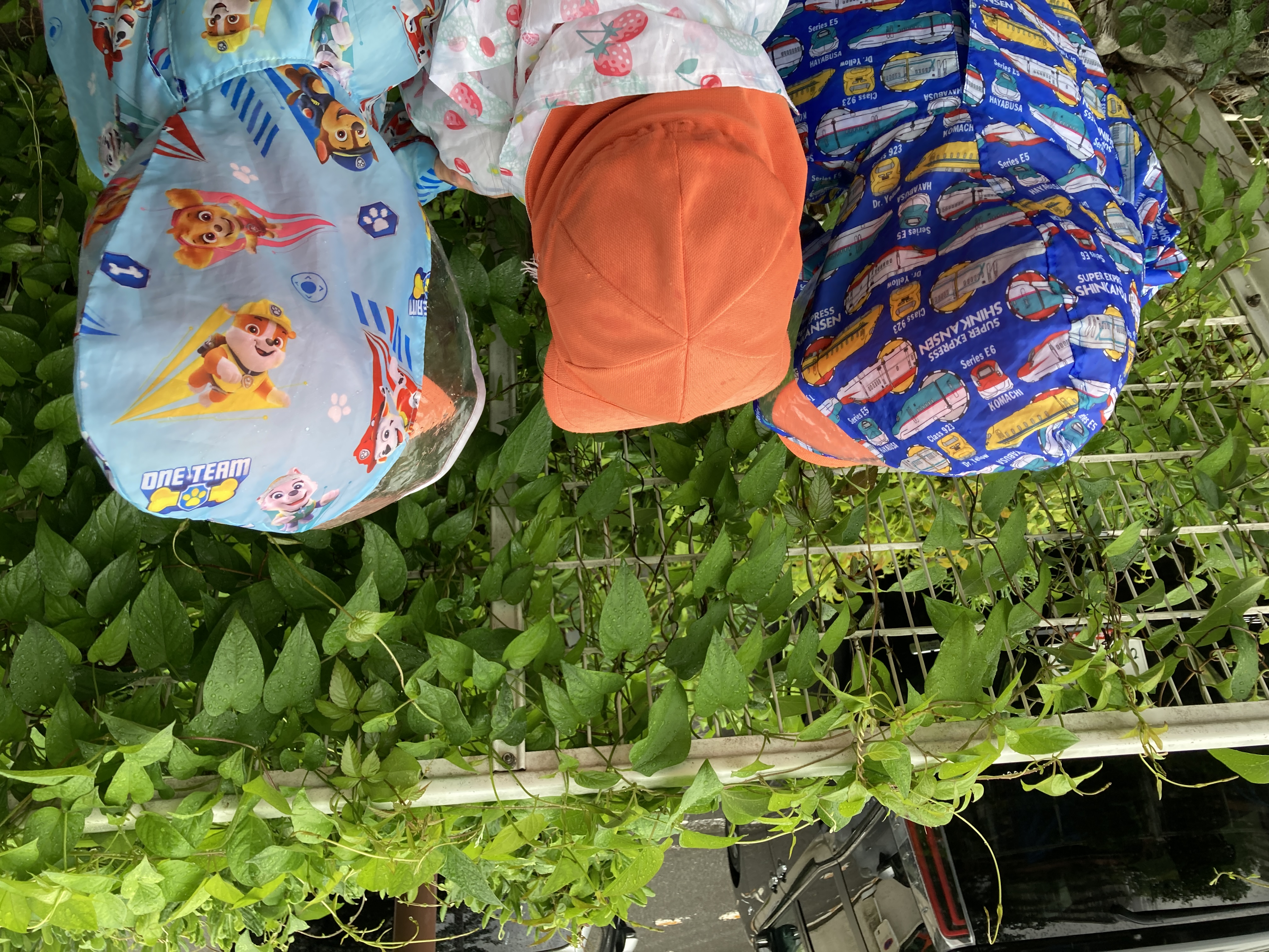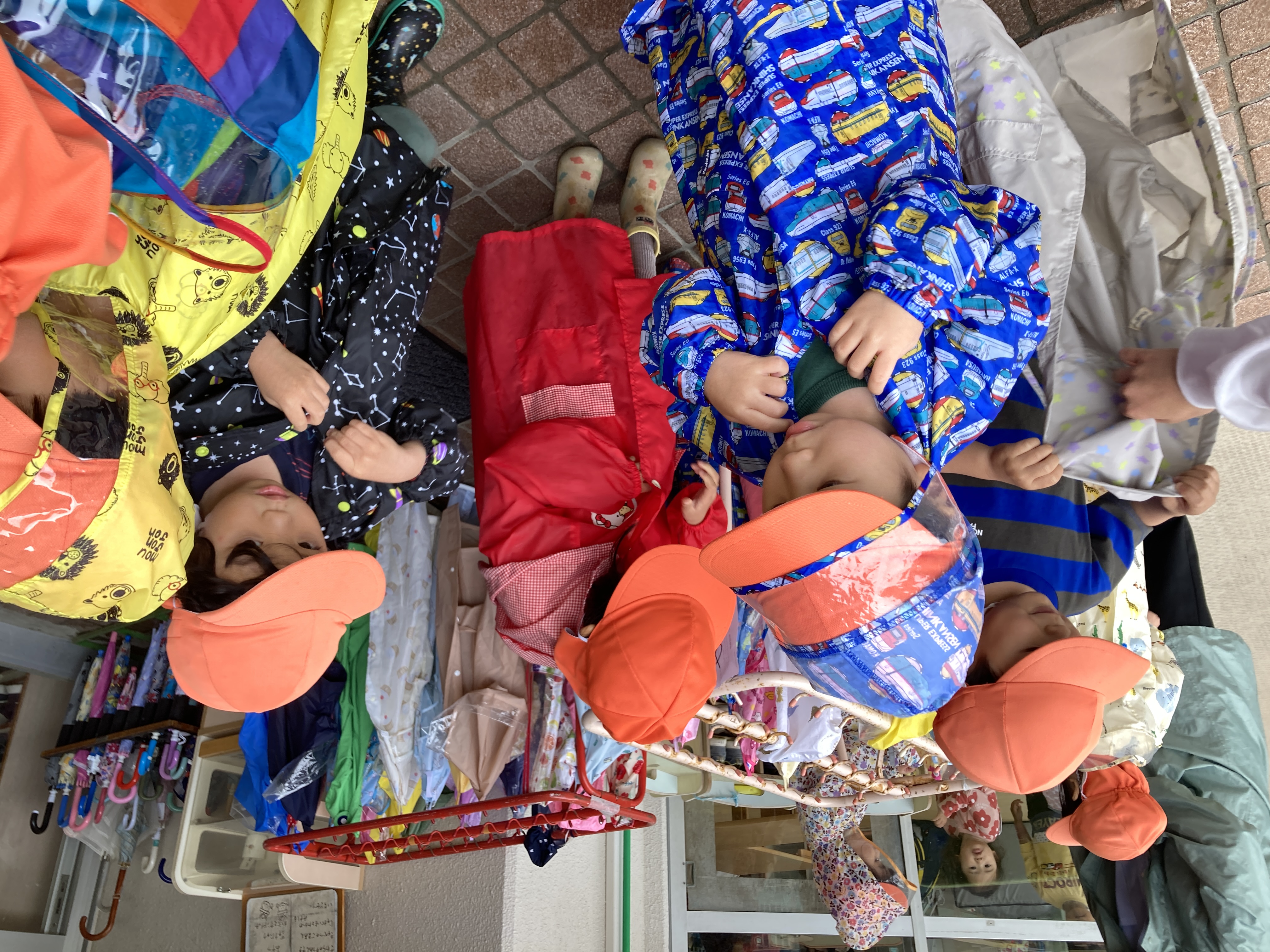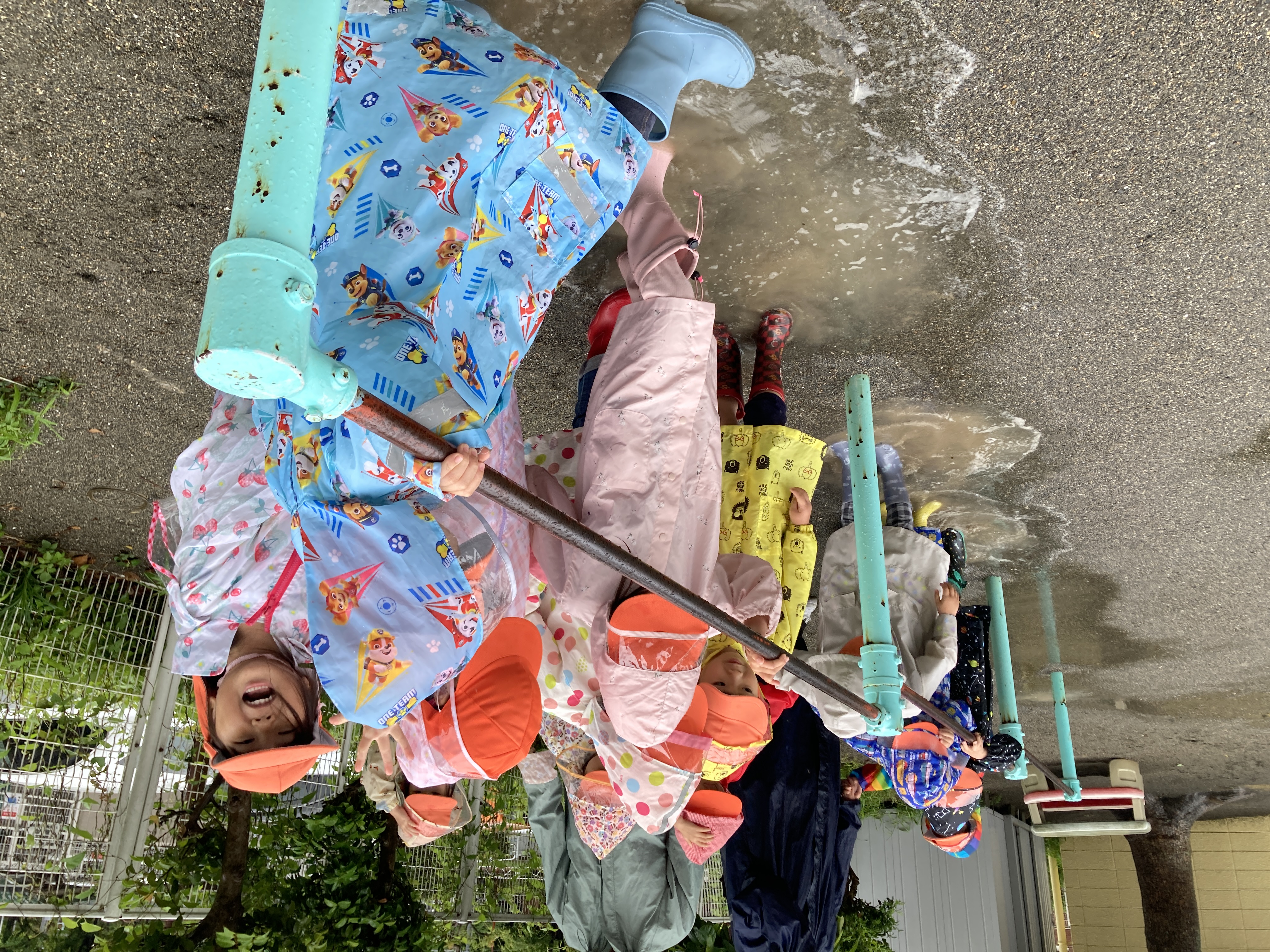 雨の日には、戸外へ出る事は難しいですが、事前に準備をして、カッパを着て園庭を歩いてみたりする事もあります!