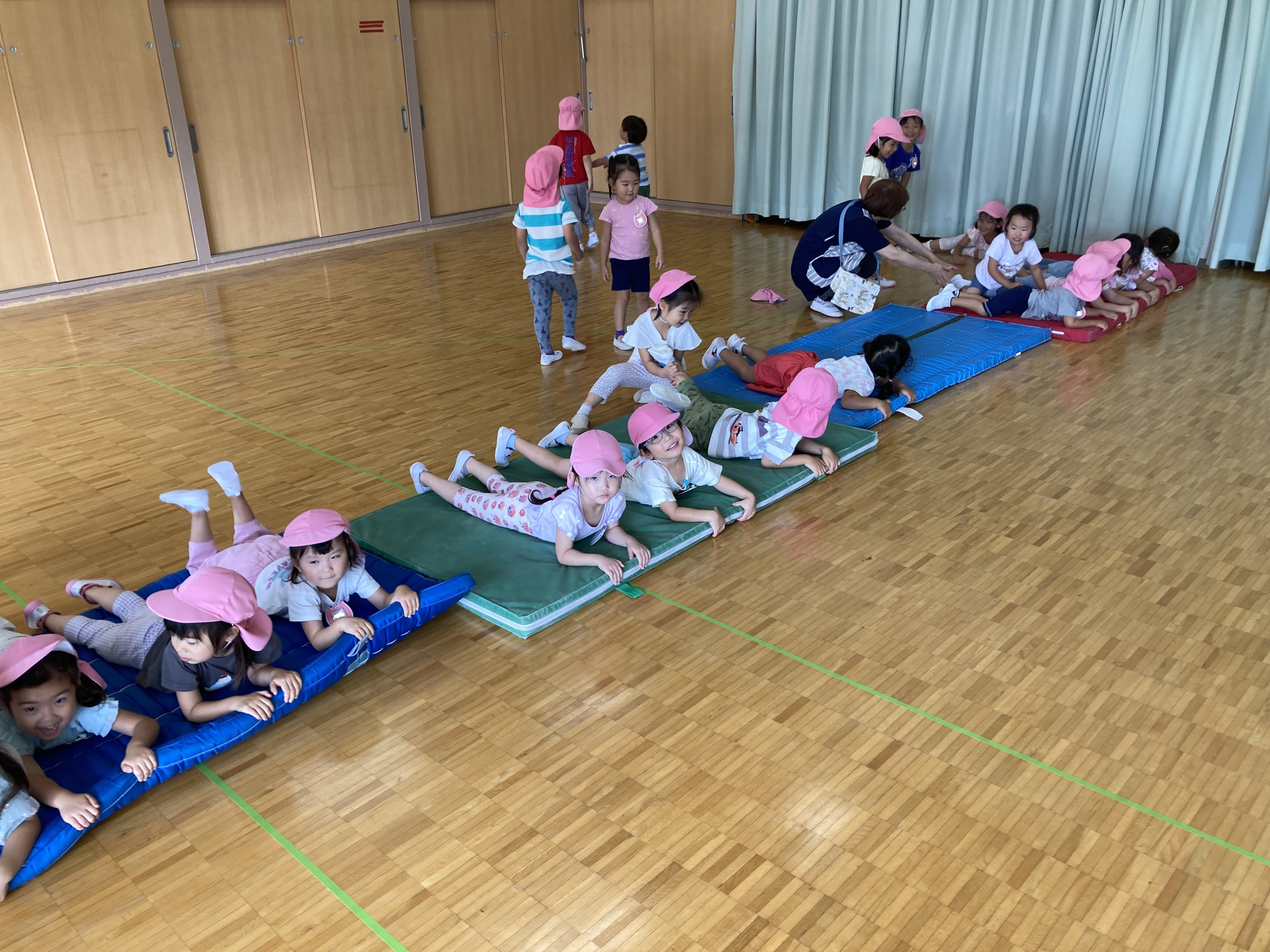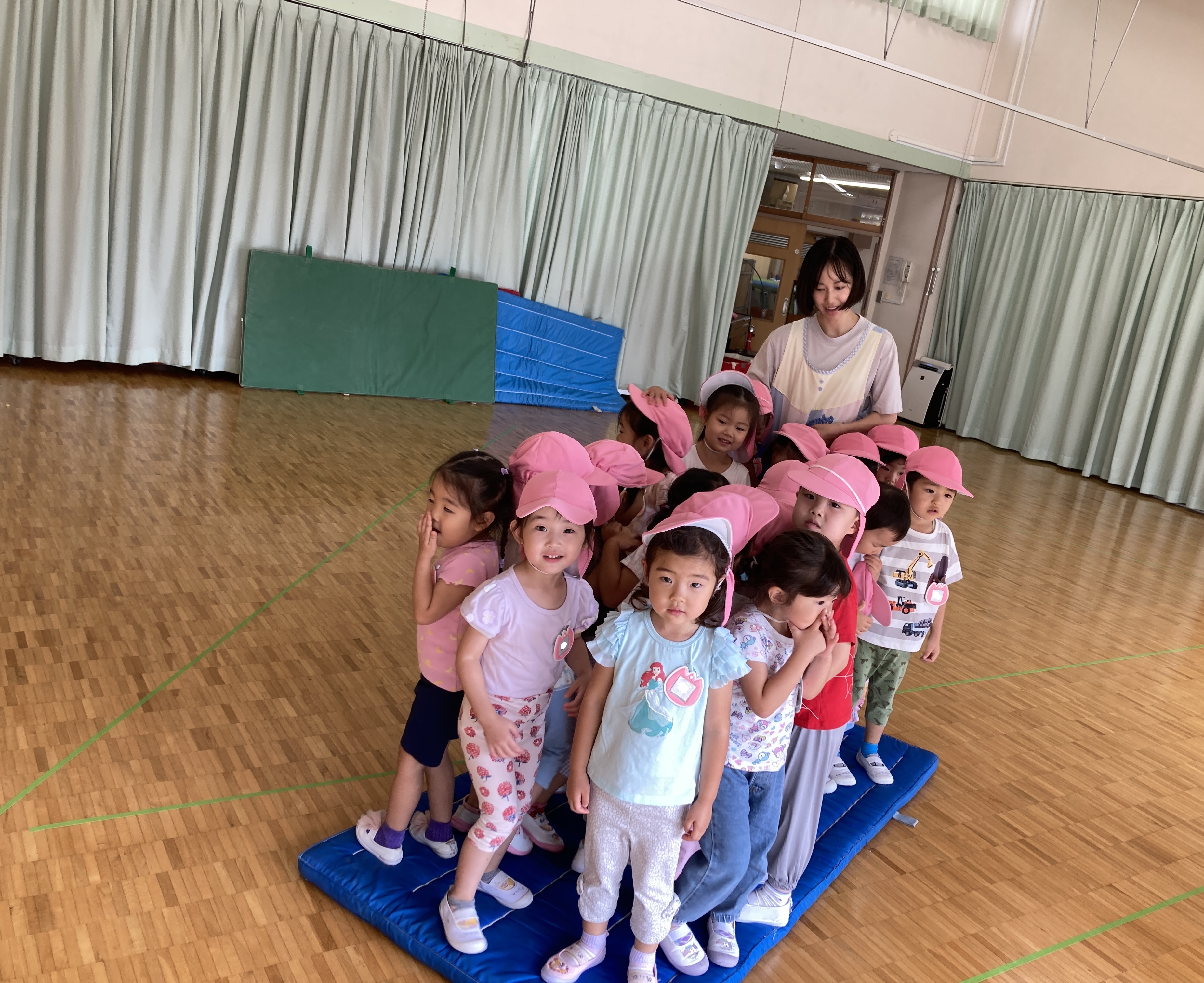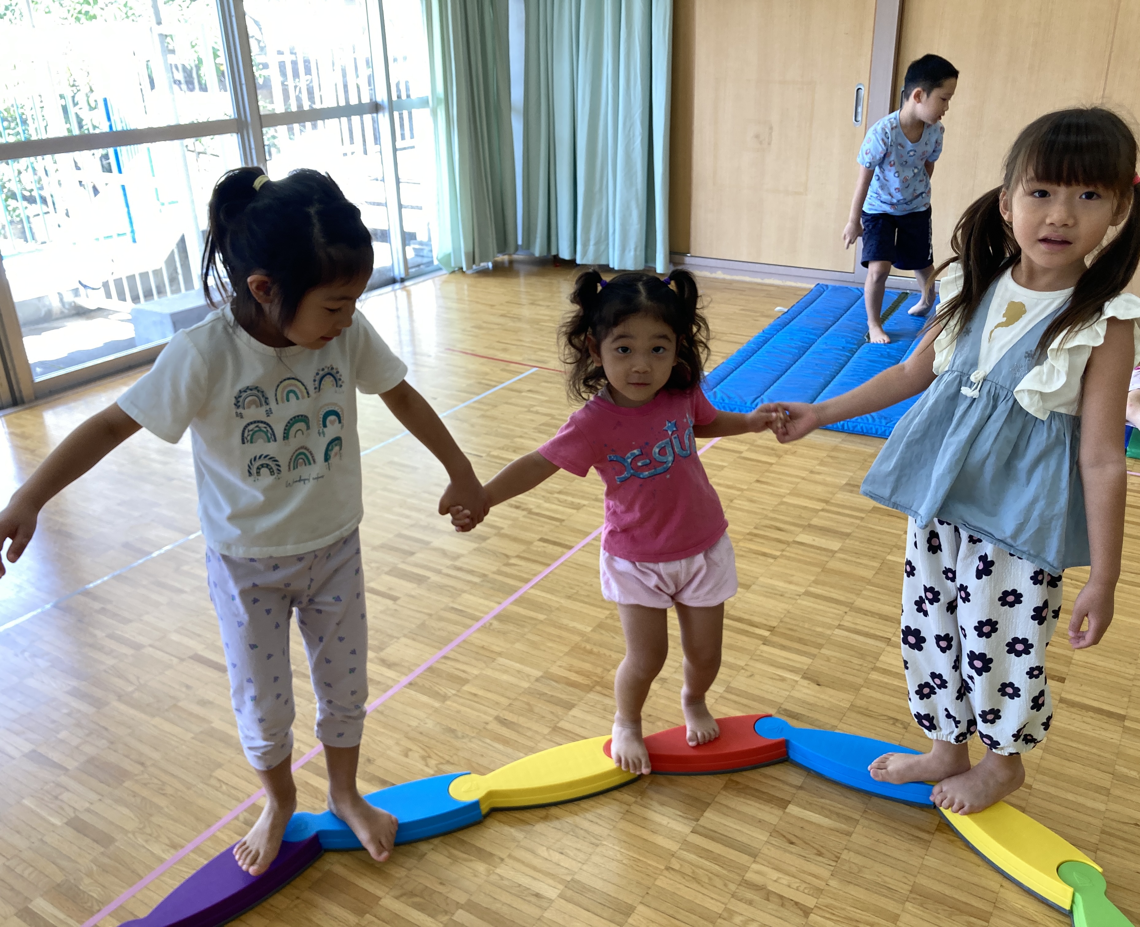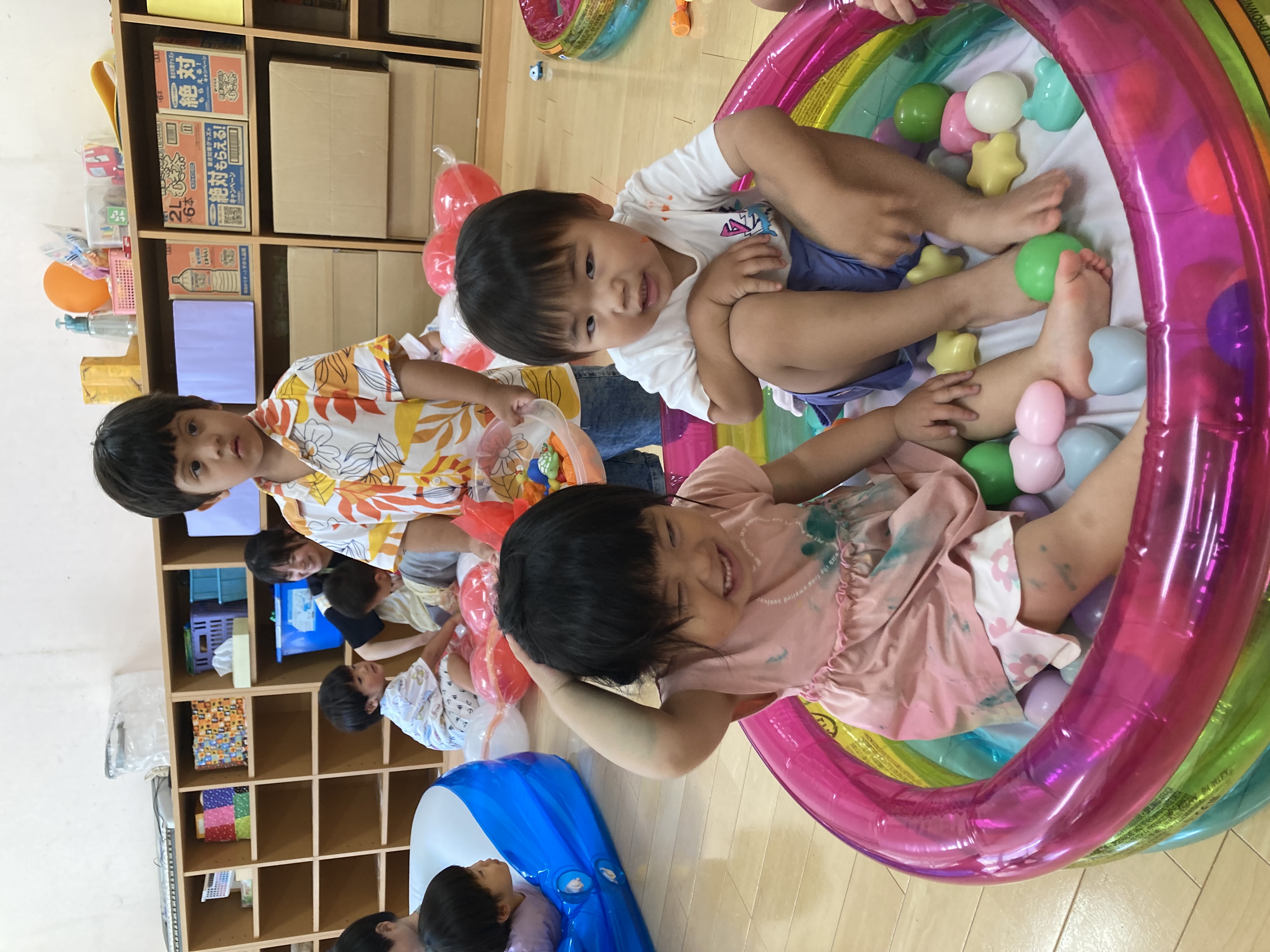 異年齢児での関わりも多く、一緒に手を繋いでお散歩に行ったり、お部屋で一緒に過ごしたり、幼児は定期的に3クラスでミックスして、ゲームをしたり、ホールでお楽しみをしています!