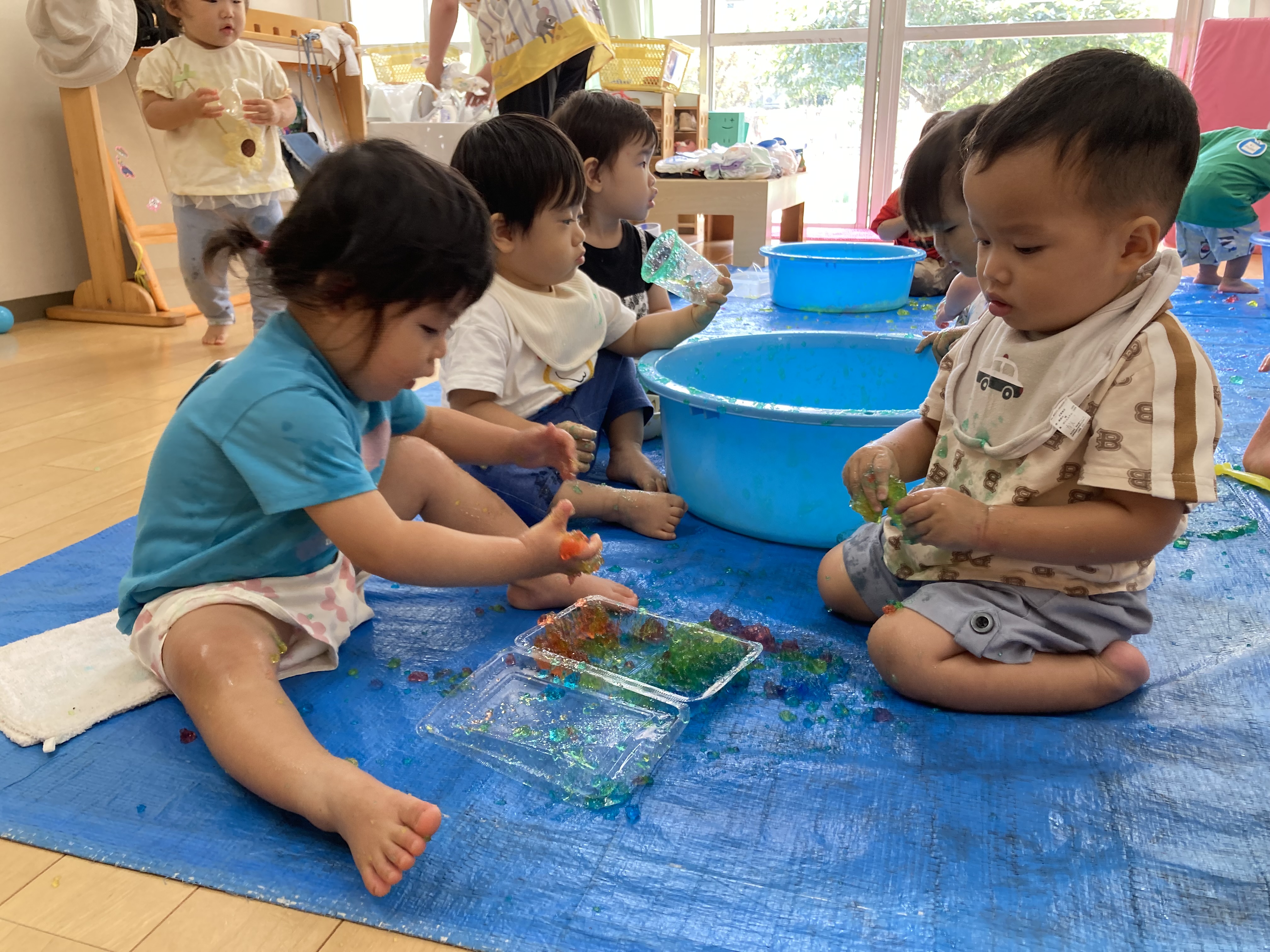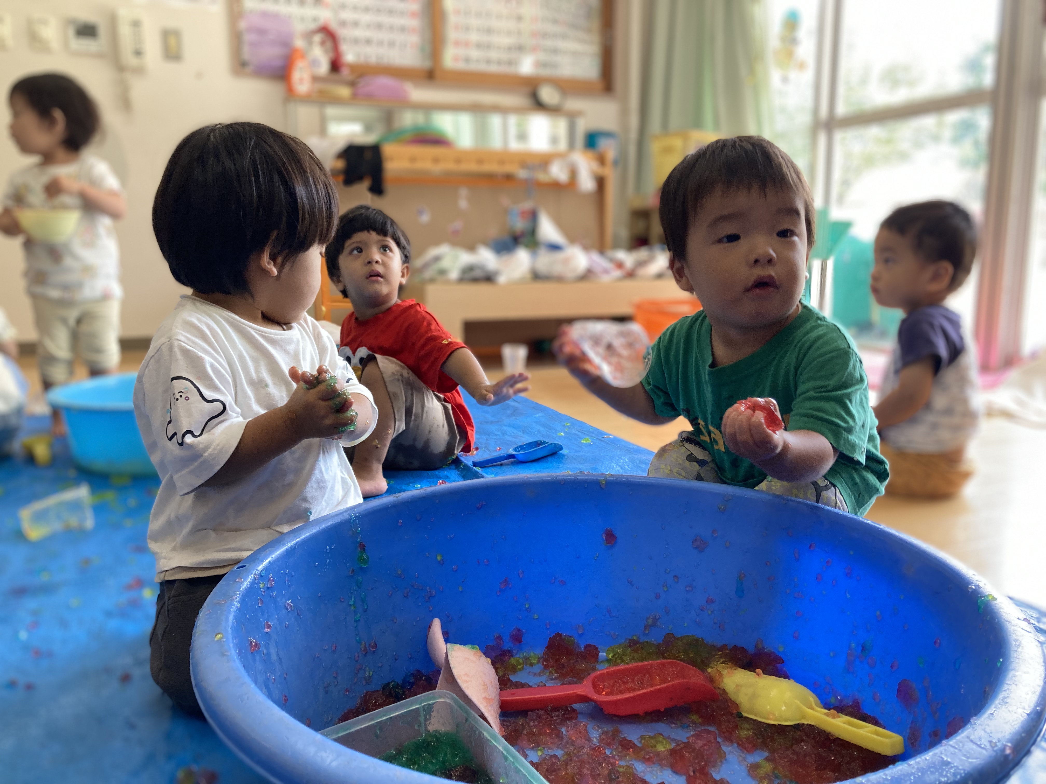 4月に入園した1歳児クラスのお友達もこの半年間で経験した事も多く、泥水遊び・寒天あそび・ボールプール・・・保育園生活にも慣れて、楽しんでいます!