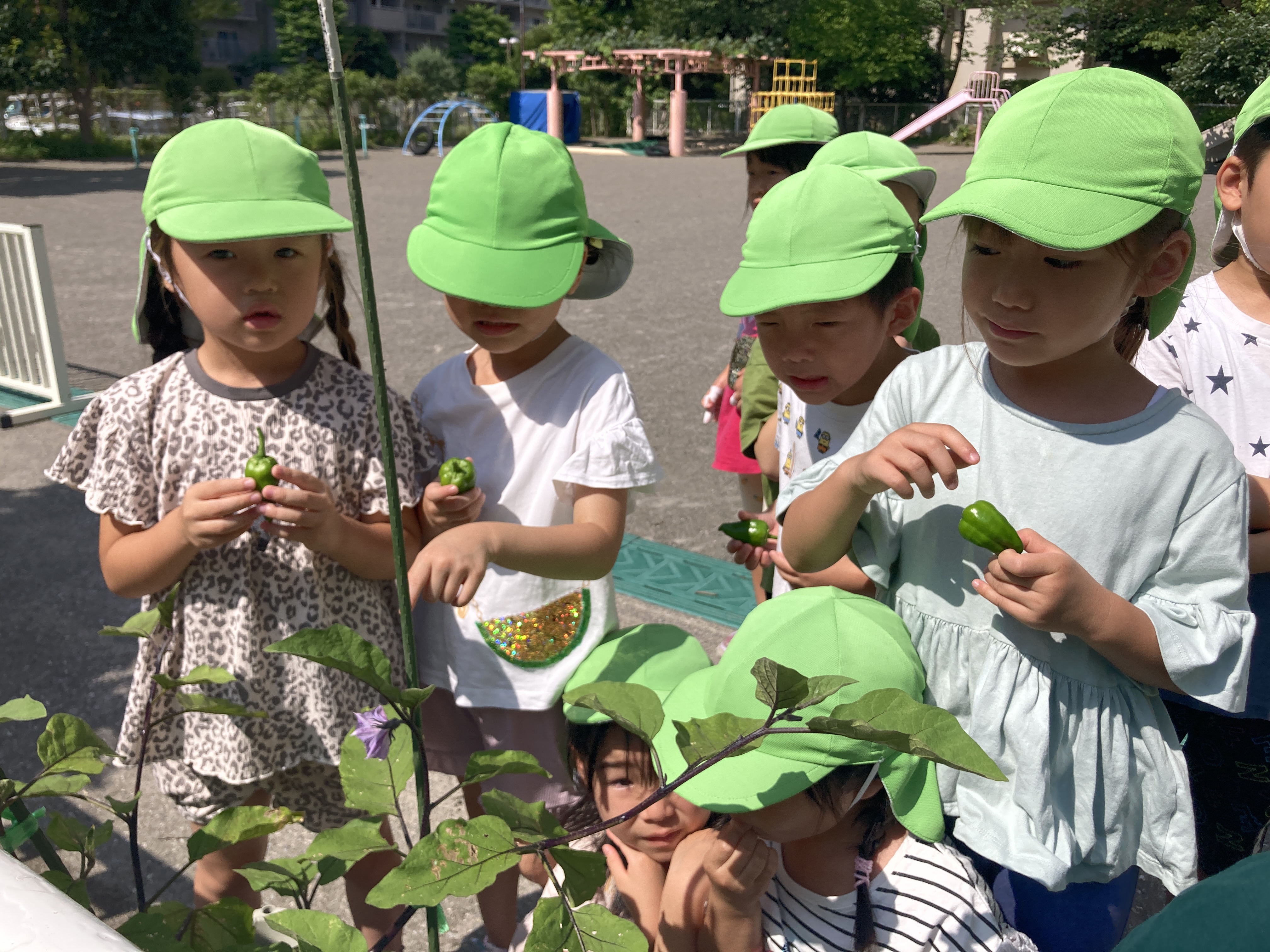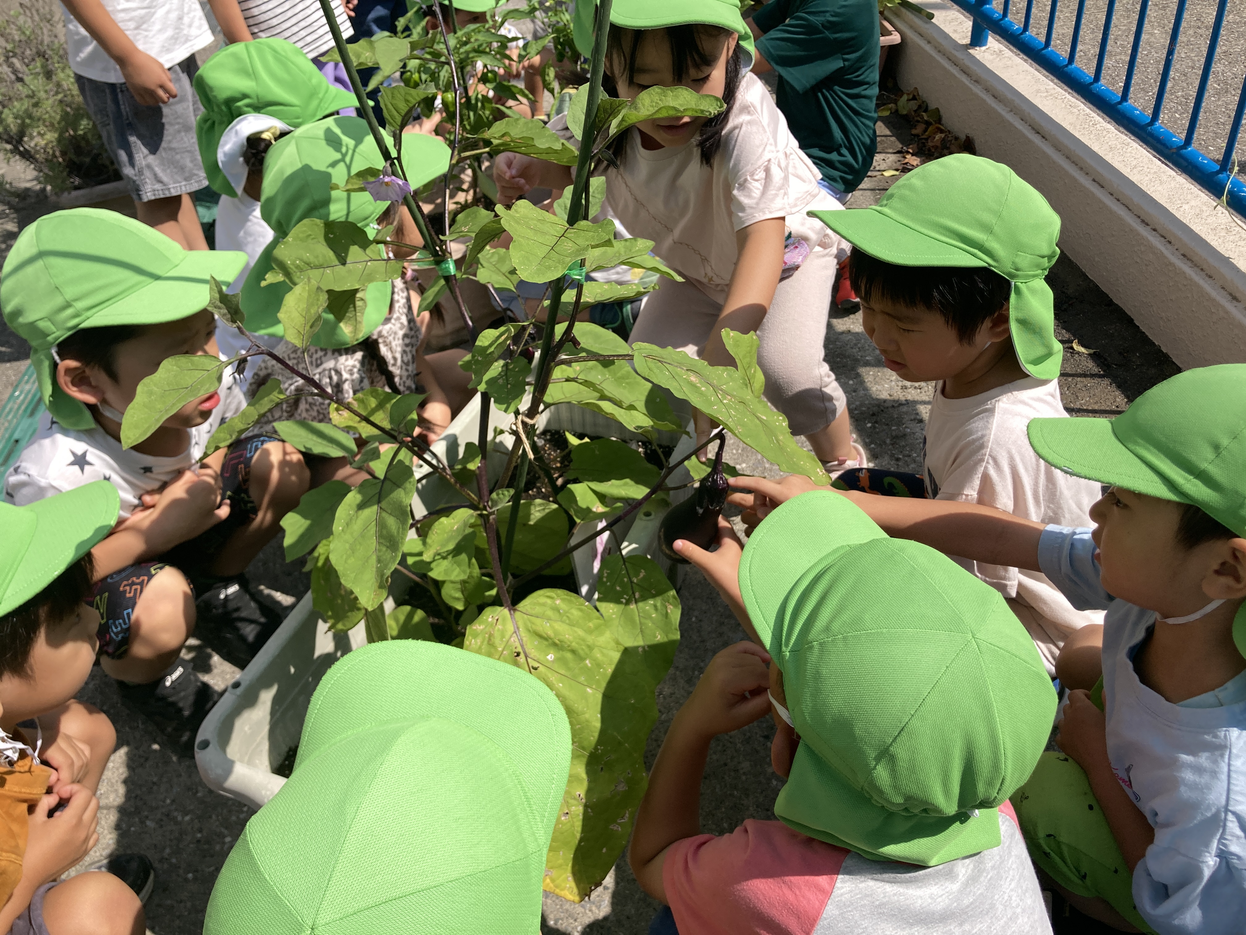 食育も多く取り入れており、夏野菜を育てて、収穫した野菜を給食やおやつで食べる事もあります。「これが育てたナスだね」「おいしいね」と、苦手な子も自分で育てた事が嬉しかったようで、食べる事が出来ていました!