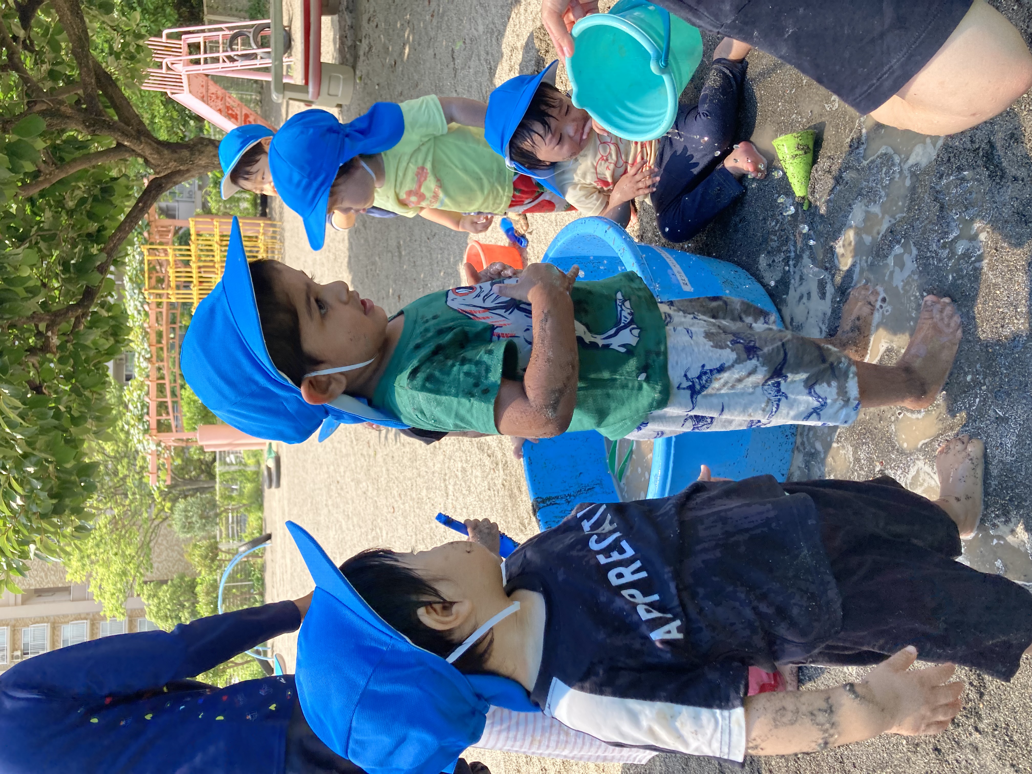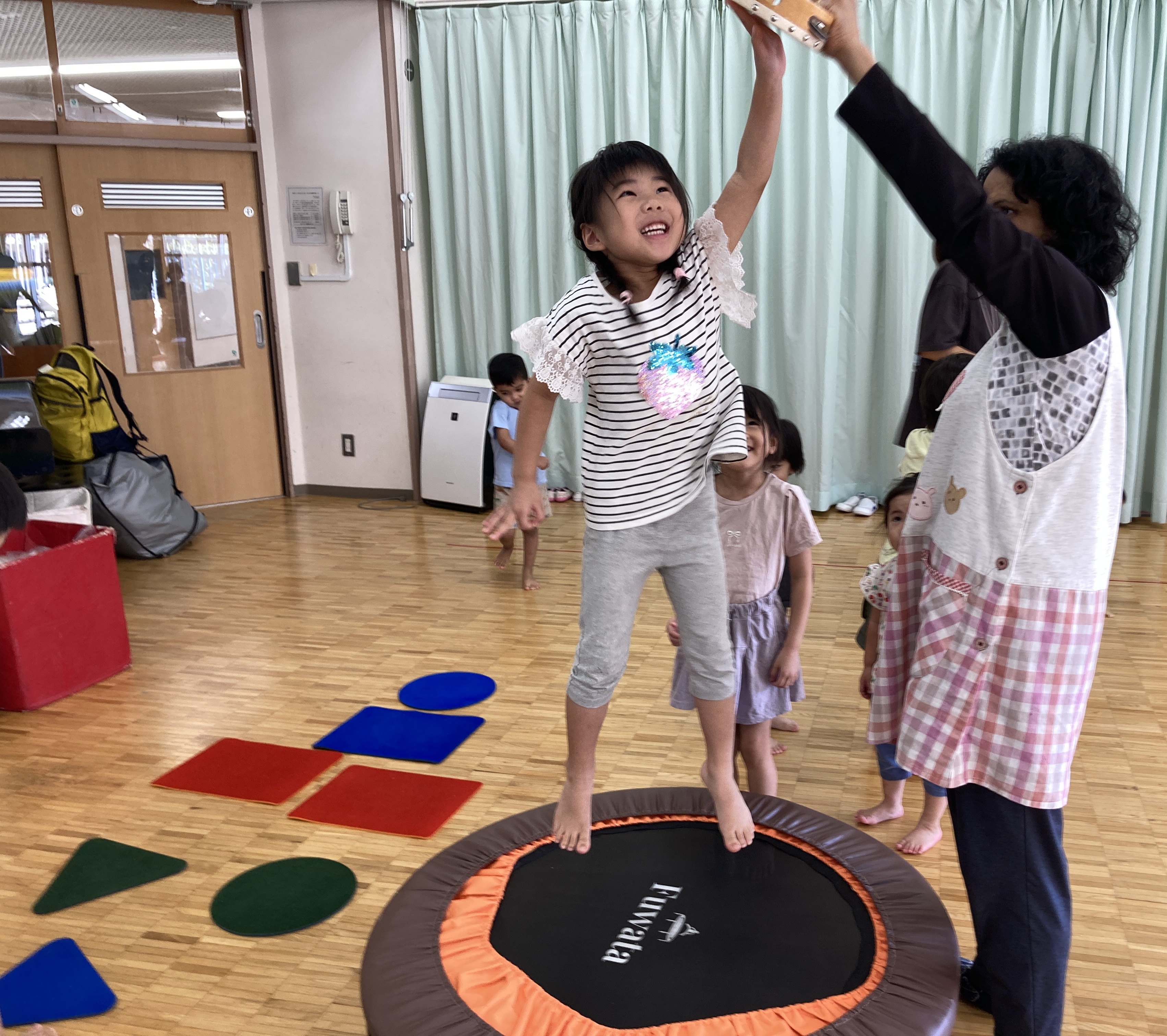 先週、紹介させて頂いた園庭やオープンスペースでは、乗り物に乗ったり、大玉遊びをしたり、トランポリンや巧技台遊びを楽しんでいます。