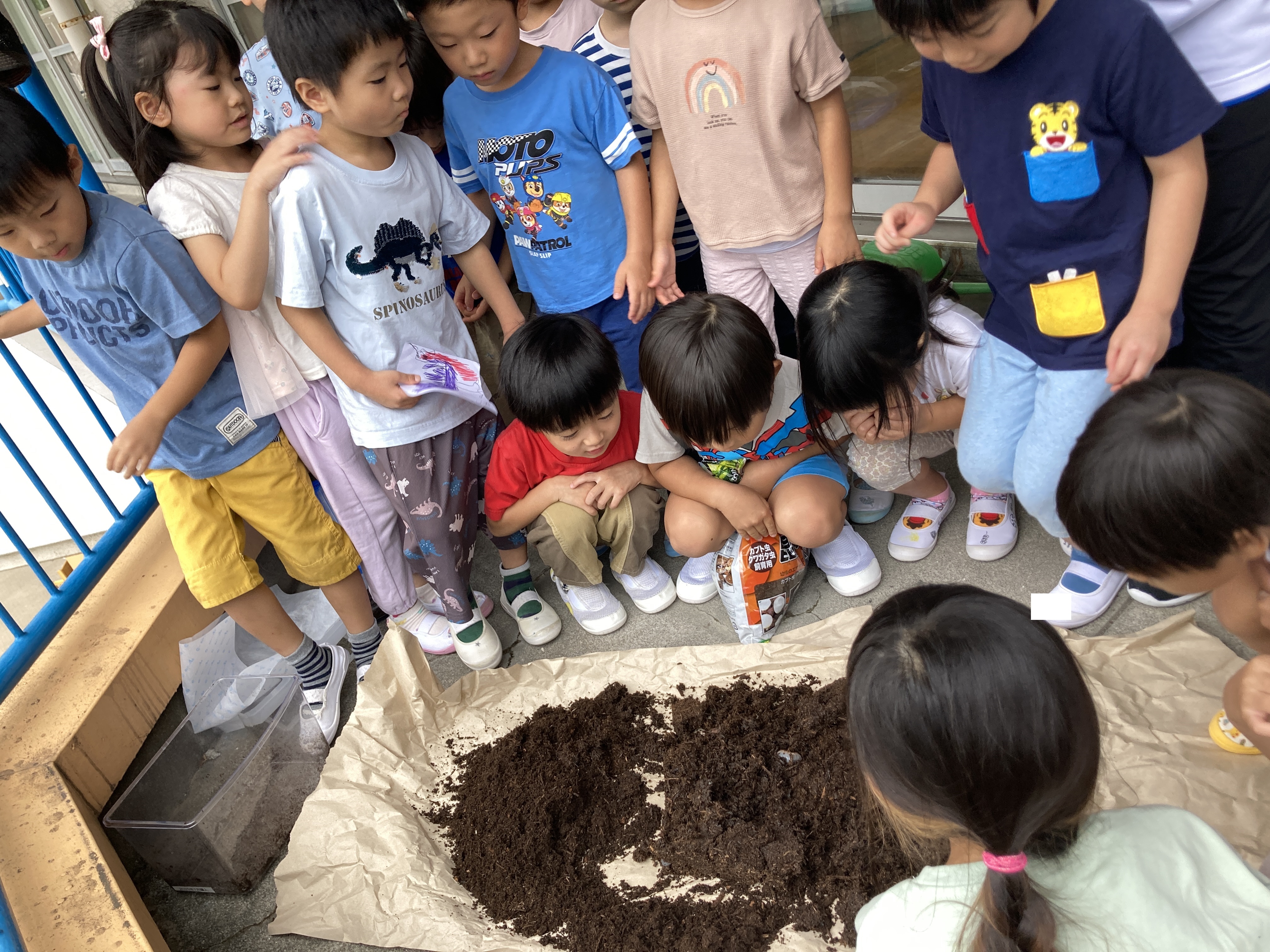 子ども達とが「まだ寝ているのかな?」「まった!いるかどうか見たいよね」との会話が聞こえてきたので保育士が「見て見ようか?」と声を掛けると「そろそろだね」と興奮しながら目を輝かせながら土の交換をしてみました。