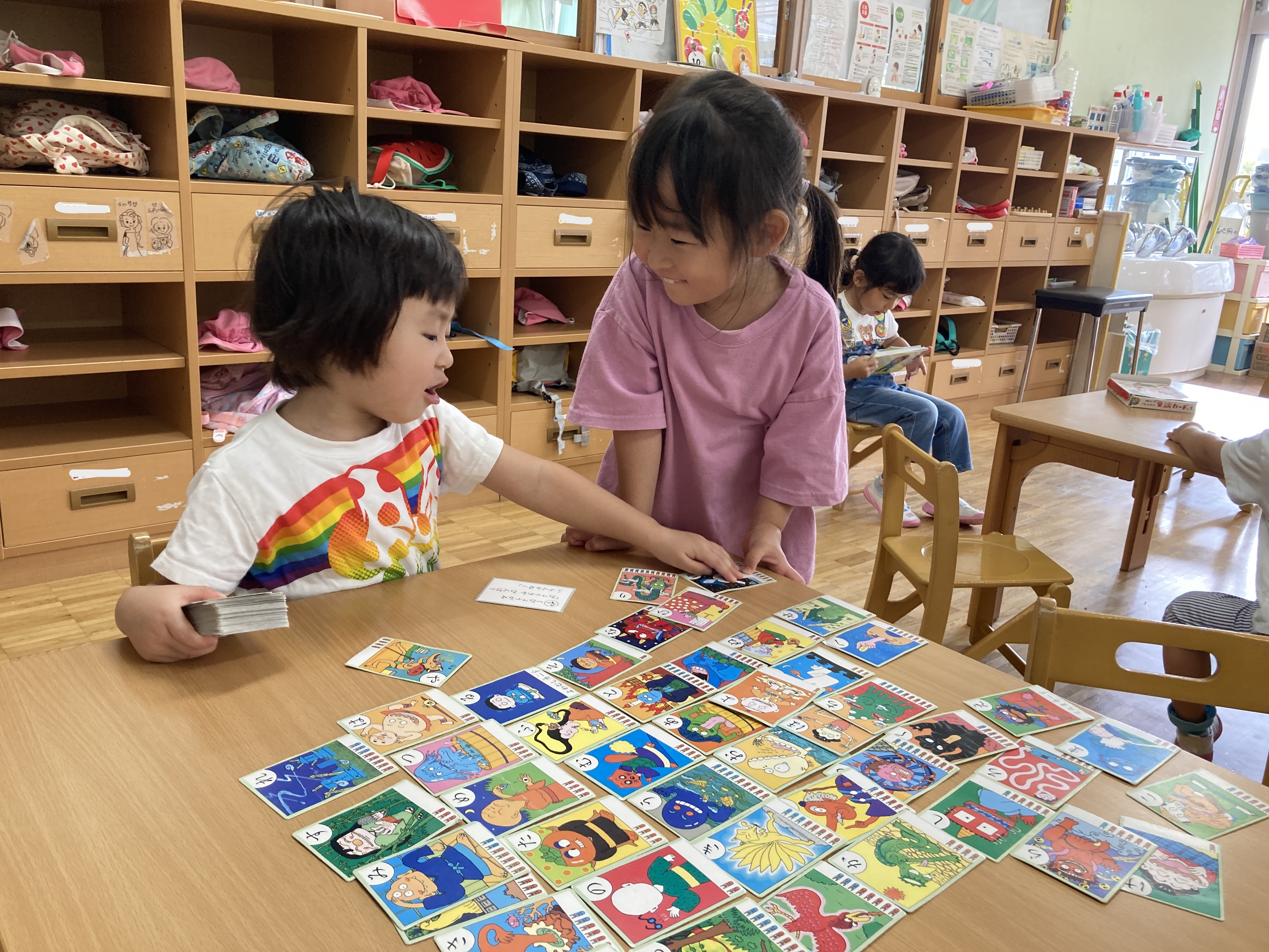 3歳児クラスでは、カルタをやる事も増え、取る時には「はい!」と大きな声で言ったり、真剣な表情で白熱しています。子ども達だけで行う事もあり、読み札ではなく絵札を見て「○○が笑っています」と、読み手が言っていて可愛かったです。