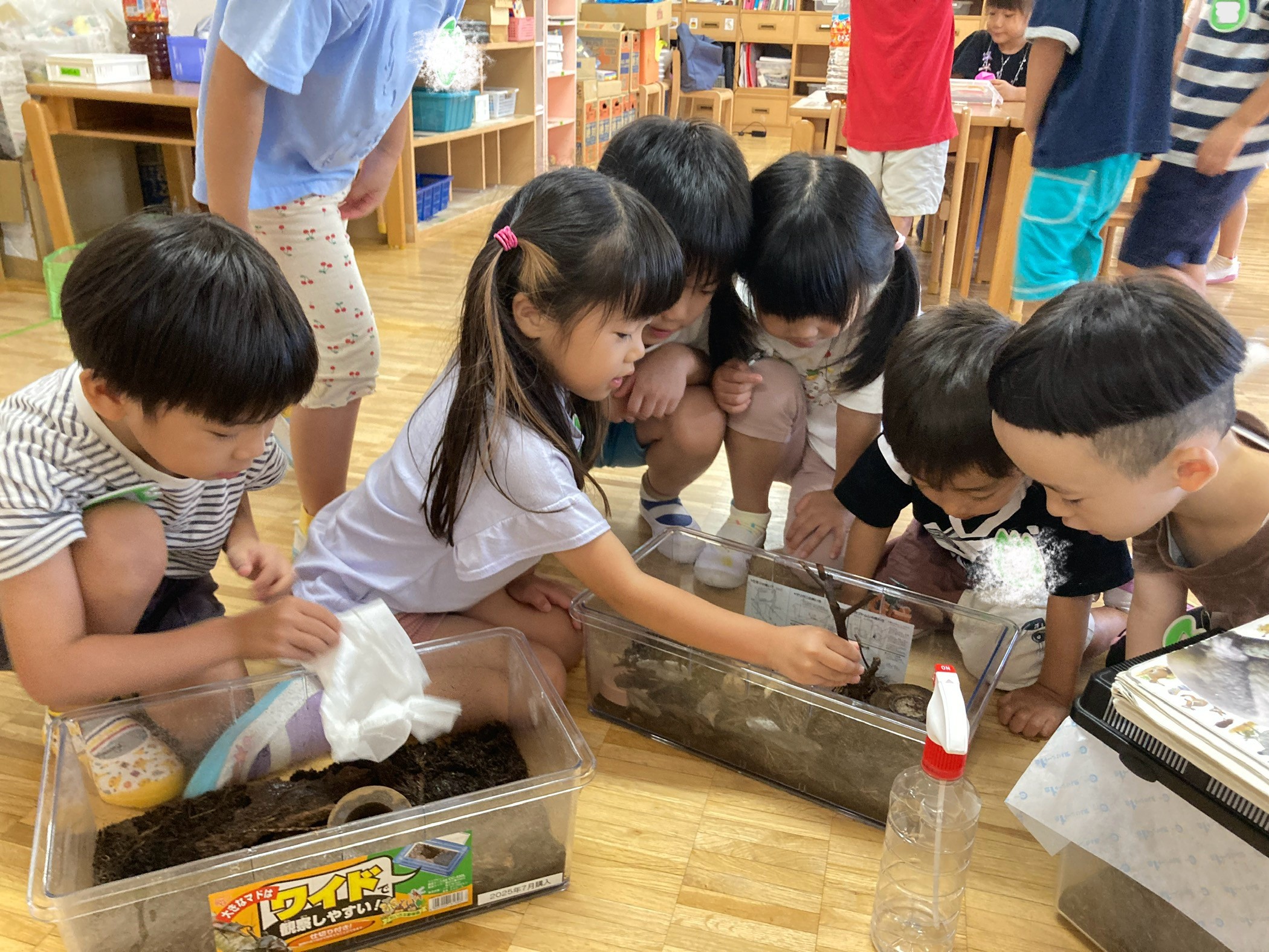 クワガタやカブトムシの世話をしている際に「これはおしっこだからきれいにしないとなんだ」「なんで?」との会話やえさをあげている時に「きっとおおきくなっているから、私たちと同じだと思う」「いっぱい食べて」等と思いやりの気持ちの言葉にほっこりしました。