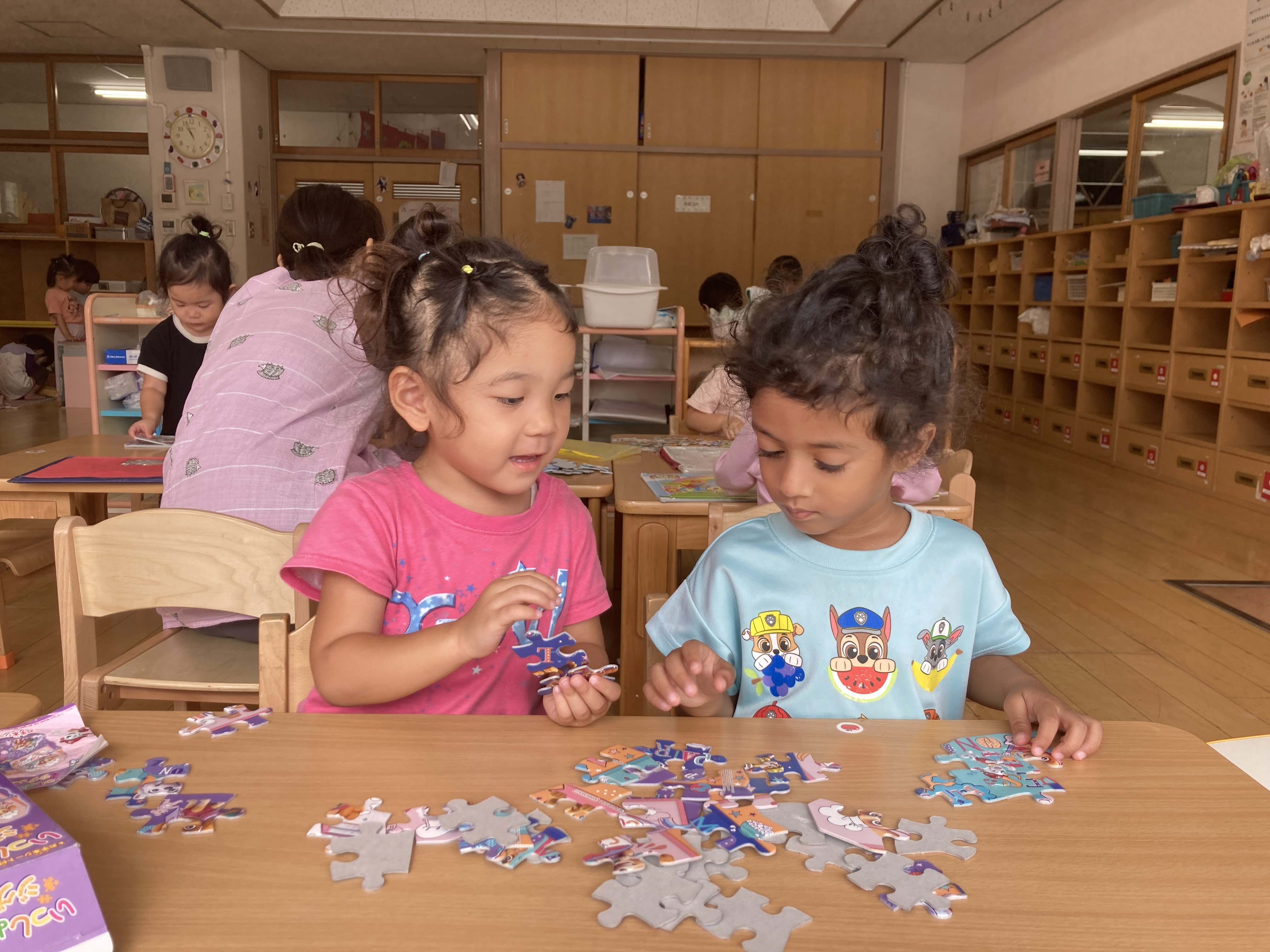 言葉が増えて、やりとりを楽しむ2歳児クラス。パズルをしながら「オッケー」、掃除をしながら「クリーンアップ」とお友だちに対して自然とやり取りが出来るようになっています。
